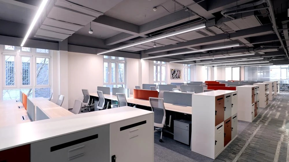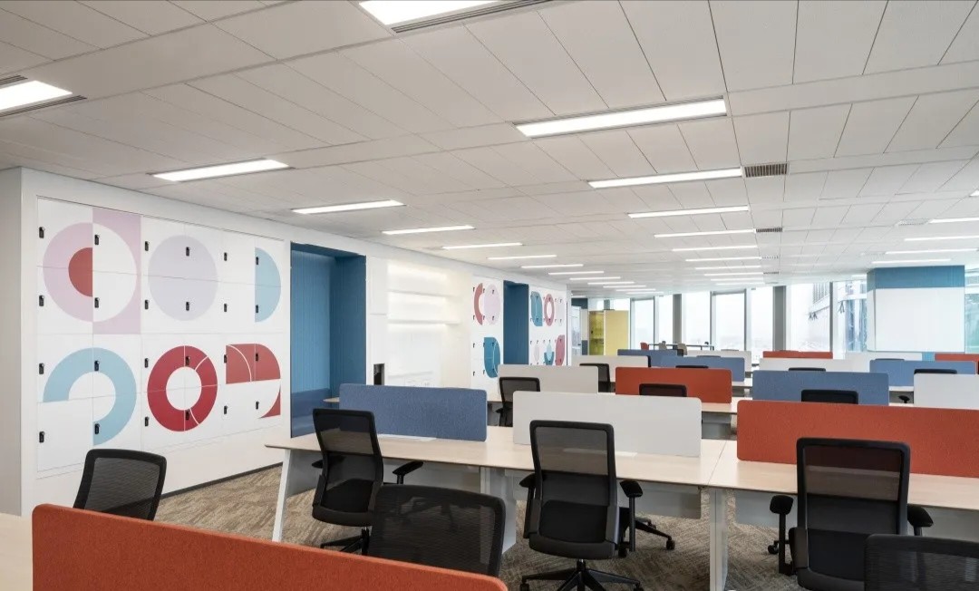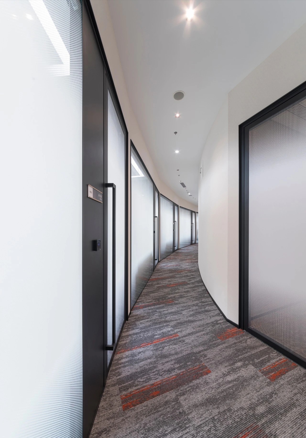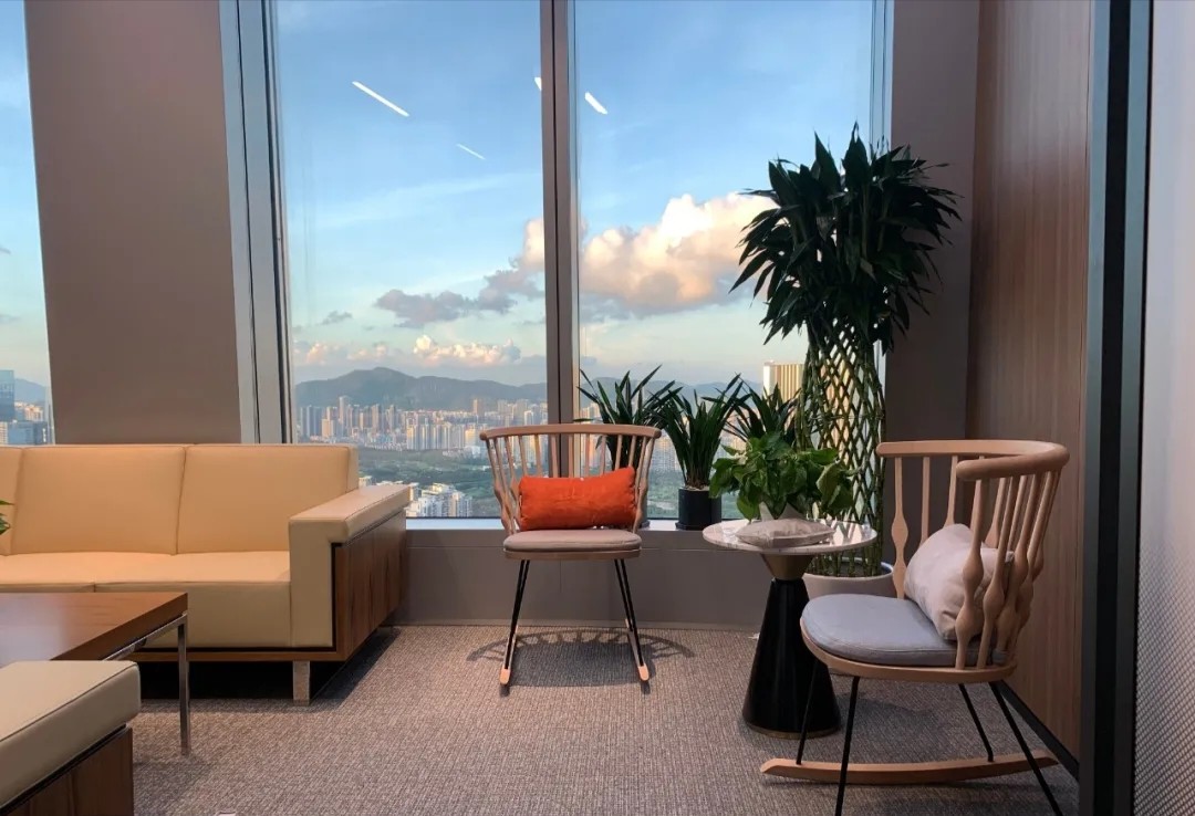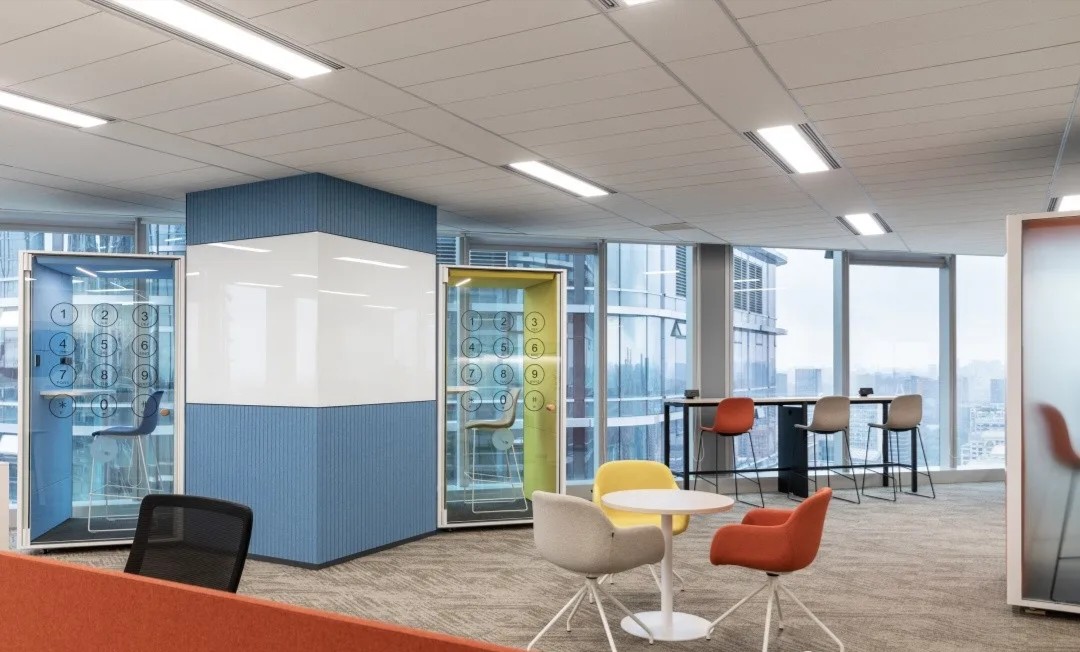 开放式办公空间结合休闲洽谈,独立电话间,将不同的办公场景融入其中,使空间的功能多样化,起到提升空间高效性和协作性。丰富的色彩搭配,虽是多种色彩但莫兰迪色系独有的灰调融入其中,让空间色彩更和谐,使空间具有活跃但不喧闹的视觉感受。利用隔墙走道空间,配合办公协作需求,将功能设施集合为整体有关联及有延续性的设计在办公区中,便于提升空间协作性。并提升中金财富logo的圆形设计元素,将图形与原本纯白色的Locker相结合,在单一的功能区加注了活跃性和趣味性,提升办公的视觉舒适感。