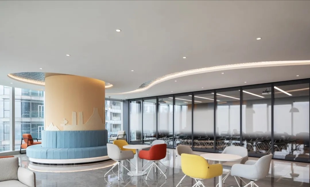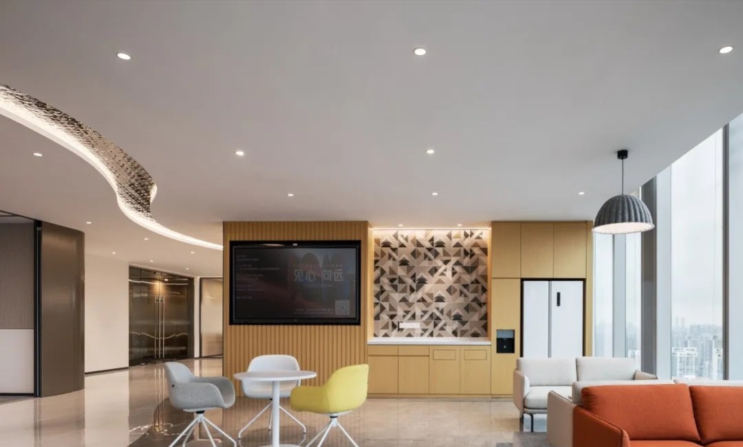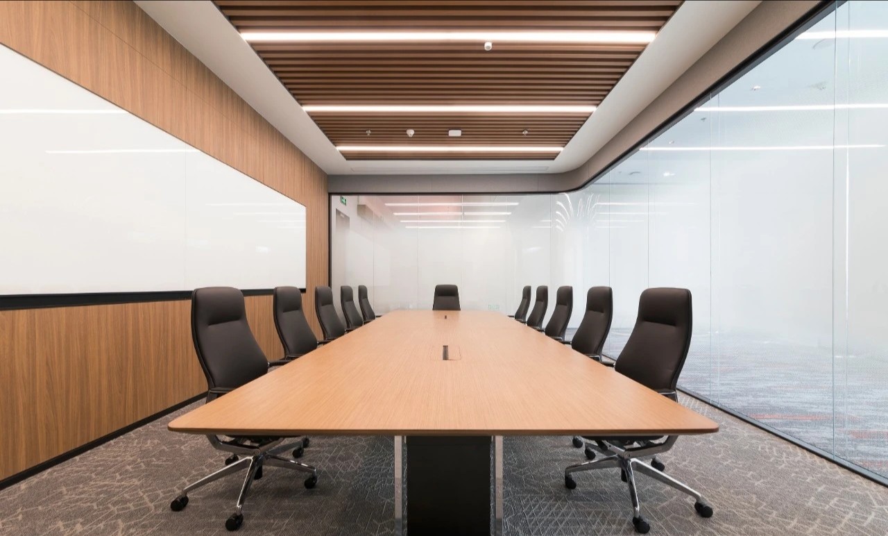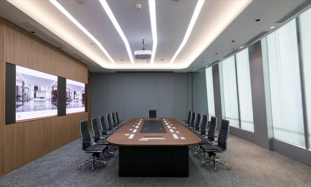 会议室更需一个综合多种灯光效果的照明系统来营造清透明澈的空间氛围,浅咖作为主要用色与营业厅内外呼应,更体现出企业干净舒适的议会环境。