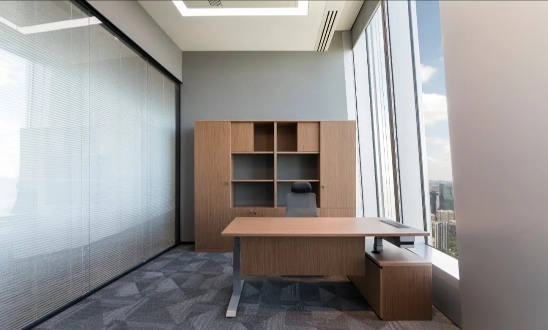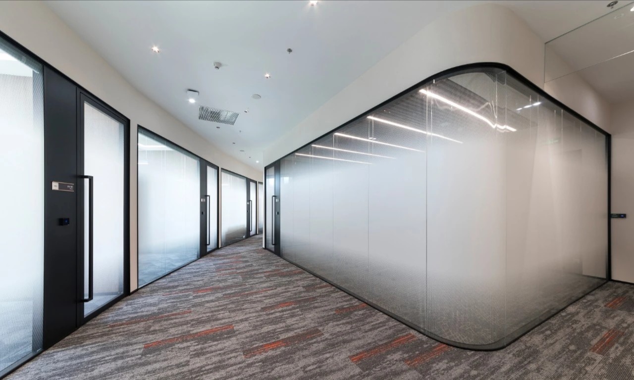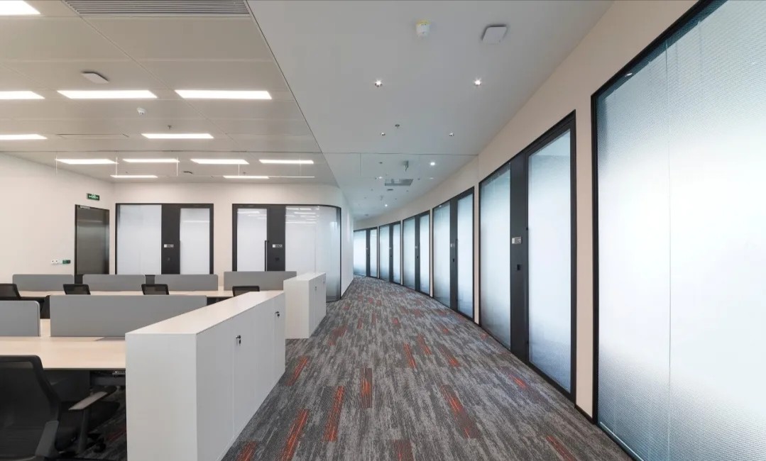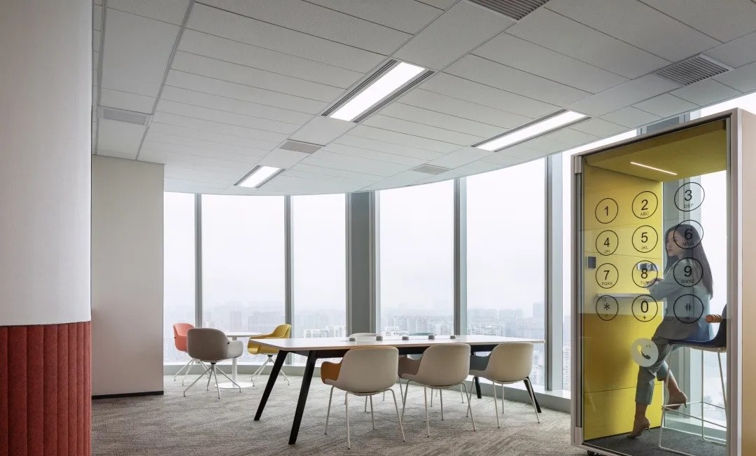 会议室更需一个综合多种灯光效果的照明系统来营造清透明澈的空间氛围,浅咖作为主要用色与营业厅内外呼应,更体现出企业干净舒适的议会环境。