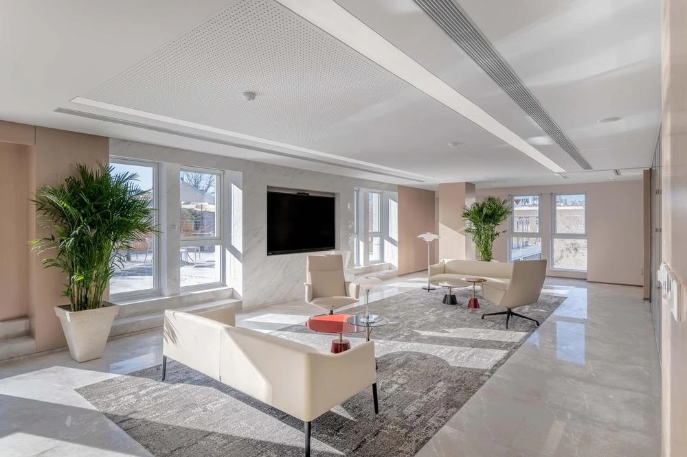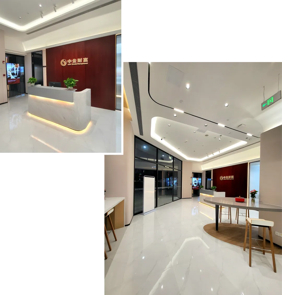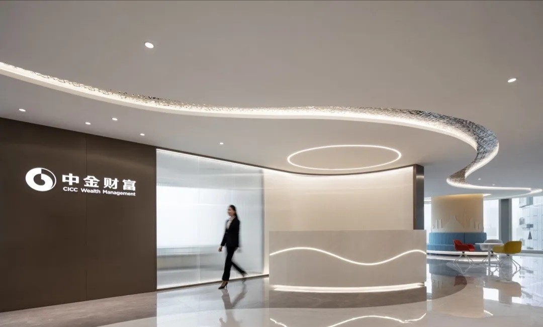 前台设计简洁明快,映入眼帘的暗红色背景墙与干净明丽的亮金LOGO对比鲜明,充分展现专业可靠的企业形象。色温、明度不一的灯光照明系统各司其职、有虚有实,将前台从整个营业厅中衬托出来,同时与接待大厅界限分明。多功能接待厅以浅咖色奠定明净羲和的主基调,红色的嵌入为空间添加了一丝热烈与奔放,让本就清朗的环境显得朝气明快、灵活舒适;弧形木质地板划分洽谈区与活动区,为空间增添几分动感,更让整个接待厅多了几分郁郁青葱,将人从高楼林立的都市中拉回自然边界,绿茵忽生、简洁灵动,凸显出另一种风度。填单台上下承接设计得十分巧妙,承重柱顶端四面平缓的过渡处理在灯带的加持下如叶片一般延展,柱旁连接台桌营造树下问学的氛围,极具时尚感、科技感、几何美和动态美。