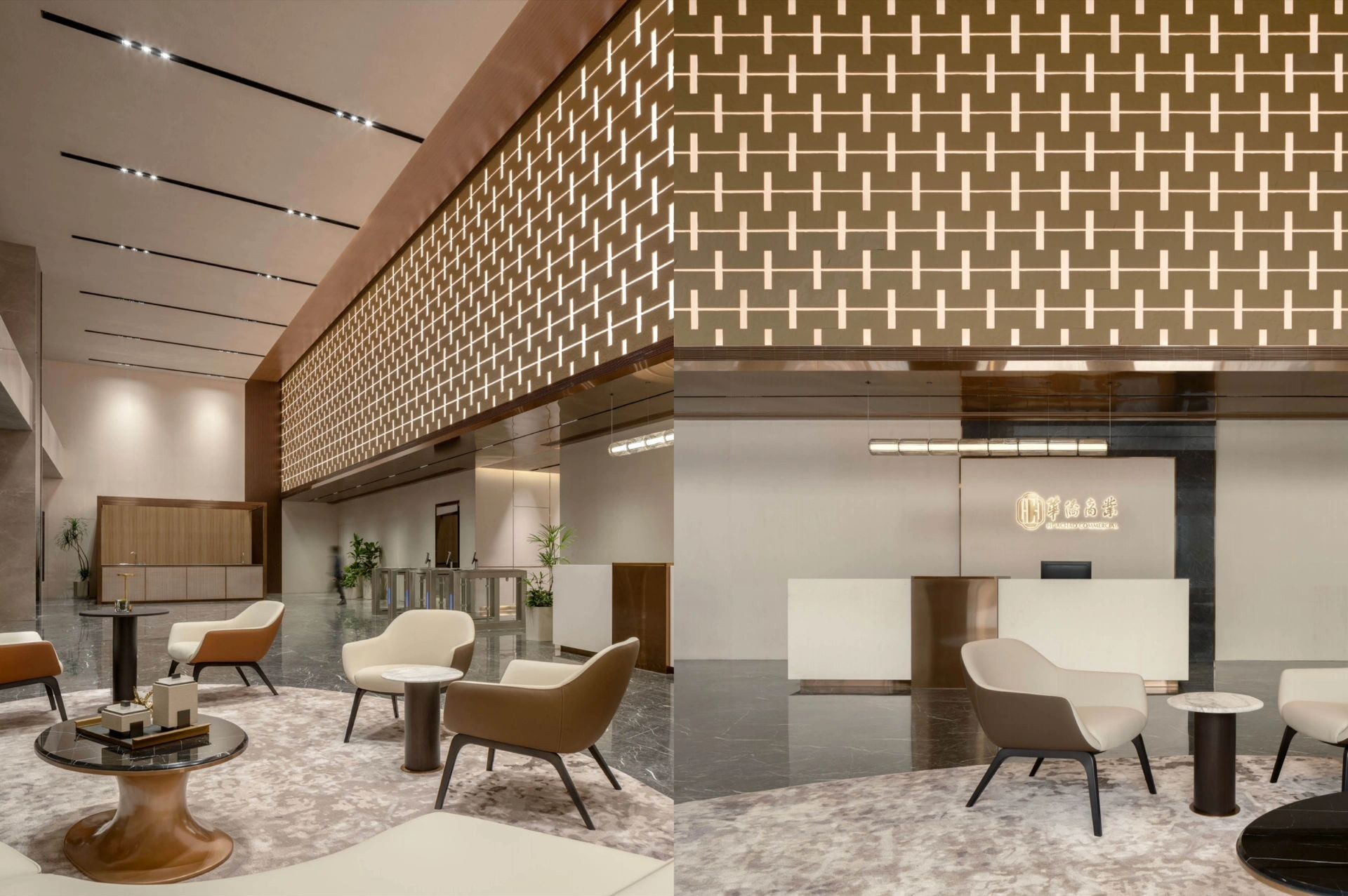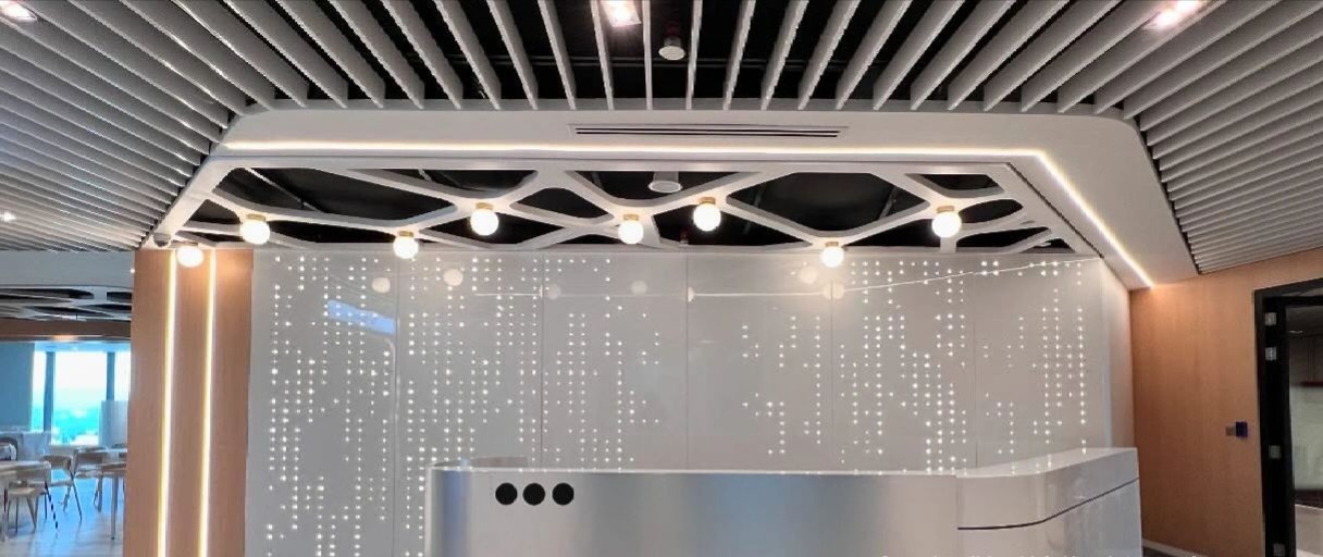 公司前台冲孔铝单板背景墙过道铝方通吊顶