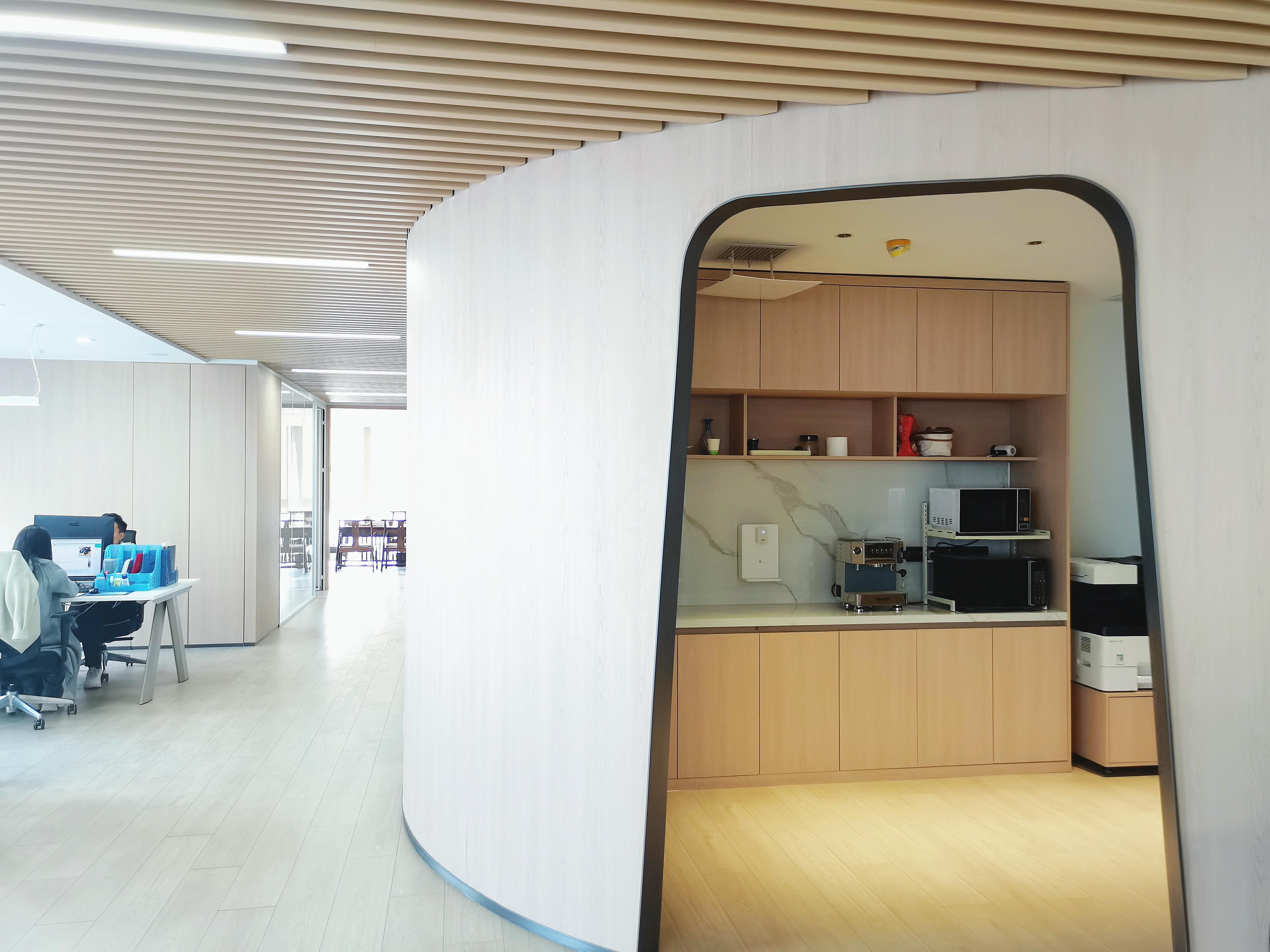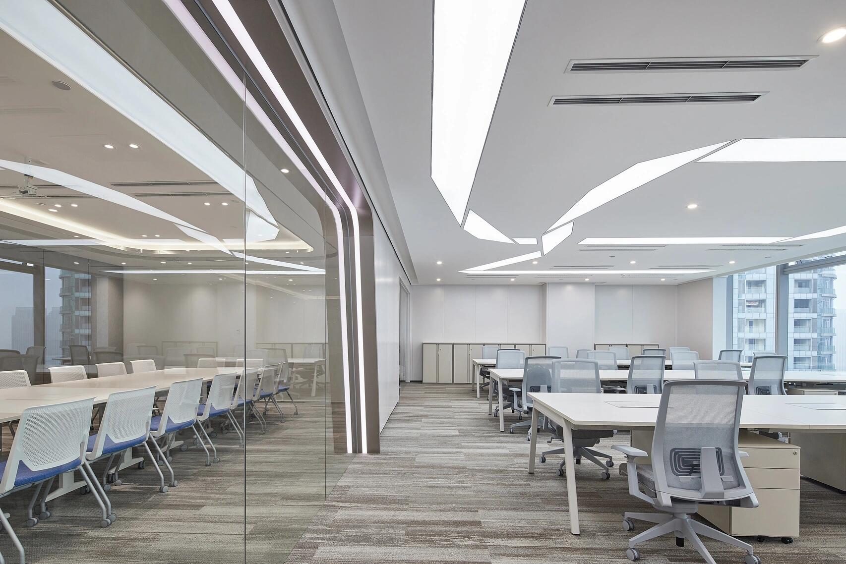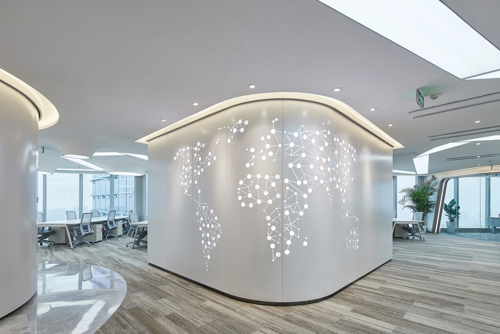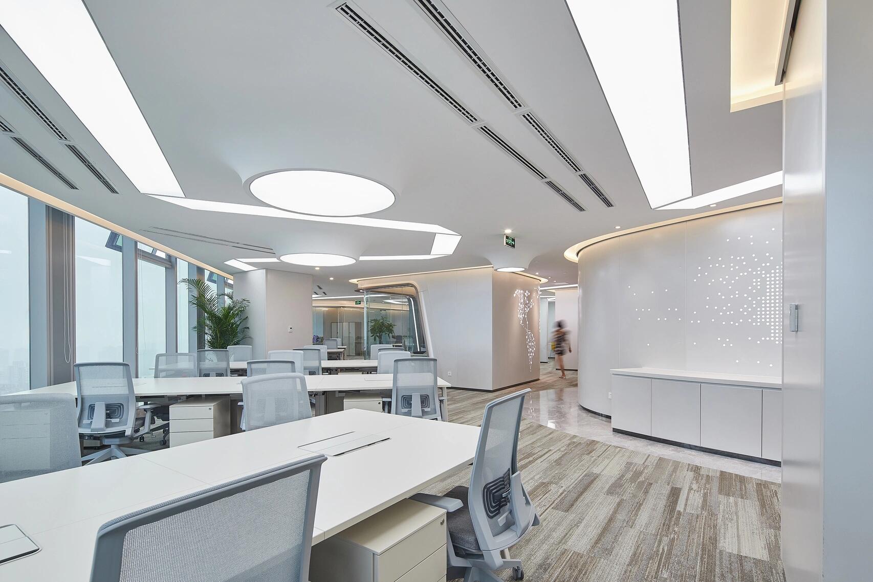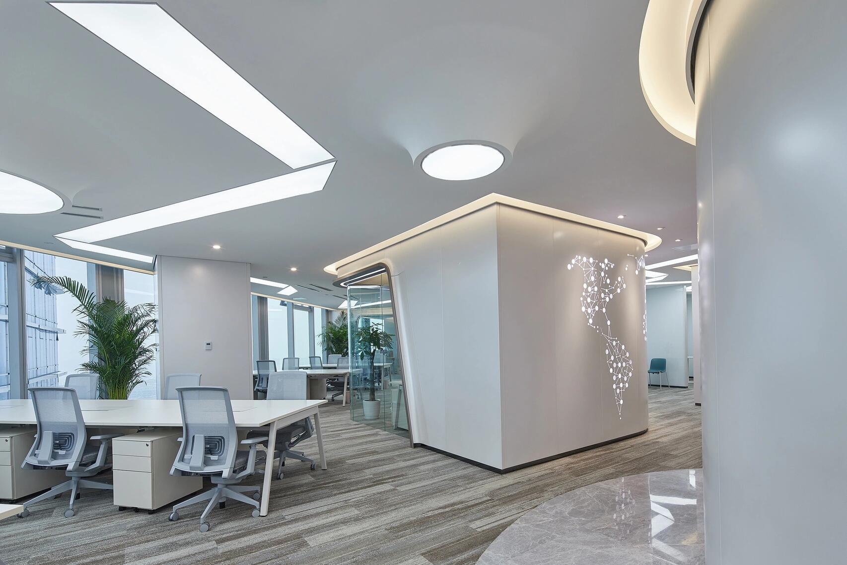 会议室及办公室外面的香槟色铝板与银色铝板搭配构成的弧形双曲金属板造型好似飞船太空舱的一部分;天花上的下凸造型好似星球火山口,折纸概念的发光膜条带连贯着每个空间,一切都散发浓浓的星际与未来。墙面冲孔的点阵Starteos.io英文和圆孔+小条的世界地图再一次强调了科技公司的属性,流线型的墙体及光带,让思绪在数字空间飞翔。