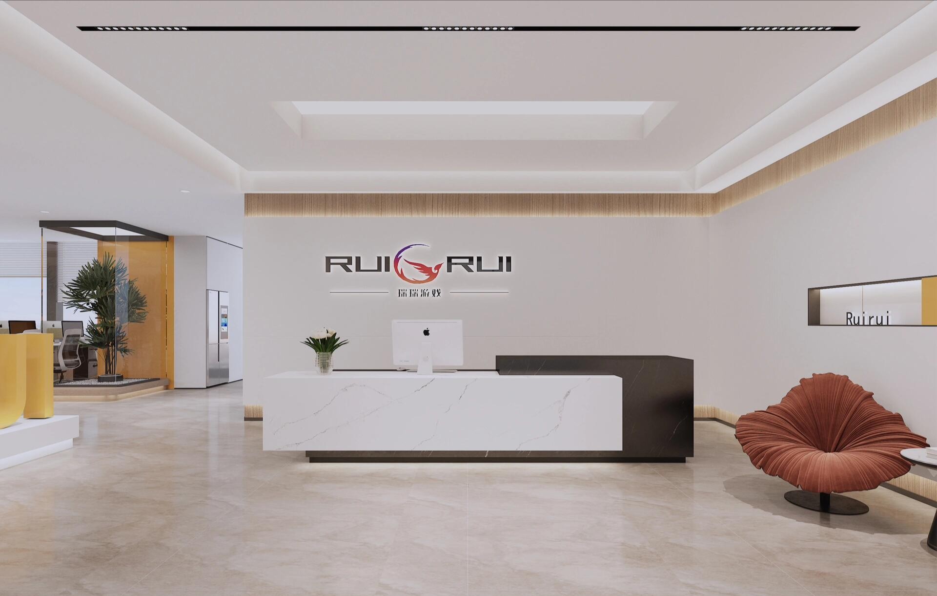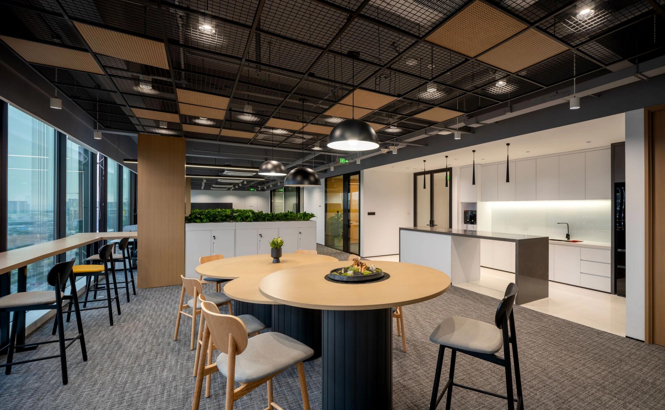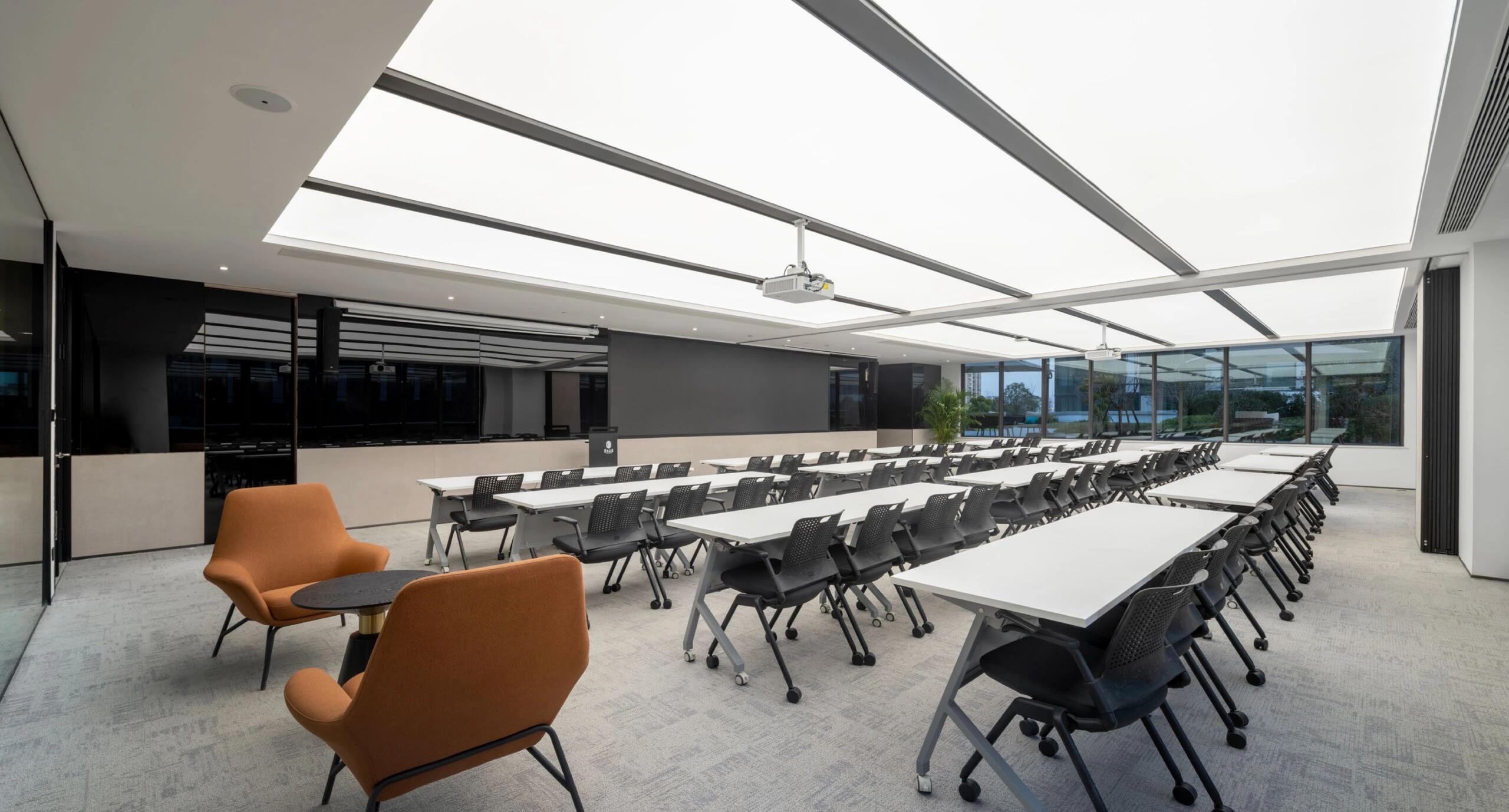 设计选取一些令人积极及明亮的颜色、绿植等元素,会令人在紧张工作氛围中得到一些放松,而本次案例中的橙色系则会达到这样的效果。除此之外,天花灯光的设计上,做造型灯膜,虽然成本上会比传统无吊顶刷黑增加,但是却让整体空间明亮且有张力。
