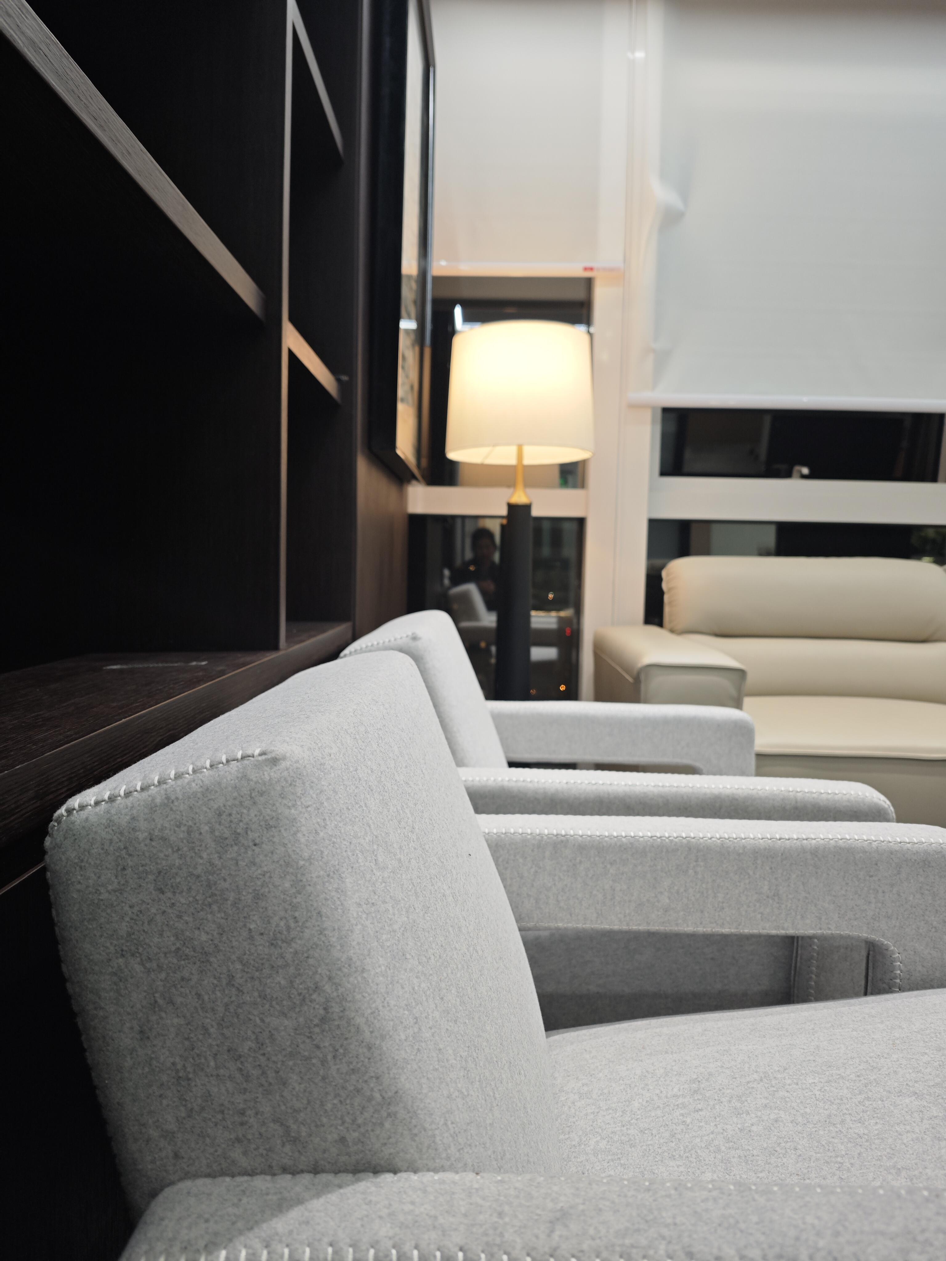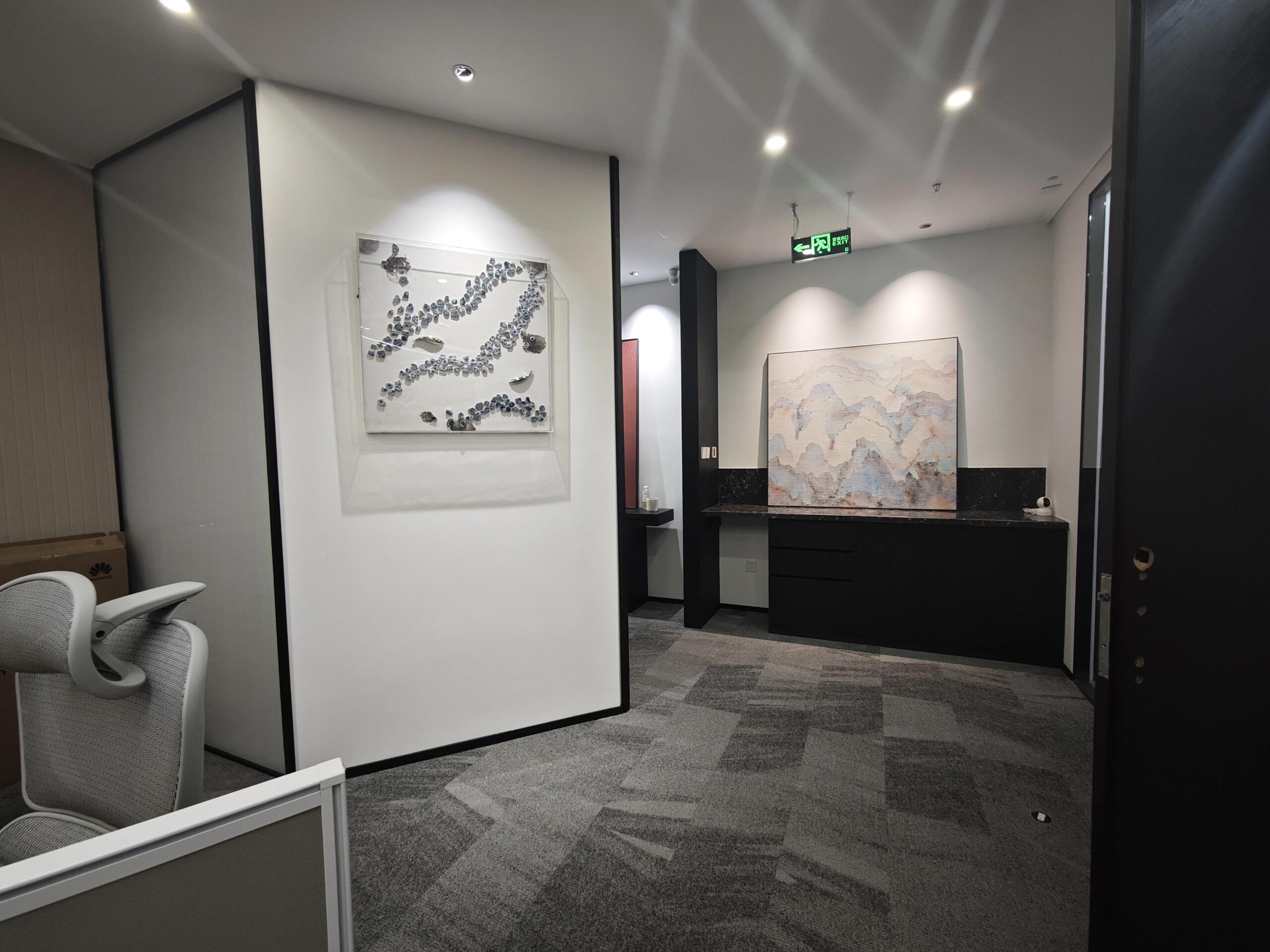 桌椅排列规整,方便参会人员就座与观看演示内容。前方设置大屏幕,满足会议展示需求。两侧墙面悬挂企业重要人物照片与荣誉证书,彰显企业实力与文化。 地面铺地毯,减少脚步声干扰。墙面采用吸音材料,提升声学效果。天花板的格栅吊顶搭配嵌入式灯具,营造简洁大气的空间感。整体色彩以中性色为主,营造沉稳专业氛围。