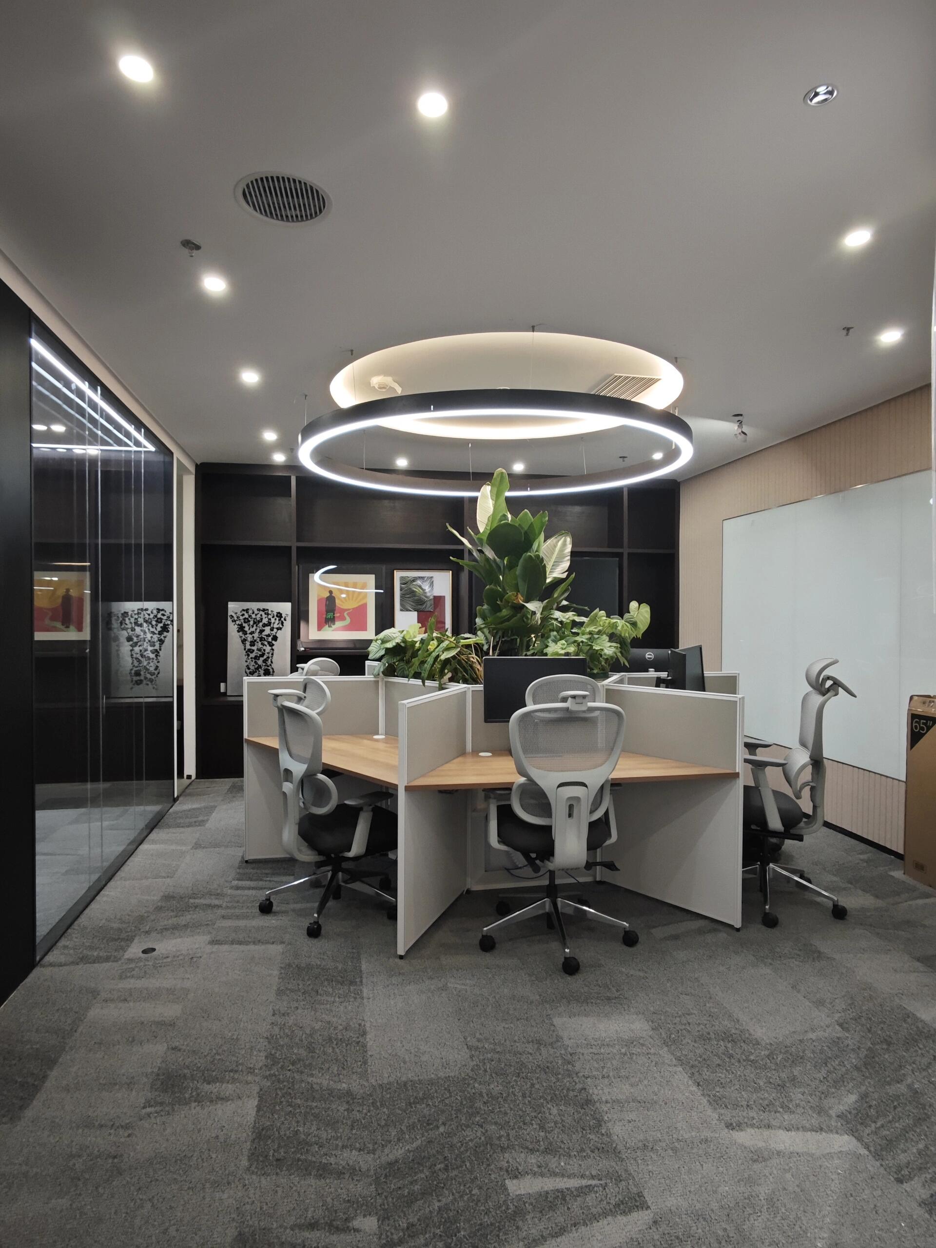采用开放式布局,工位整齐排列,方便员工交流协作。配备人体工学办公椅,可调节高度,提供良好支撑,减轻员工久坐疲劳。地面铺设的地毯,不仅吸音降噪,还能划分空间区域。 办公桌选用木质材料,自然温暖且质感强。墙面为白色,搭配浅木色装饰线条,简洁明亮。照明采用长条形吊灯,提供充足、均匀光线,满足工作照明需求。