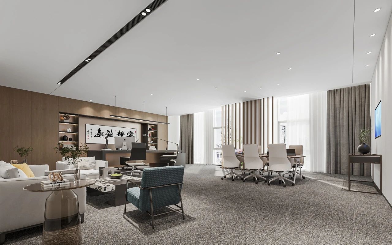 胡桃木饰面书柜搭配哑光金属框架,落地窗引入自然光,定制百叶帘调节明暗,营造沉稳而不压抑的氛围。