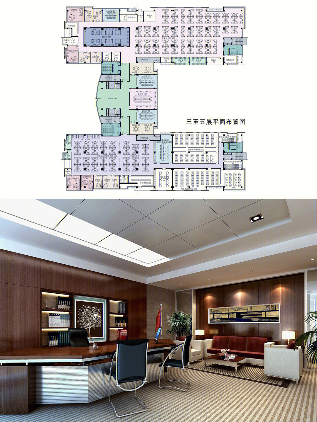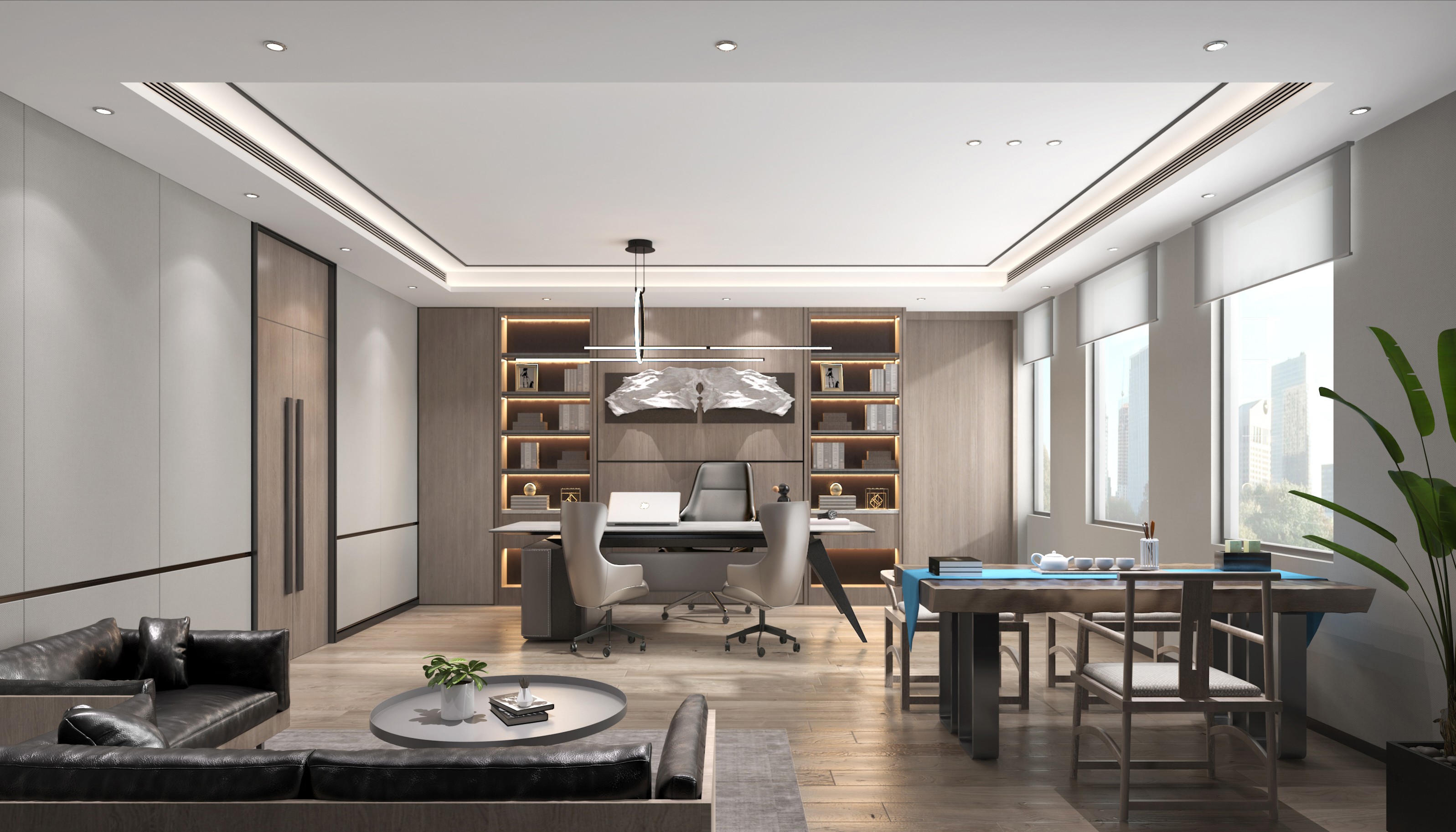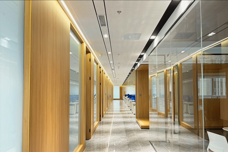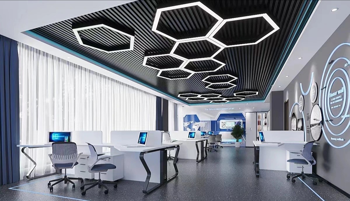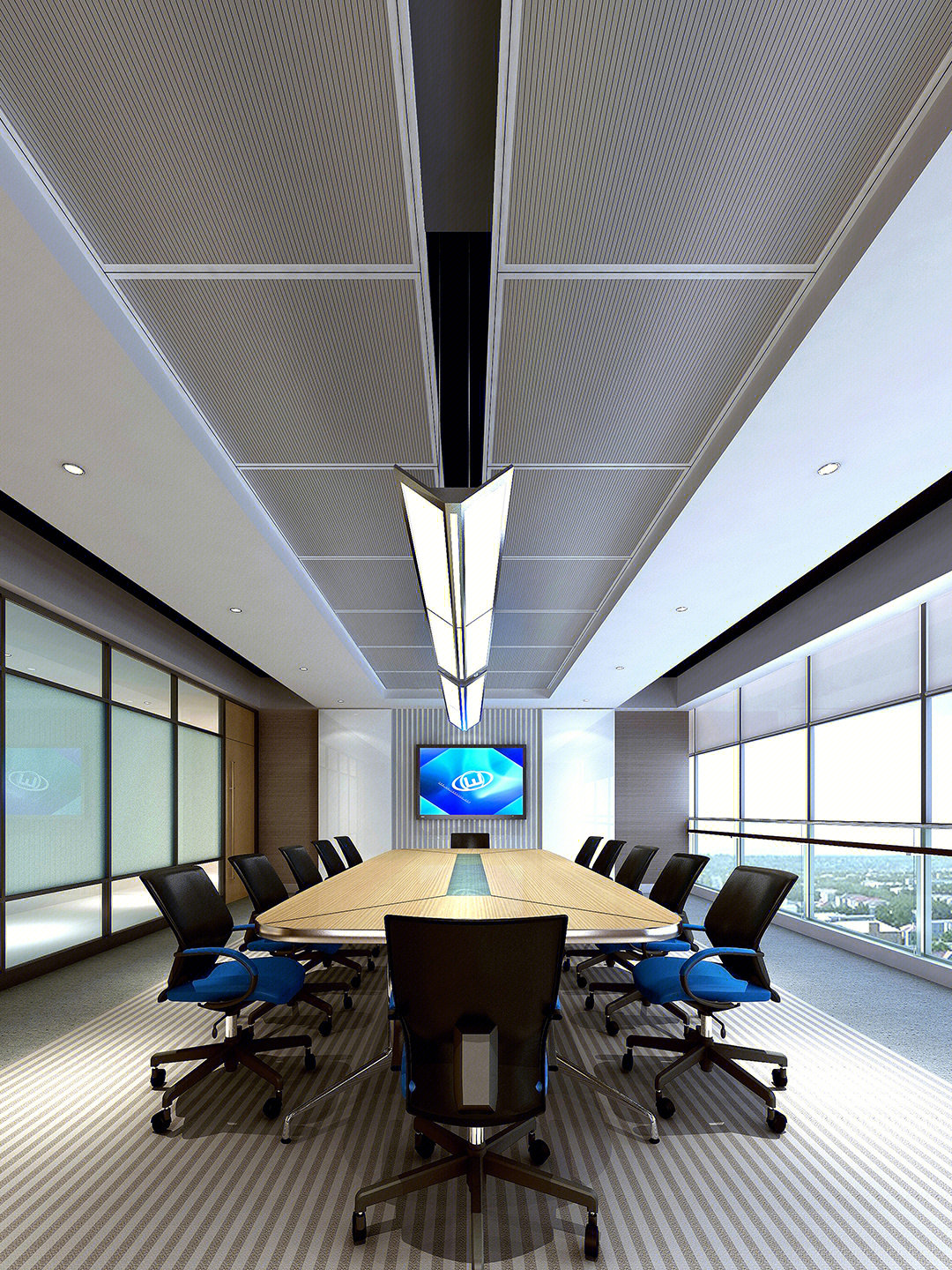 点线面的表现及灯光色彩的运用亦传达着每个空间的个性与共性。小会议室采用局部吊顶的形式,将几何造型贯穿于整个空间,在蓝色与亮黄色的对比中,呈现出舒适优雅且充满活力的办公氛围,从感官上,促进会议中的积极互动。