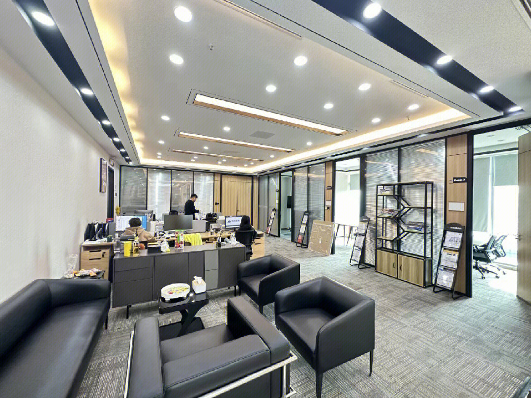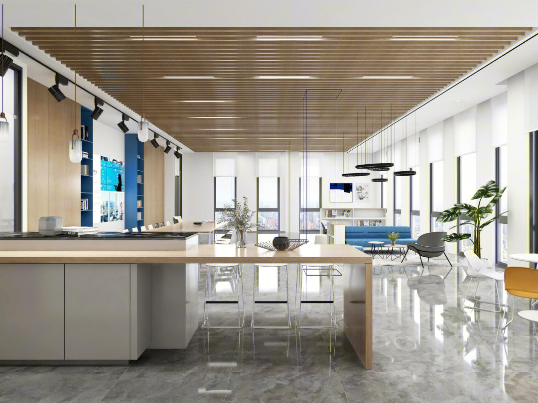 办公区域设计主要以简洁为主,让空间看起来更大气通透,简约的灯饰、科技感色彩明快,让空间表现出灵动的气质。