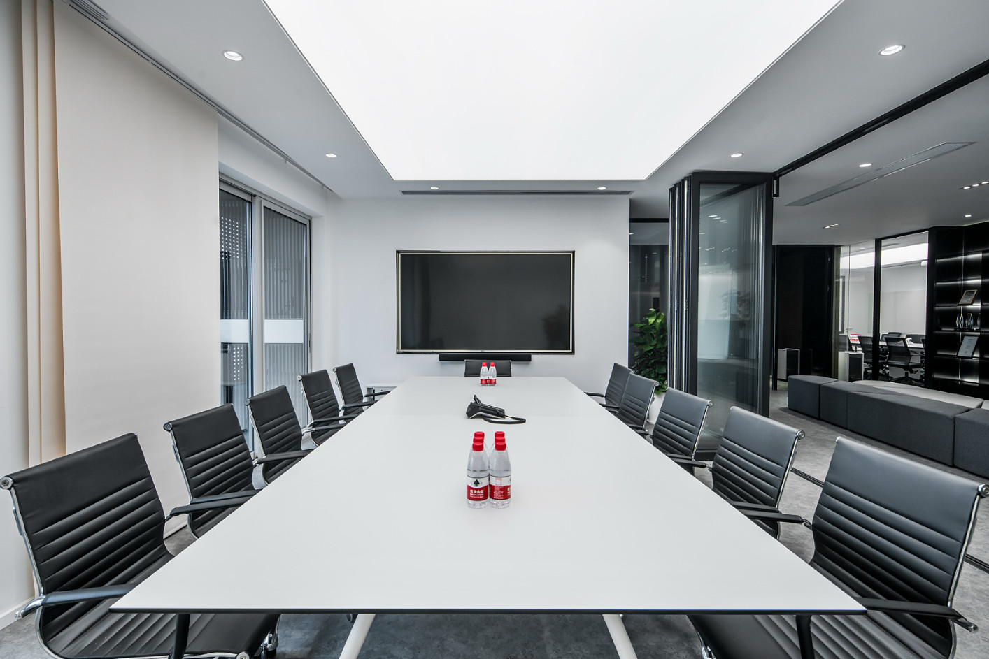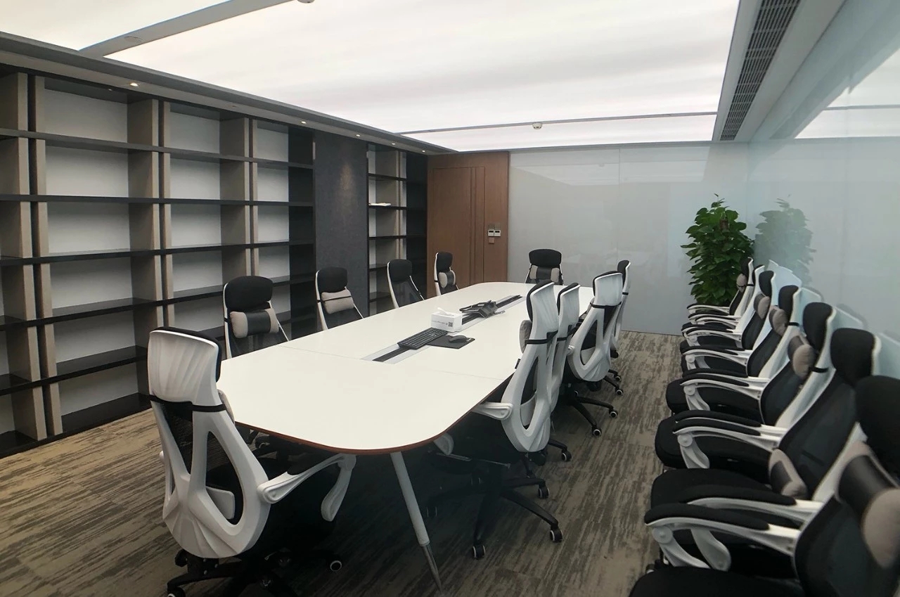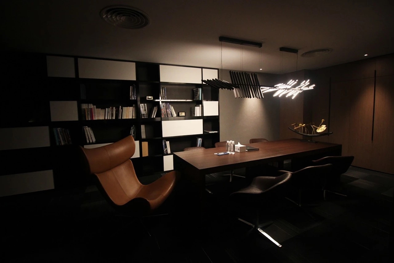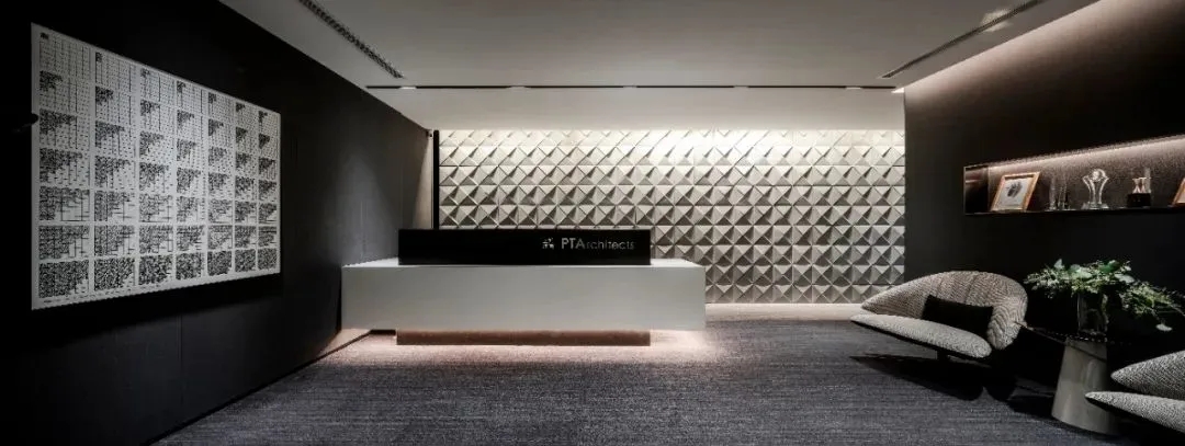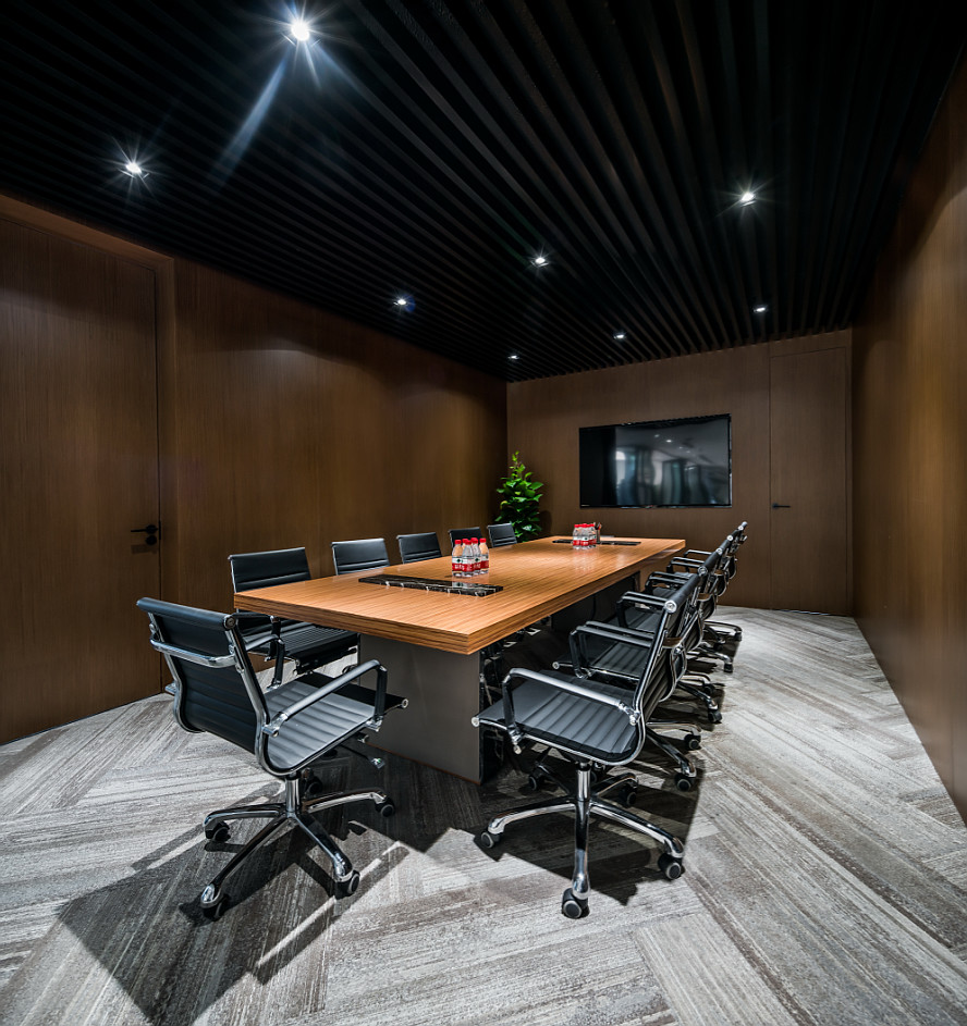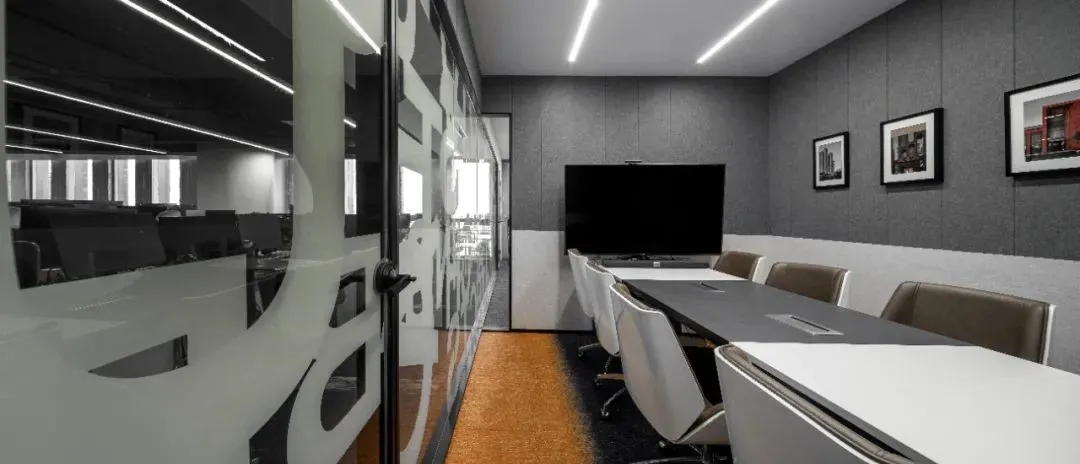 我们在设计上运用了很多组合空间,将整个接待区域打造成一个集接待、会议、洽谈、展示、培训为一体的多功能空间。通过活动折叠门,将三个原本独立的空间连接起来,在会议室不使用的时候可以通过打开折叠门的方式让整个接待区域空间感提升三倍。在进行公司例会时,接待区域又可以作为例会空间的一部分,让空间的利用率大大提升。