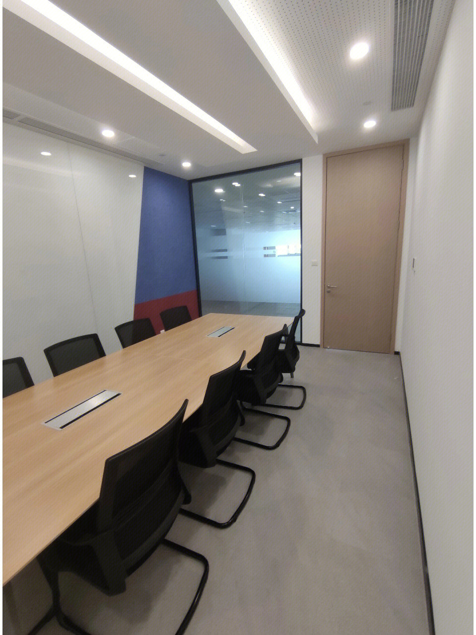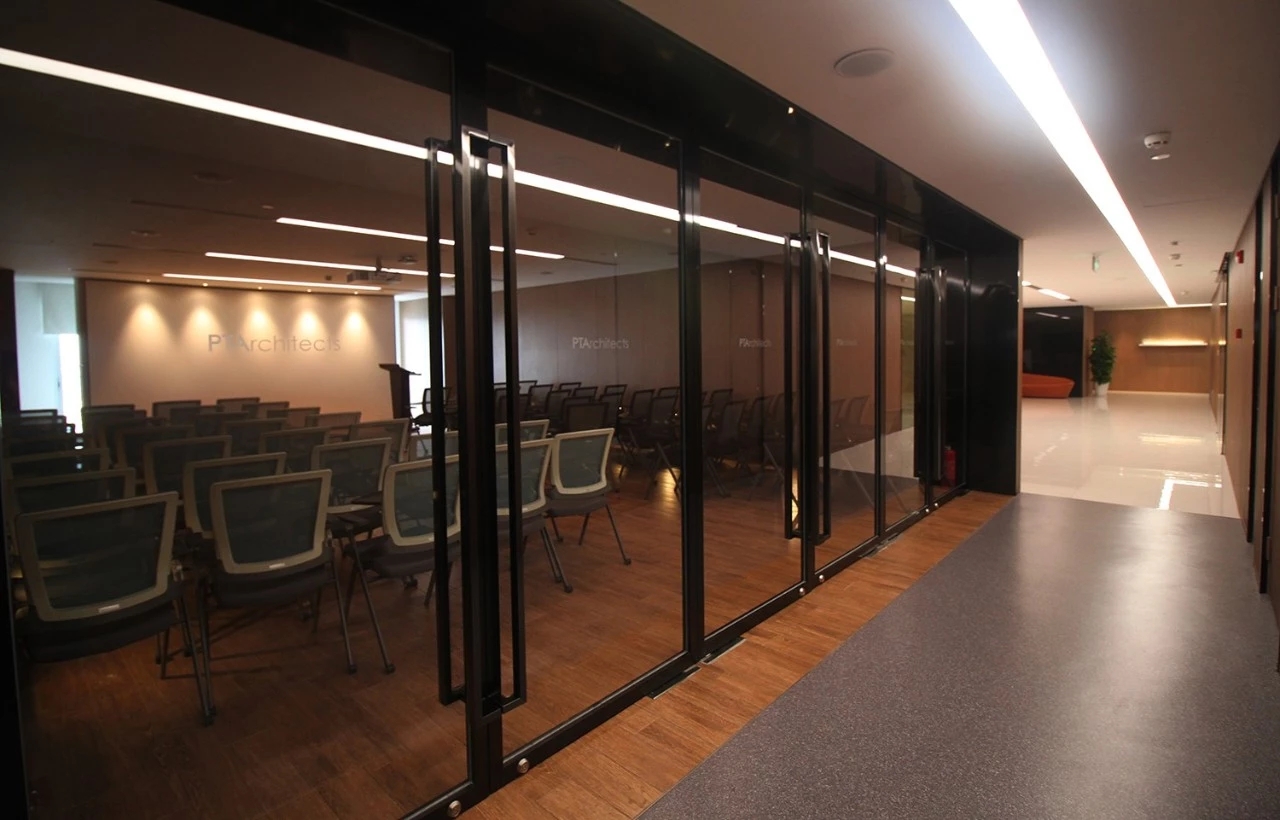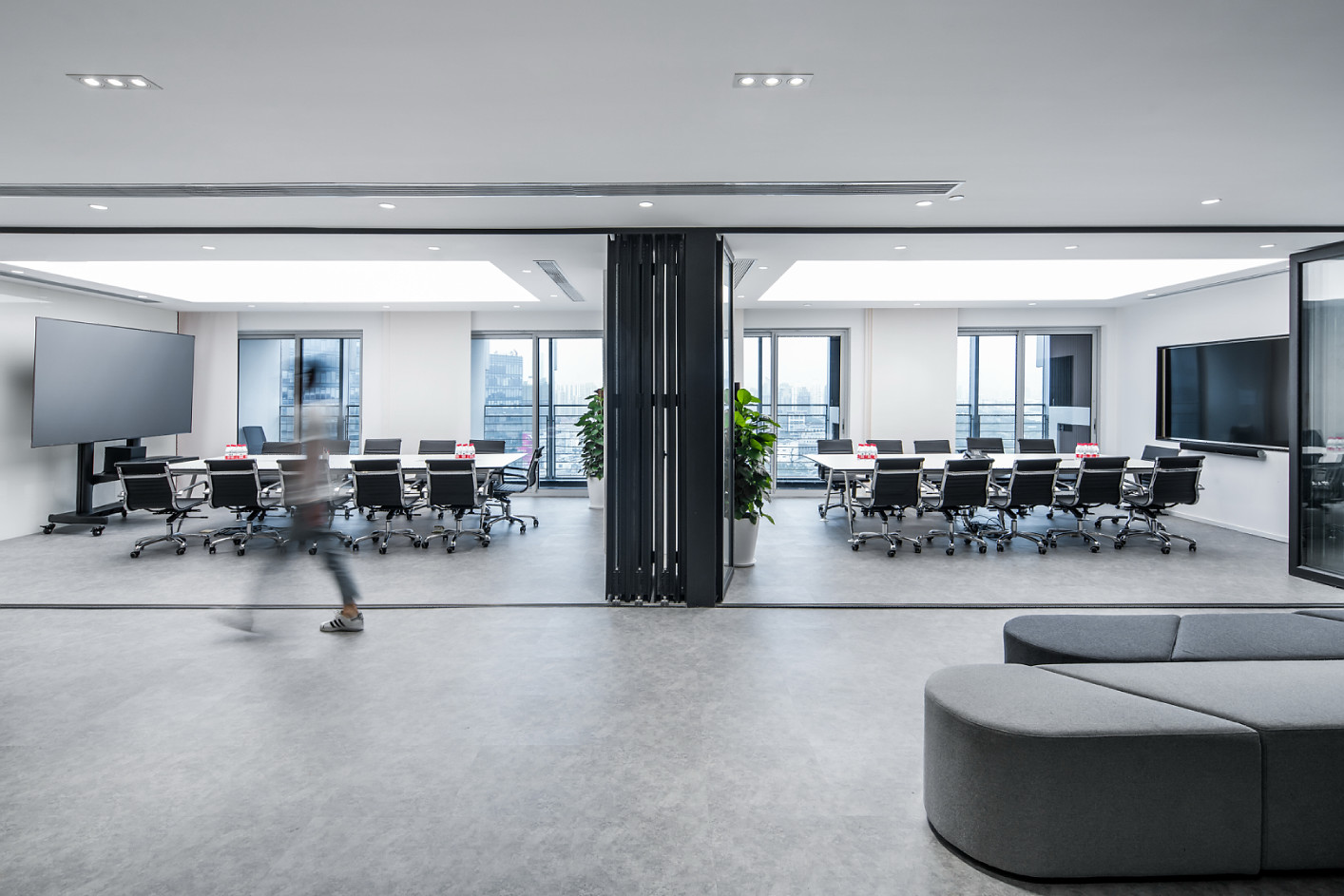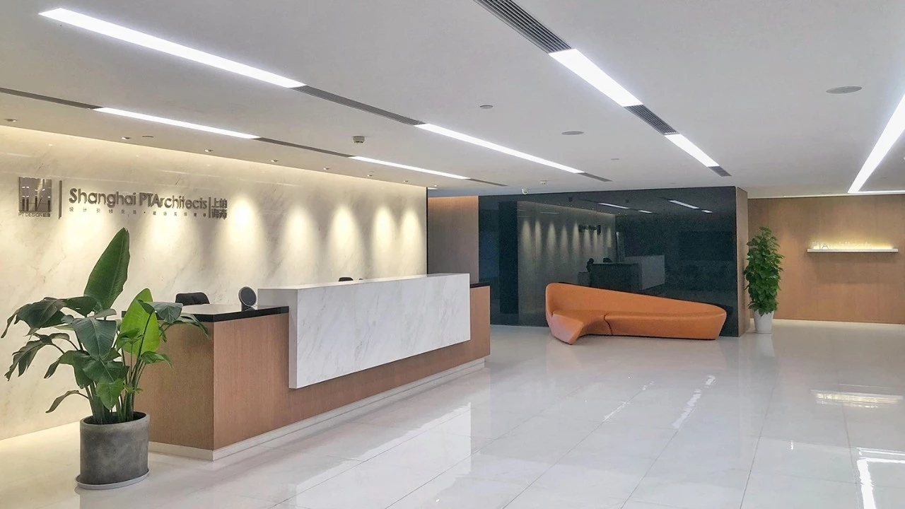 我们在设计上运用了很多组合空间,将整个接待区域打造成一个集接待、会议、洽谈、展示、培训为一体的多功能空间。通过活动折叠门,将三个原本独立的空间连接起来,在会议室不使用的时候可以通过打开折叠门的方式让整个接待区域空间感提升三倍。在进行公司例会时,接待区域又可以作为例会空间的一部分,让空间的利用率大大提升。
