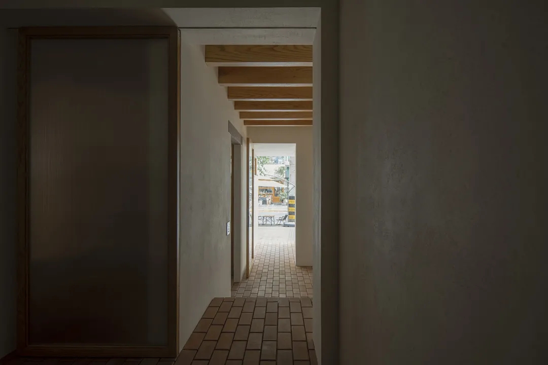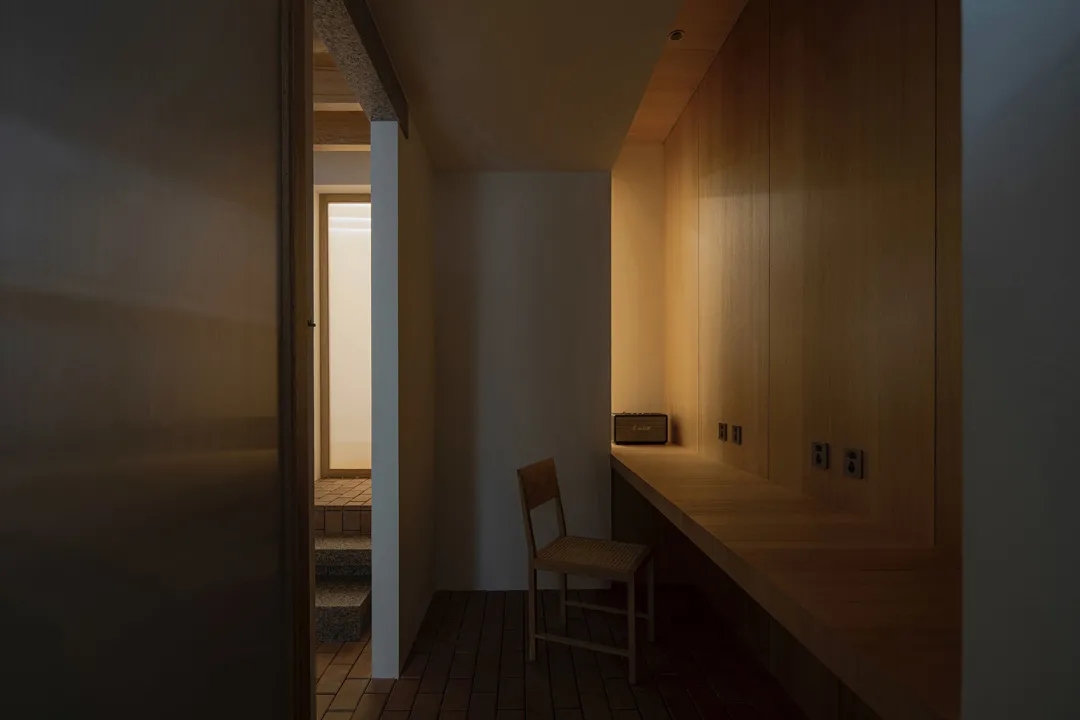 木头、陶砖、花岗岩都是容易让人产生亲近感的材料,配合肌理强烈的白色涂料,形成谦逊内敛的空间背景。阳光板的轻巧介入,让极小的空间里,依然能觅得独处的静谧。