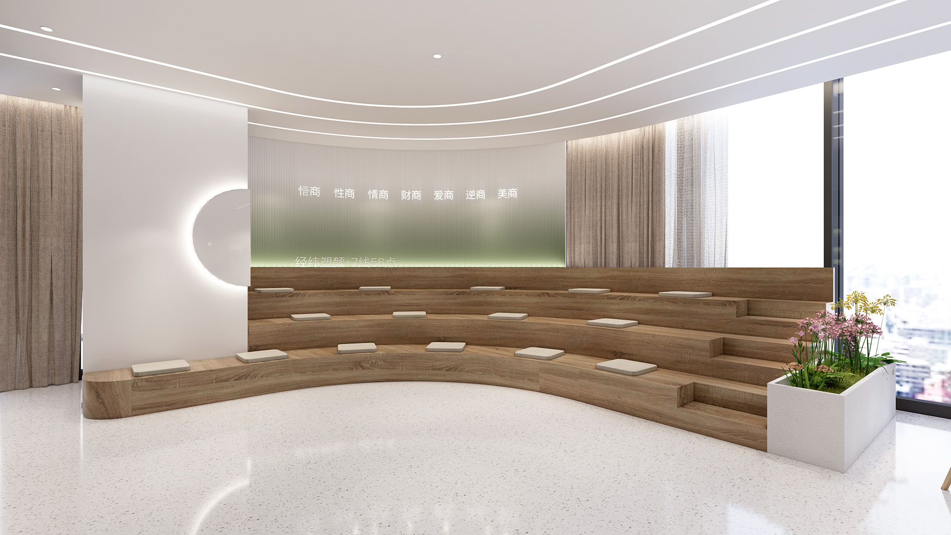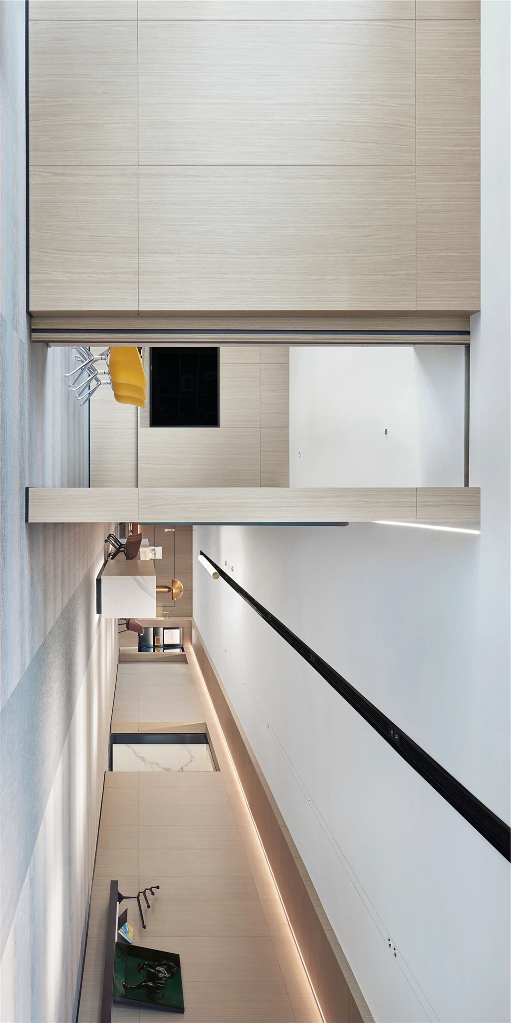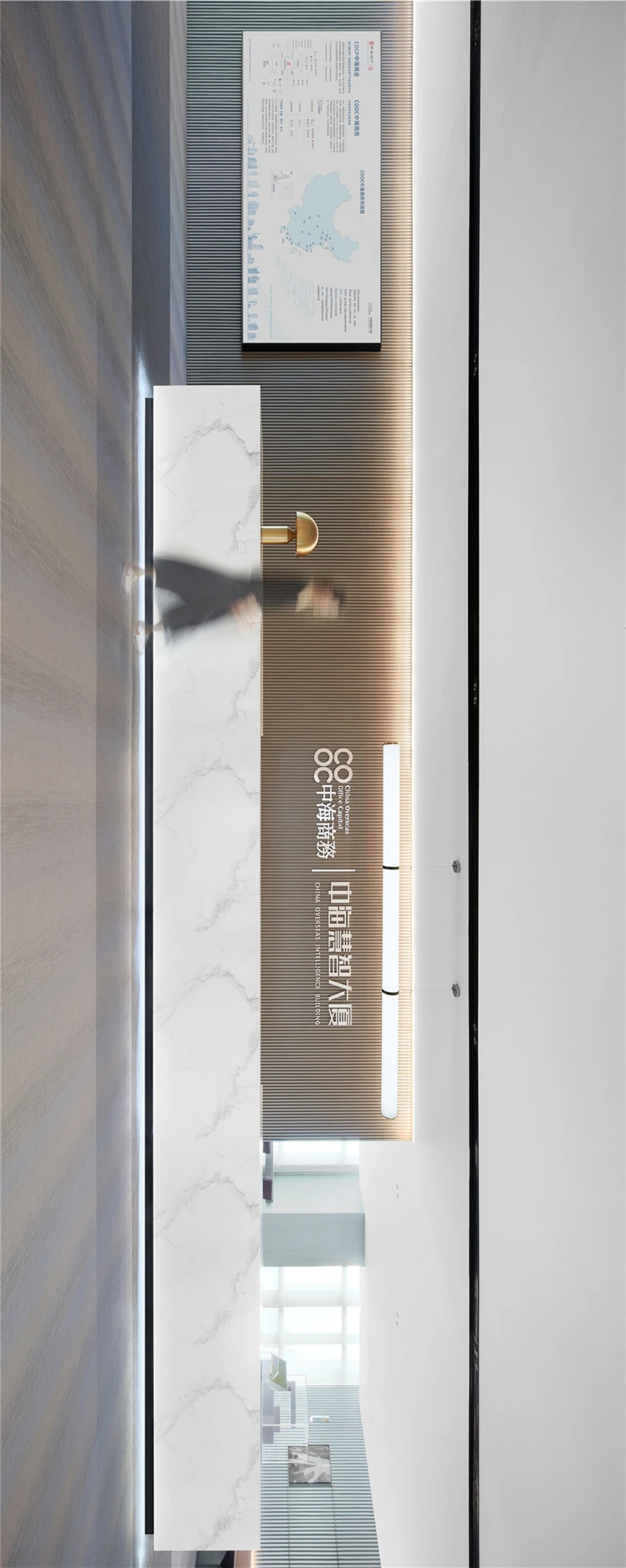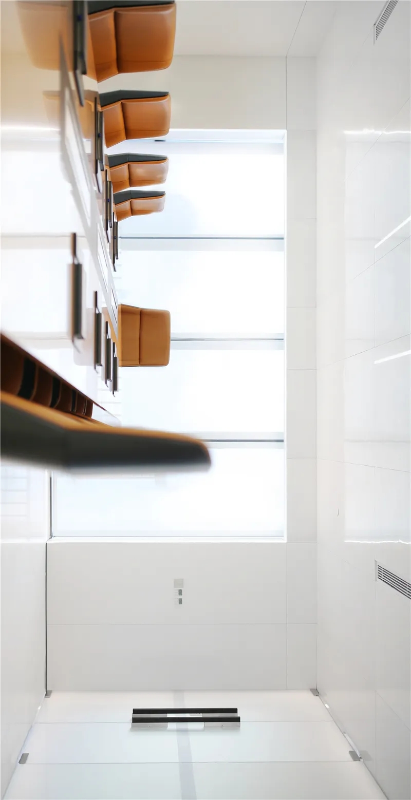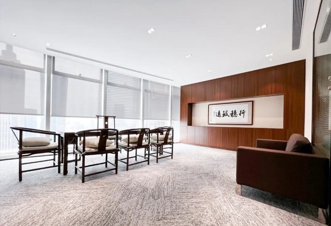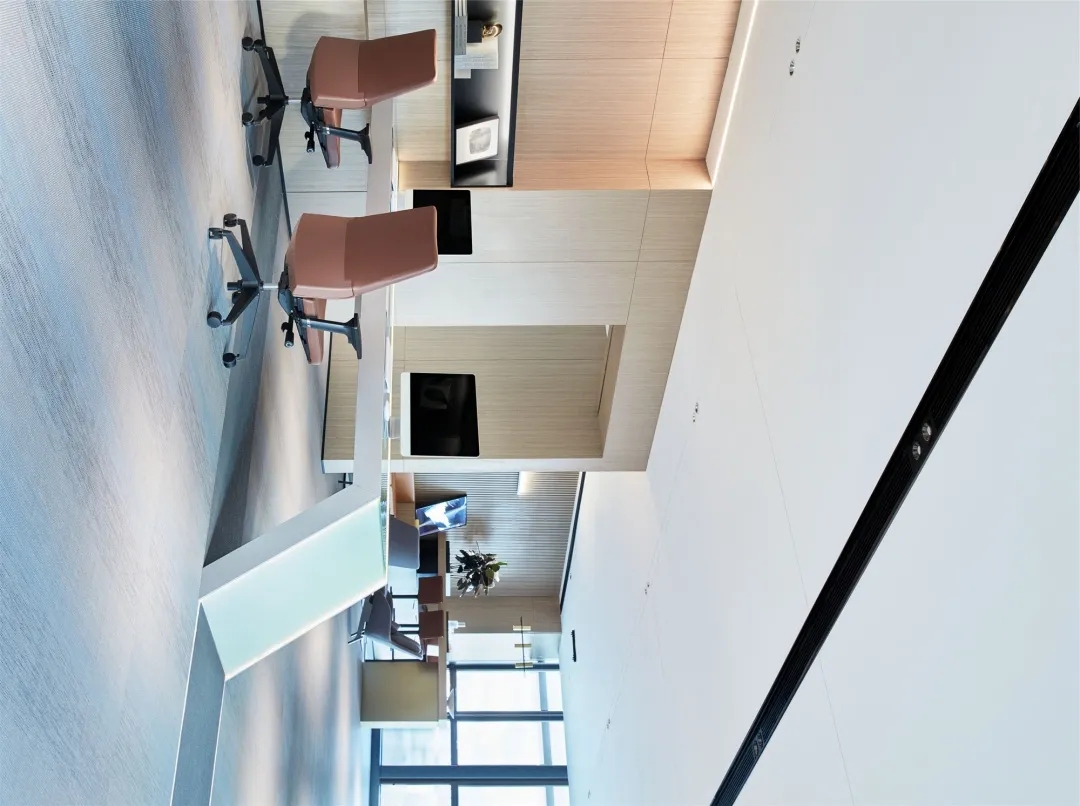 本项目中我们设计师更注重营造具有亲和力、吸引力和高可信度的空间氛围,为律所重置全新的空间蓝图。设计通过重塑和弱化原本柱体以及逼仄的天花,创造迎接客户和关怀员工的开放性空间。同时让律所各空间相互流通,将开放空间与私密性空间相互协调相互连接且不失整体性。圆弧形的前台背景掩盖了原本存在的柱子,同时增强了空间的横向延伸。爵士白大理石地面搭配墙体饰面的木纹肌理让来访者感受到整体空间带来的稳重、亲和与空间的包容性。通过强调空间与空间的流通,在区域与区域之间,自由的变化。