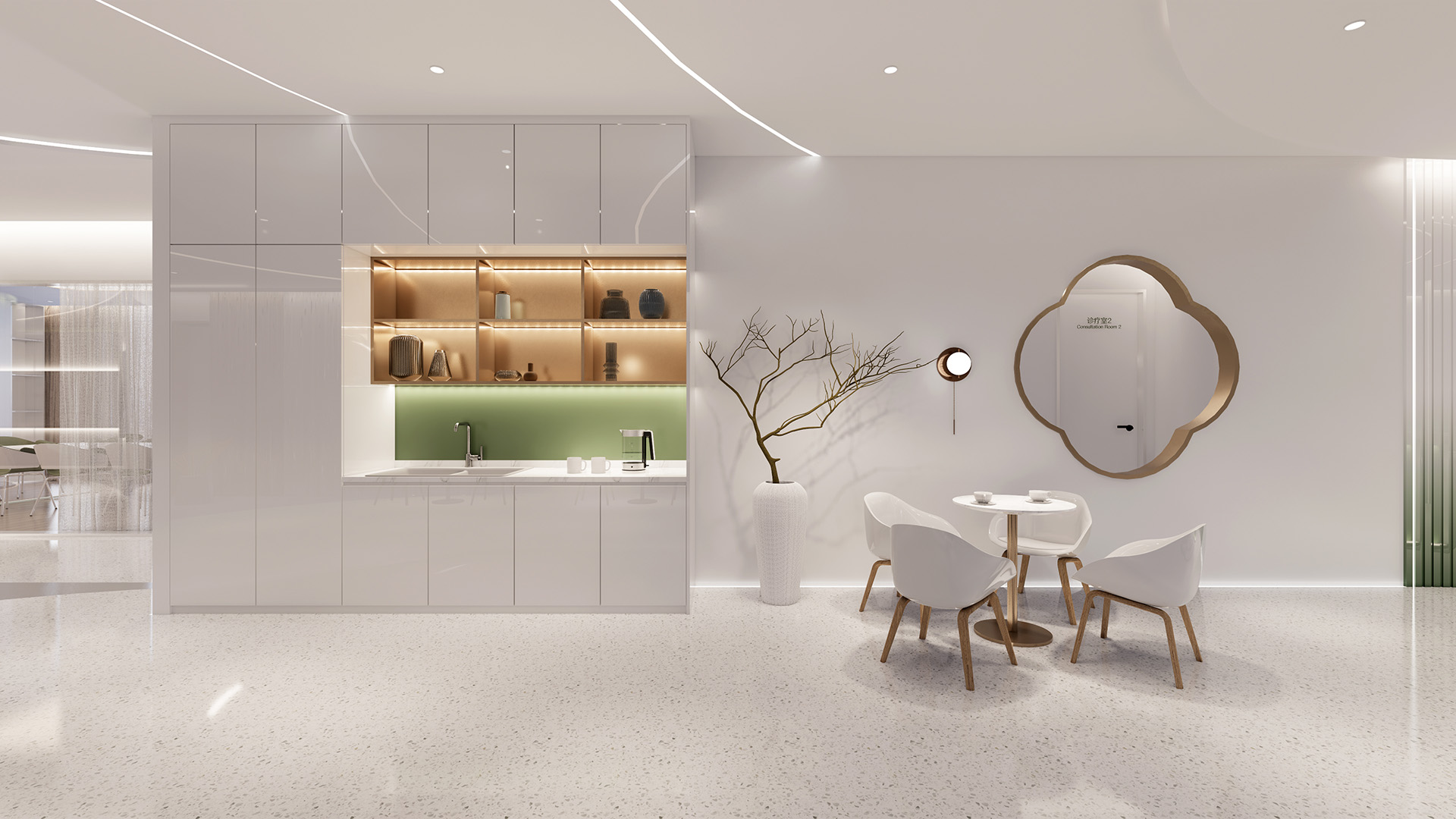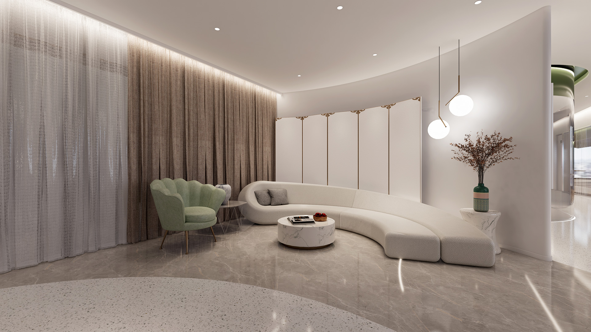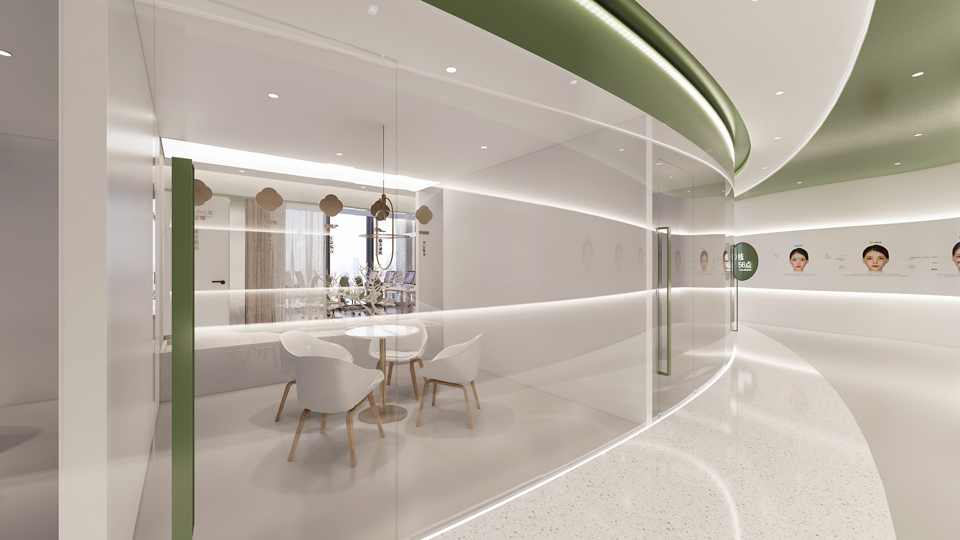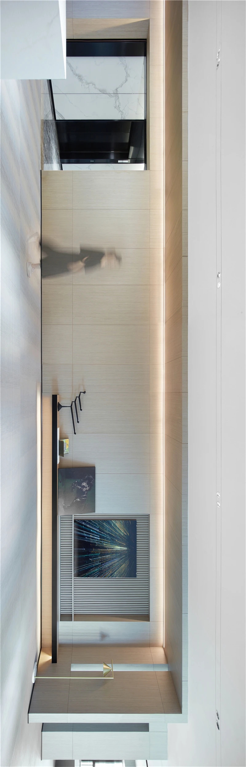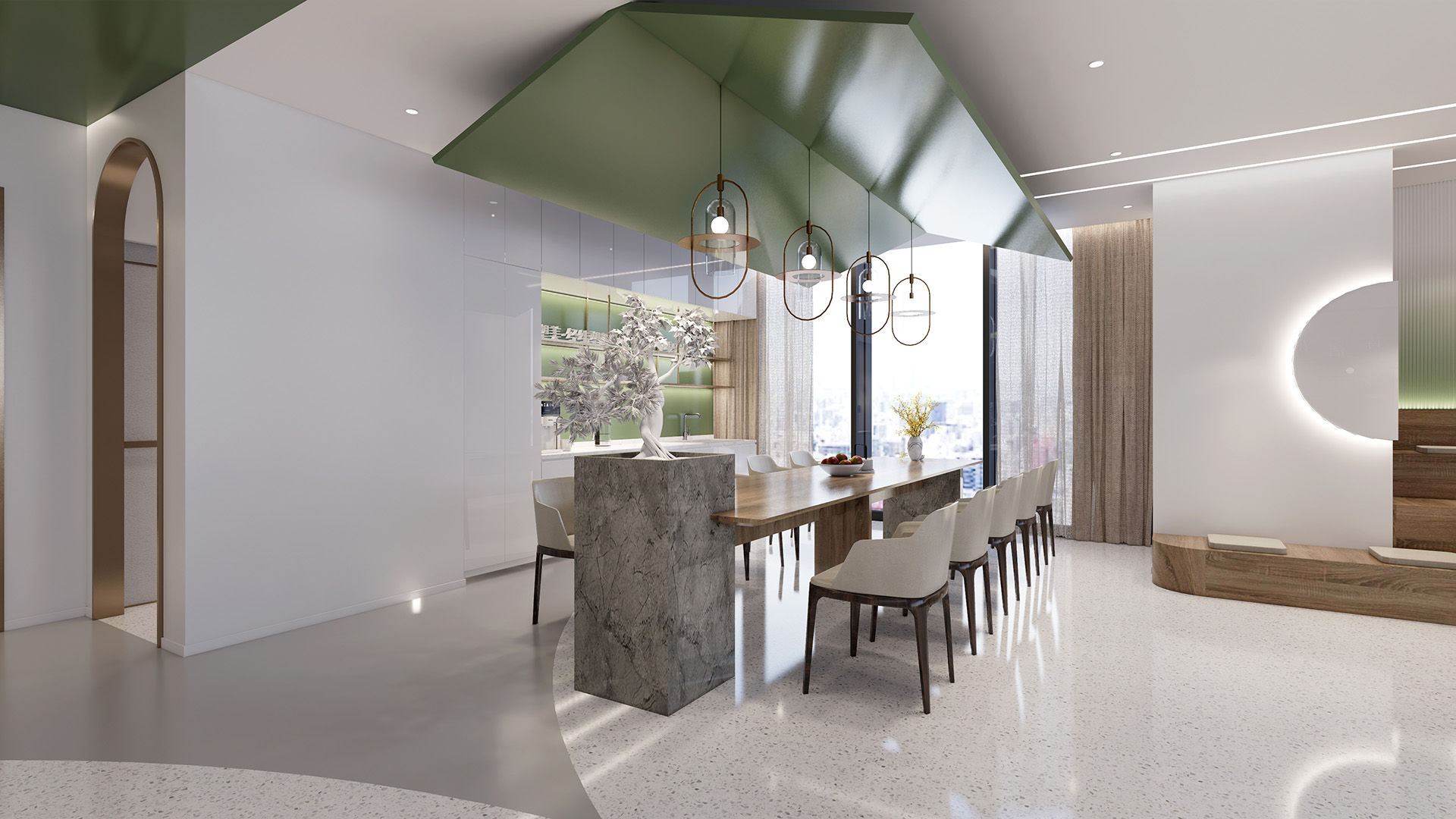 本项目中我们设计师更注重营造具有亲和力、吸引力和高可信度的空间氛围,为律所重置全新的空间蓝图。设计通过重塑和弱化原本柱体以及逼仄的天花,创造迎接客户和关怀员工的开放性空间。同时让律所各空间相互流通,将开放空间与私密性空间相互协调相互连接且不失整体性。圆弧形的前台背景掩盖了原本存在的柱子,同时增强了空间的横向延伸。爵士白大理石地面搭配墙体饰面的木纹肌理让来访者感受到整体空间带来的稳重、亲和与空间的包容性。通过强调空间与空间的流通,在区域与区域之间,自由的变化。