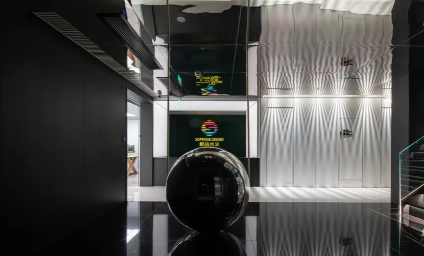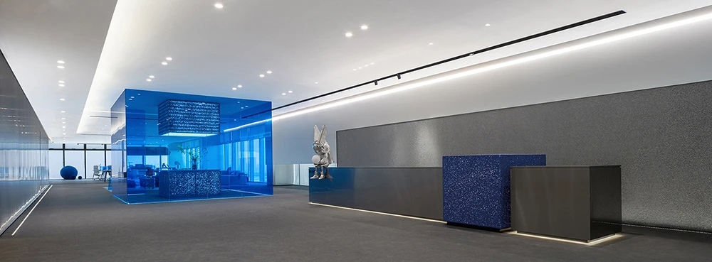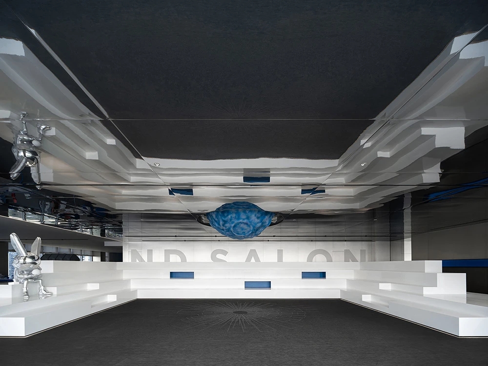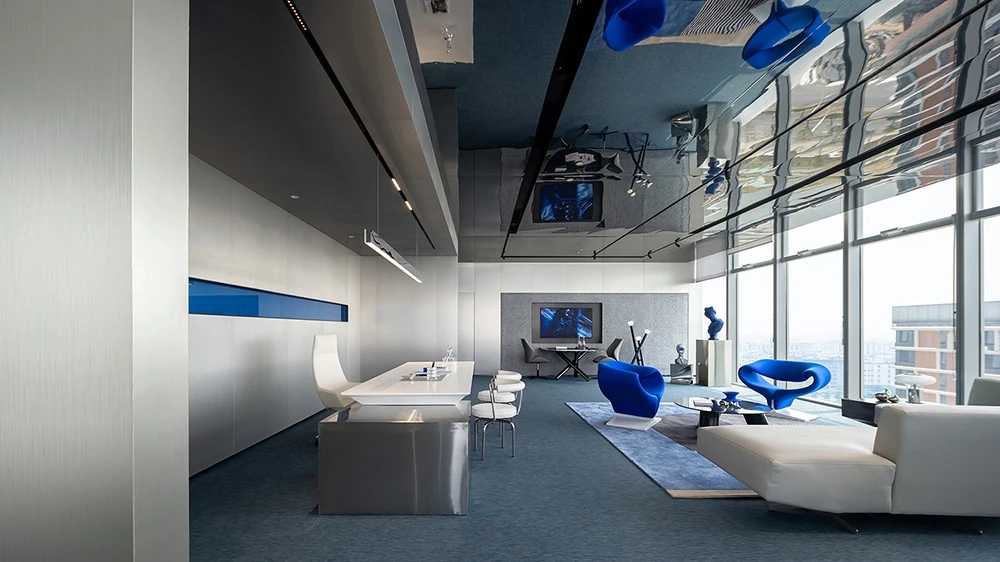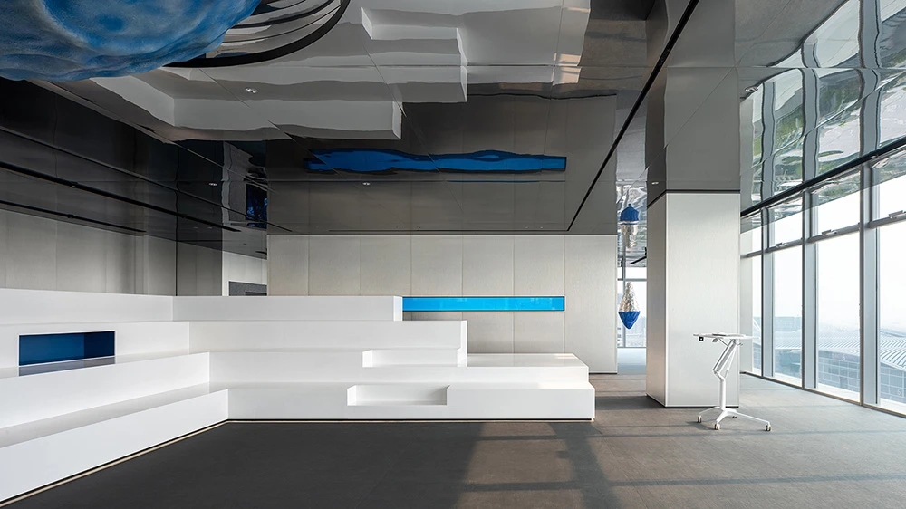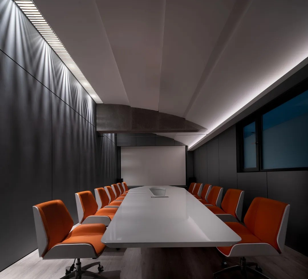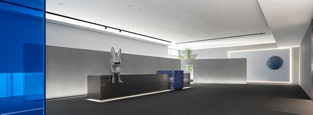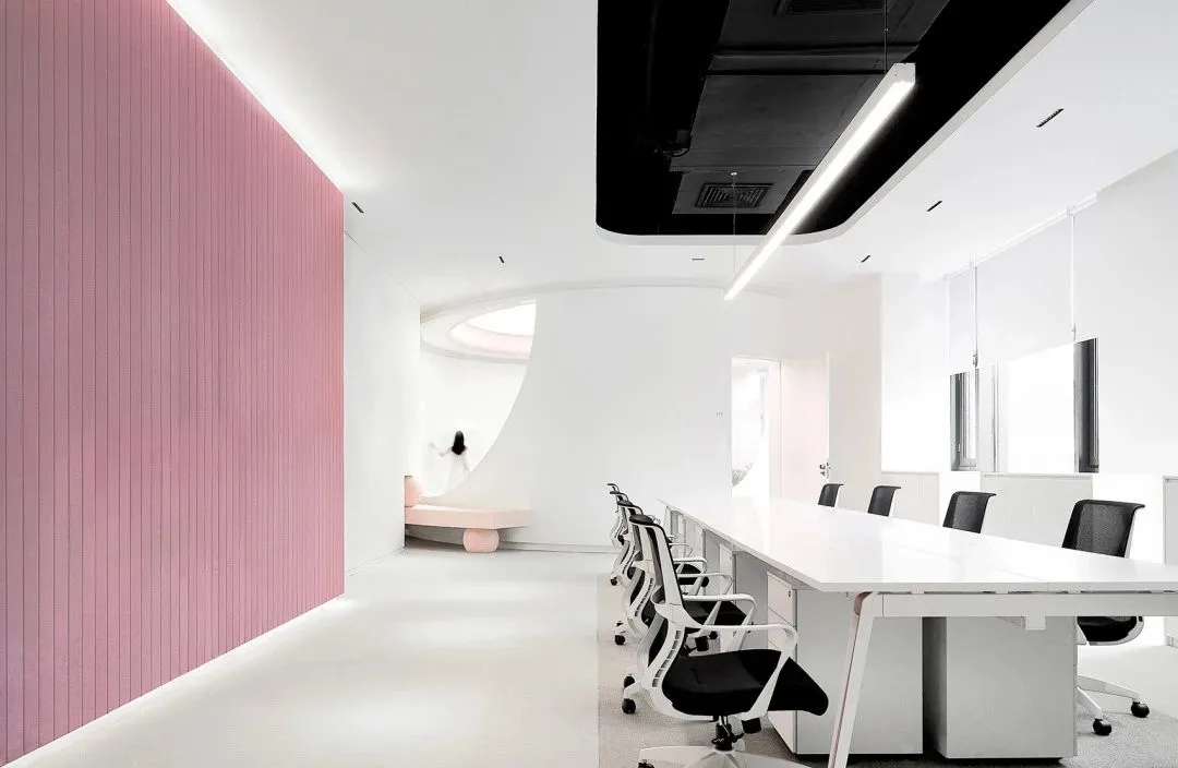 室内空间由功能家具和装置形成自然分隔,空间整体因祛除隔断而产生了流动,这与科学巨匠斯蒂芬·霍金的宇宙观具有一种相通性。Robbie太空兔和陨石一起来到这里,被安置在接待台和会议室中,向来访的人们讲述宇宙的故事,犹如那些激动人心的创业事迹一样,源于有限的奇点,产生突破界限的无穷能量。