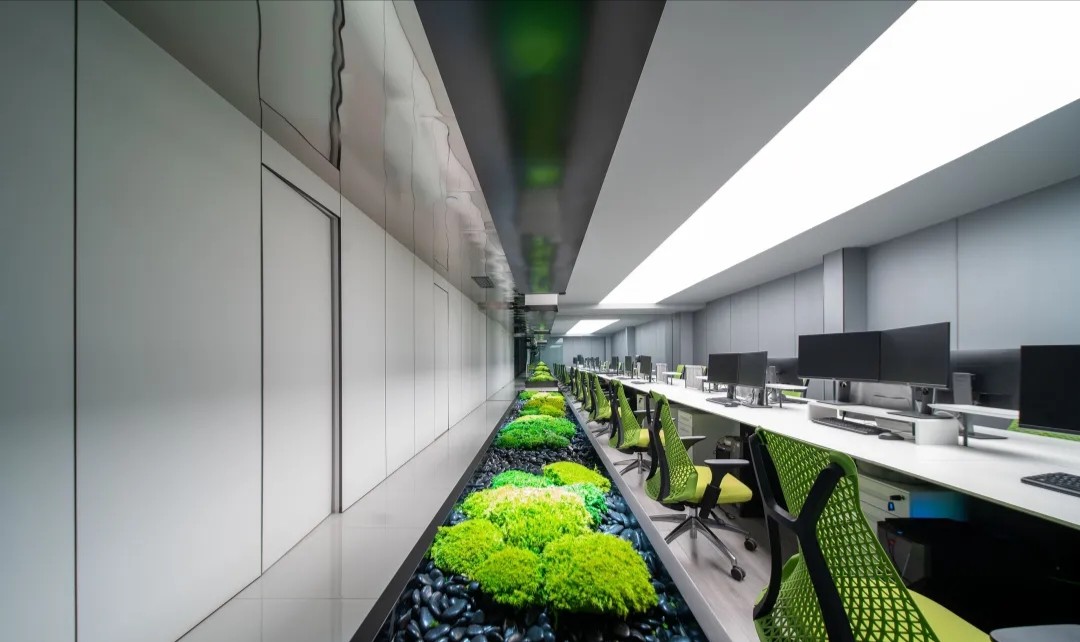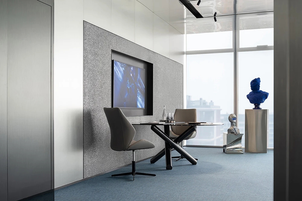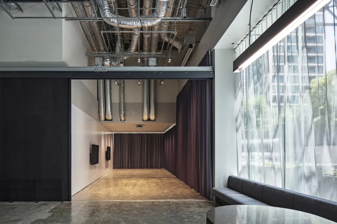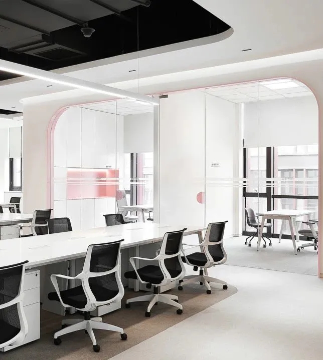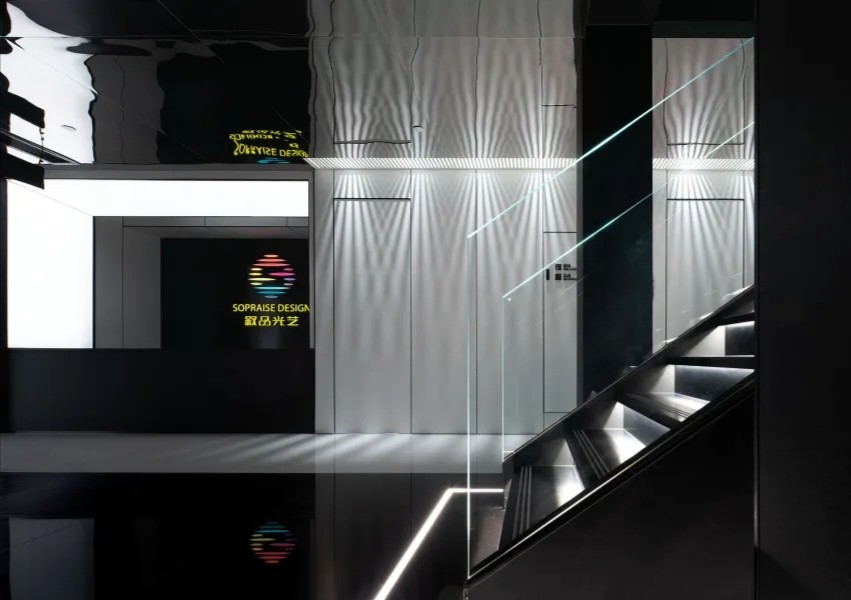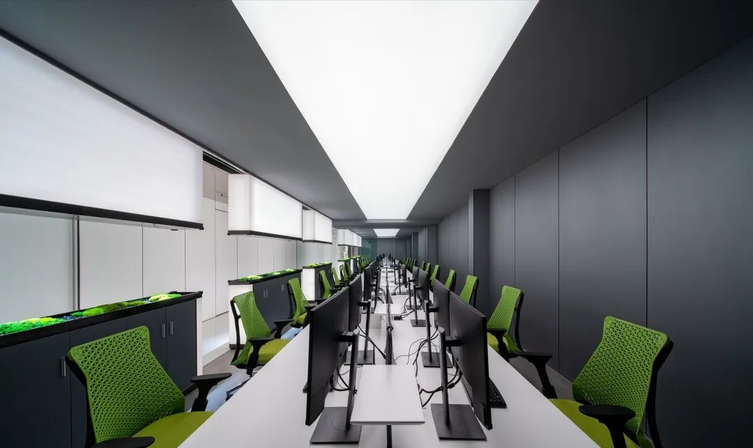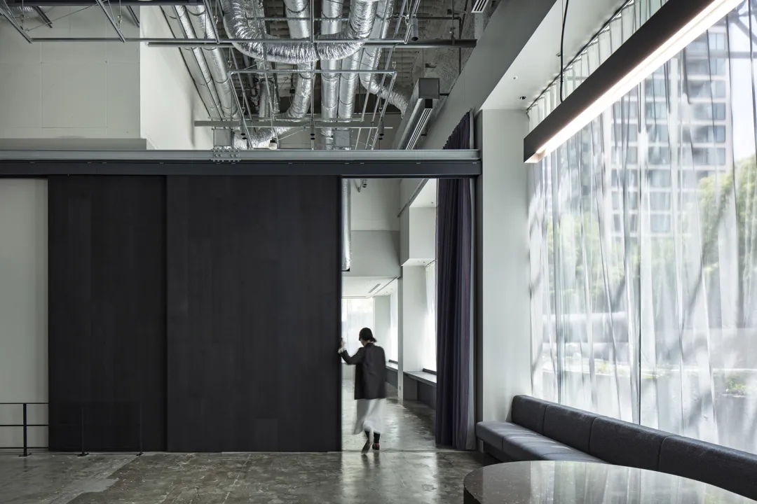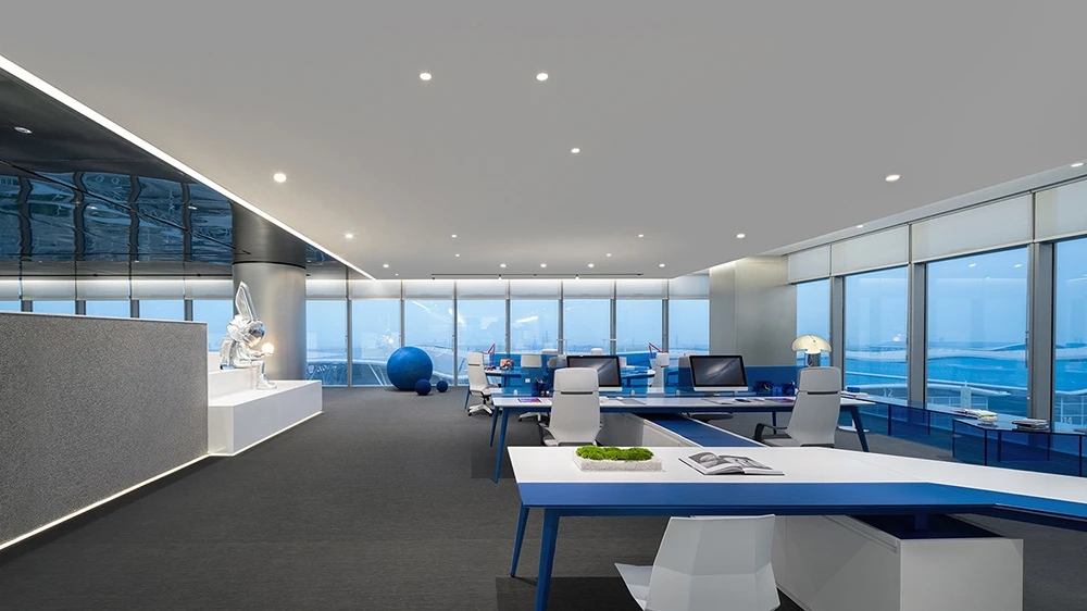 室内空间由功能家具和装置形成自然分隔,空间整体因祛除隔断而产生了流动,这与科学巨匠斯蒂芬·霍金的宇宙观具有一种相通性。Robbie太空兔和陨石一起来到这里,被安置在接待台和会议室中,向来访的人们讲述宇宙的故事,犹如那些激动人心的创业事迹一样,源于有限的奇点,产生突破界限的无穷能量。
