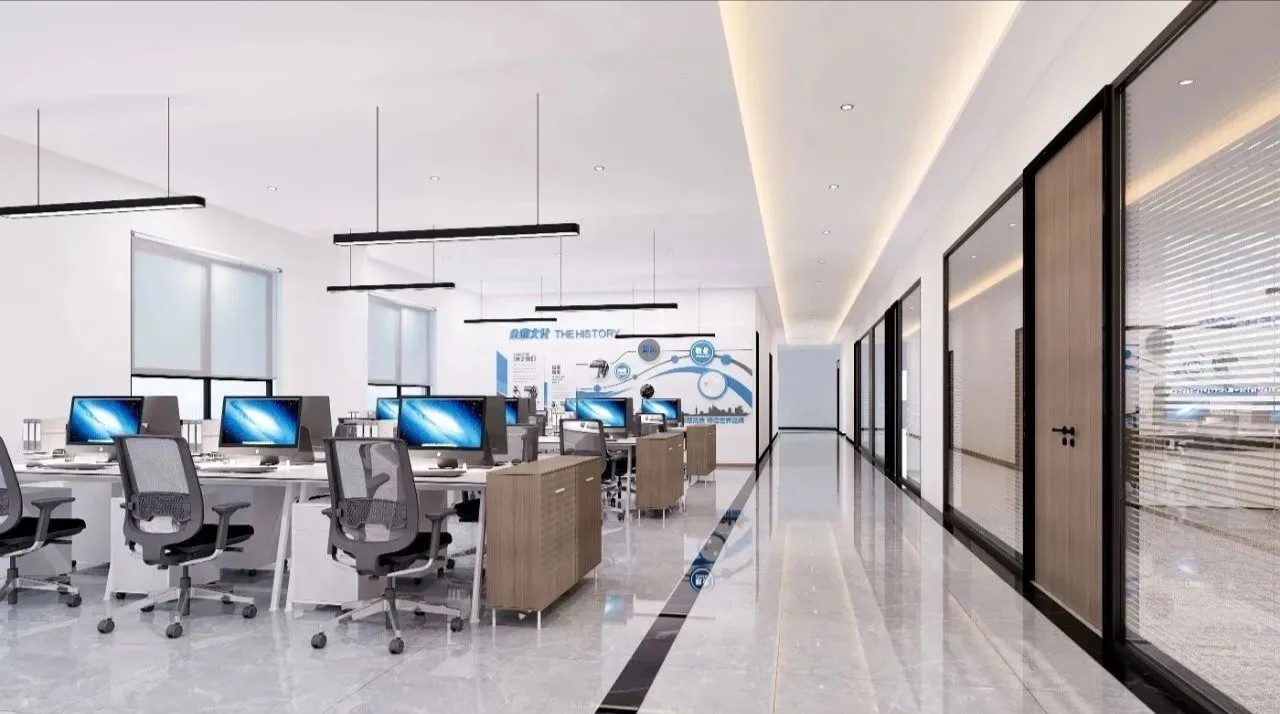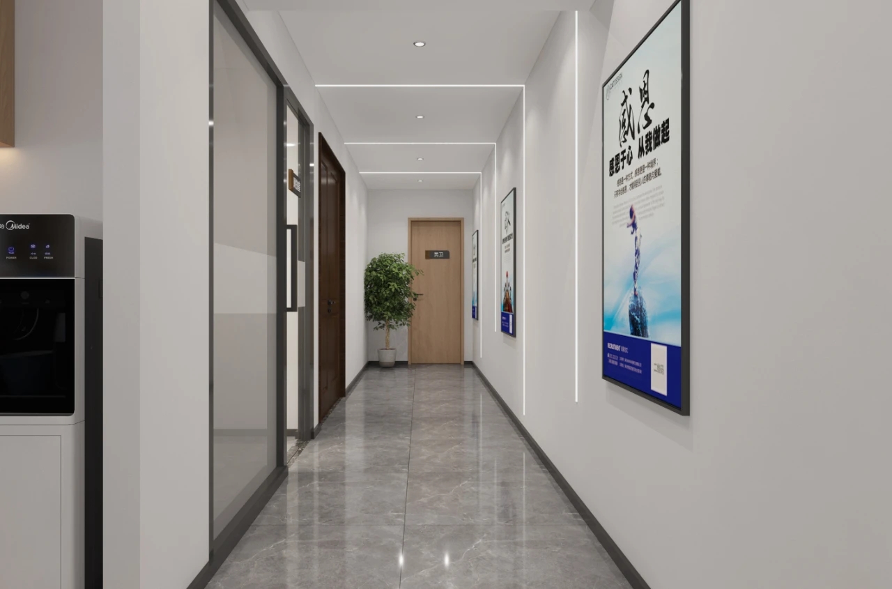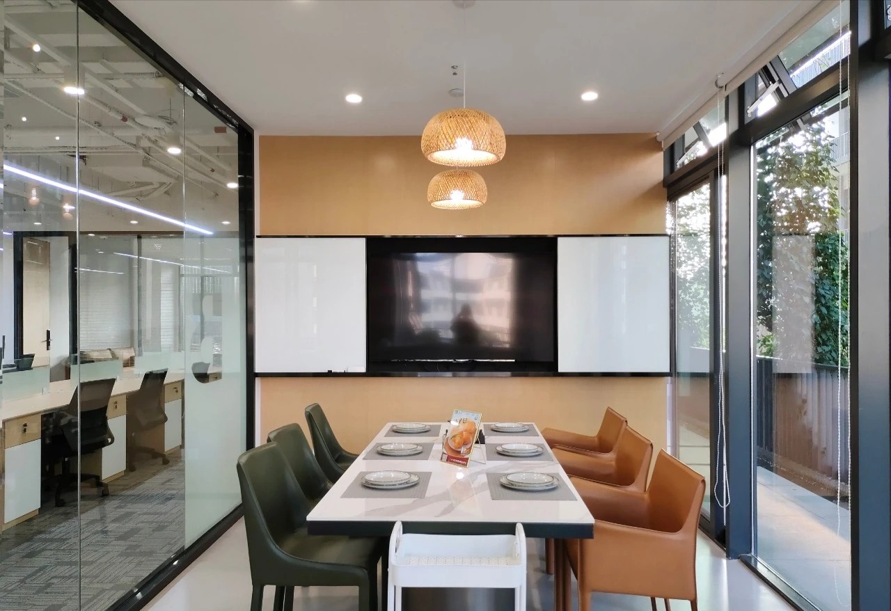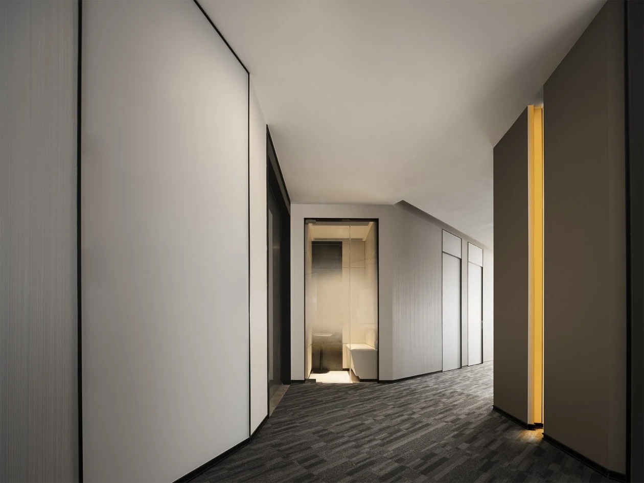 在弧面线条的延伸中,深入办公室的内部空间,过道是衔接功能转变的长廊,将空间一分为二呈相对对称的分布格局。透明玻璃与百叶帘的互动,呈现“空间是一种关系”的隐喻,在内外间隔的区分中,明确不同区域属性的多维度交集。