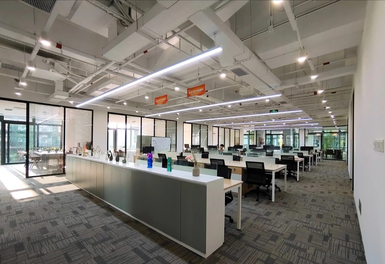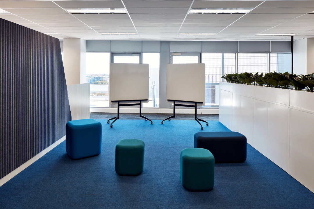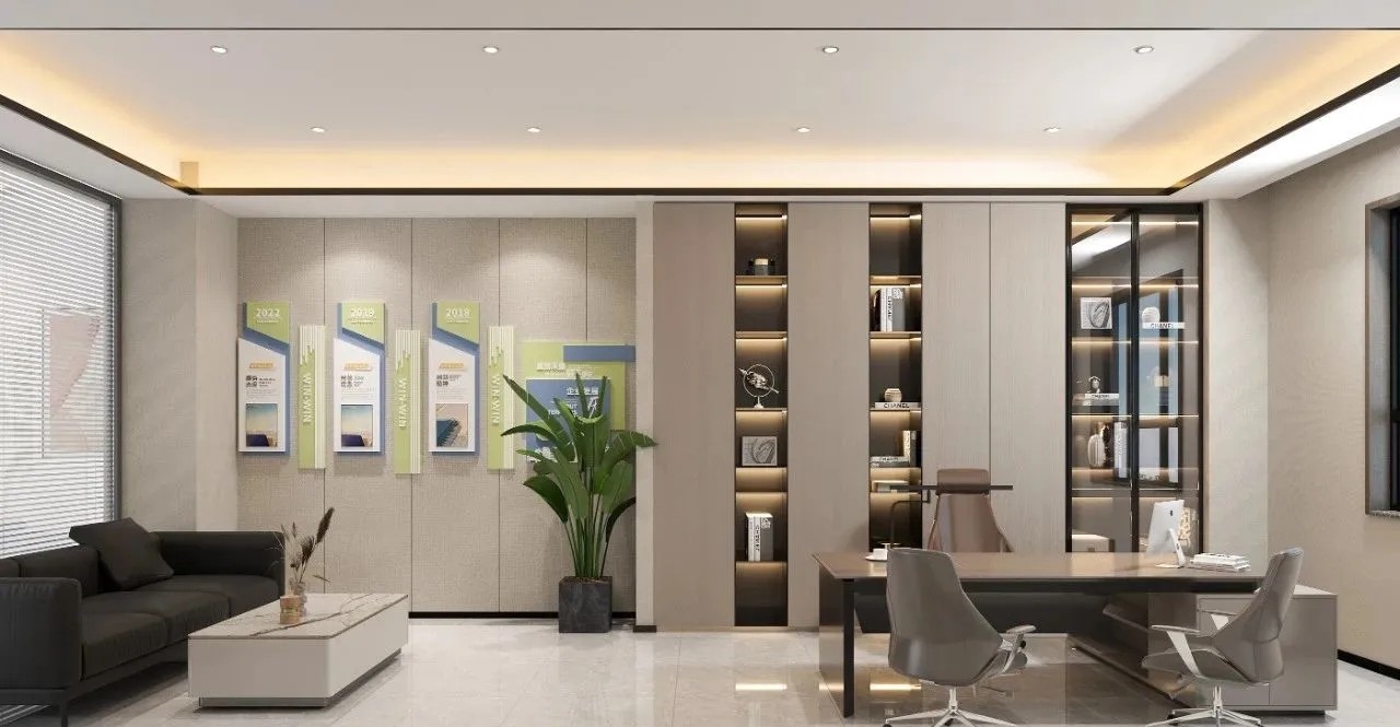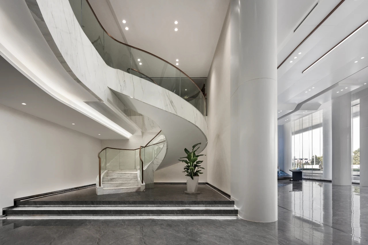 在弧面线条的延伸中,深入办公室的内部空间,过道是衔接功能转变的长廊,将空间一分为二呈相对对称的分布格局。透明玻璃与百叶帘的互动,呈现“空间是一种关系”的隐喻,在内外间隔的区分中,明确不同区域属性的多维度交集。