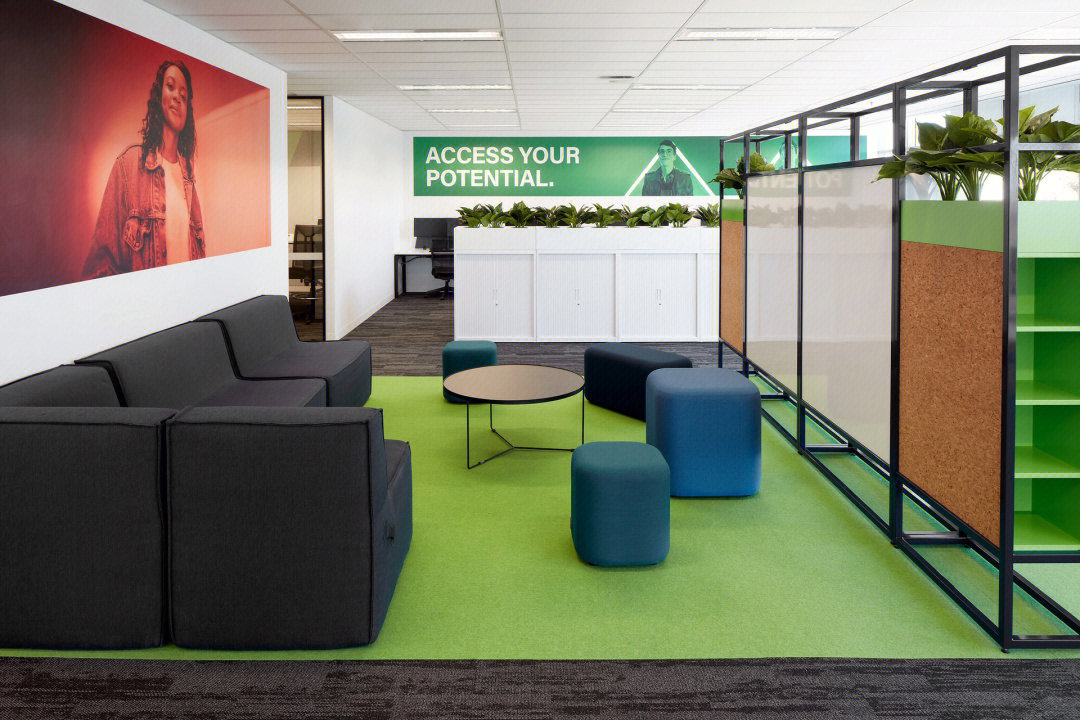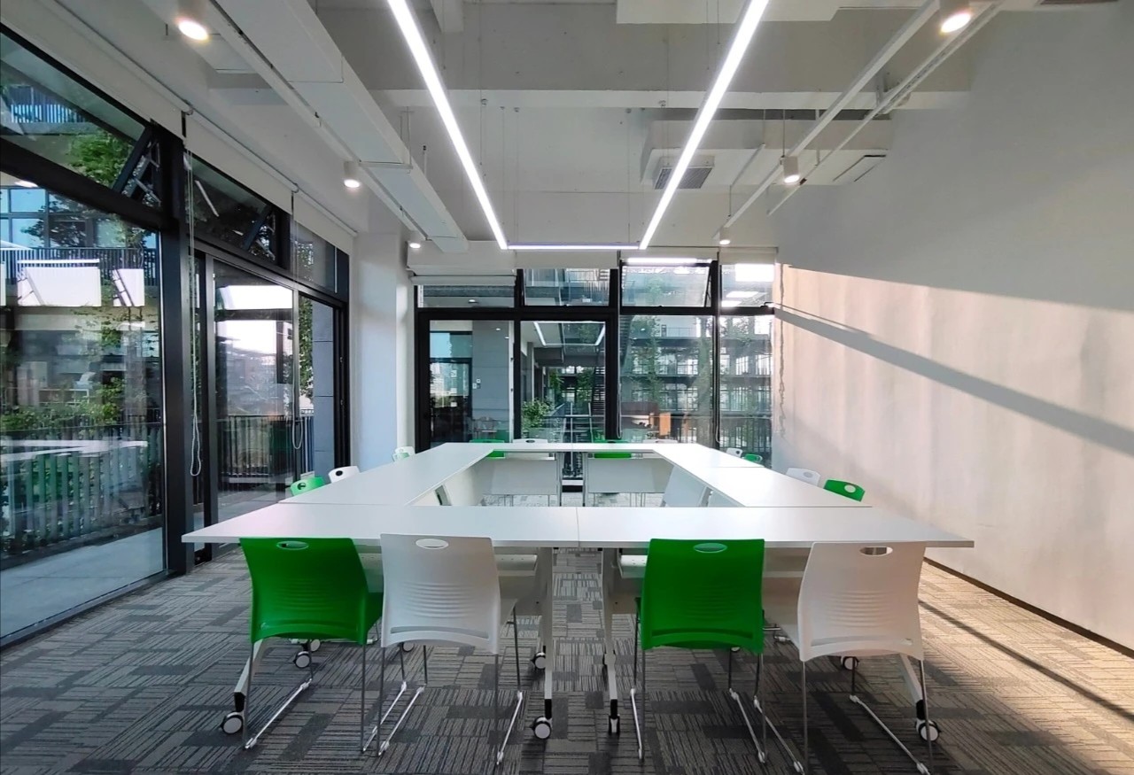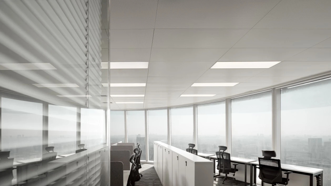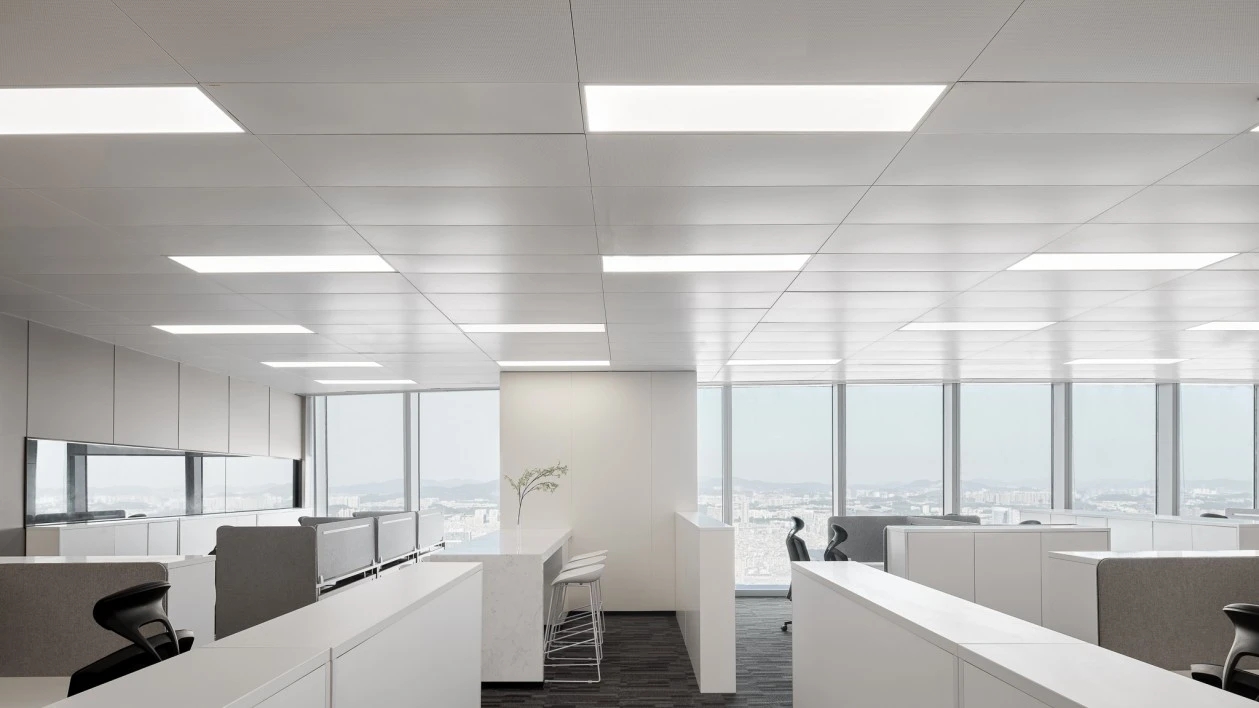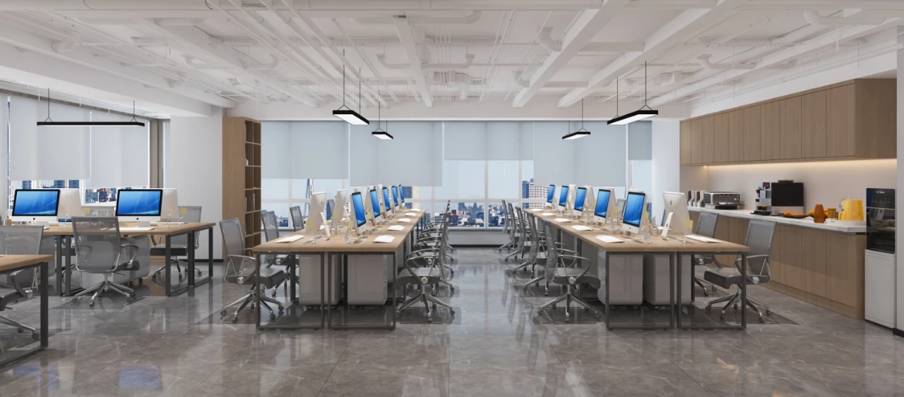 在弧面线条的延伸中,深入办公室的内部空间,过道是衔接功能转变的长廊,将空间一分为二呈相对对称的分布格局。透明玻璃与百叶帘的互动,呈现“空间是一种关系”的隐喻,在内外间隔的区分中,明确不同区域属性的多维度交集。