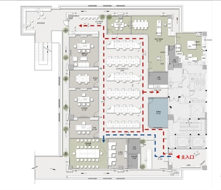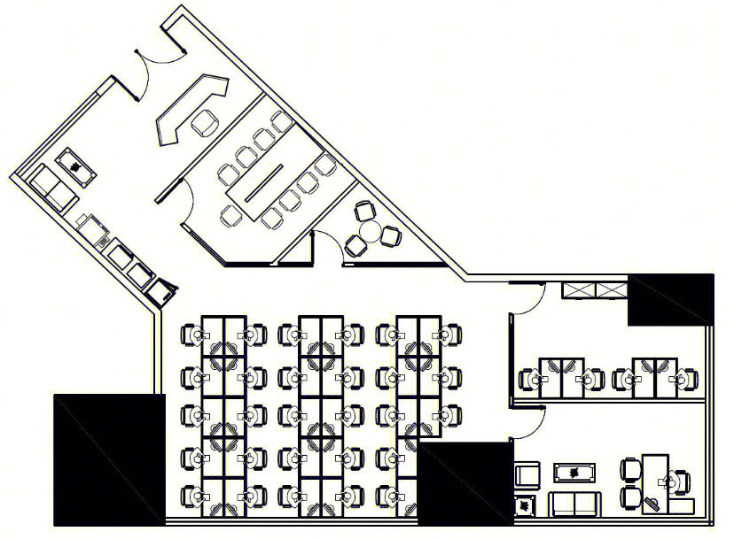 整个办公空间的格局呈“半回字”状,公共办公区分别位列空间的两翼处,设计师依据不同工作属性,在两个公共办公区配备不同的辅助空间。