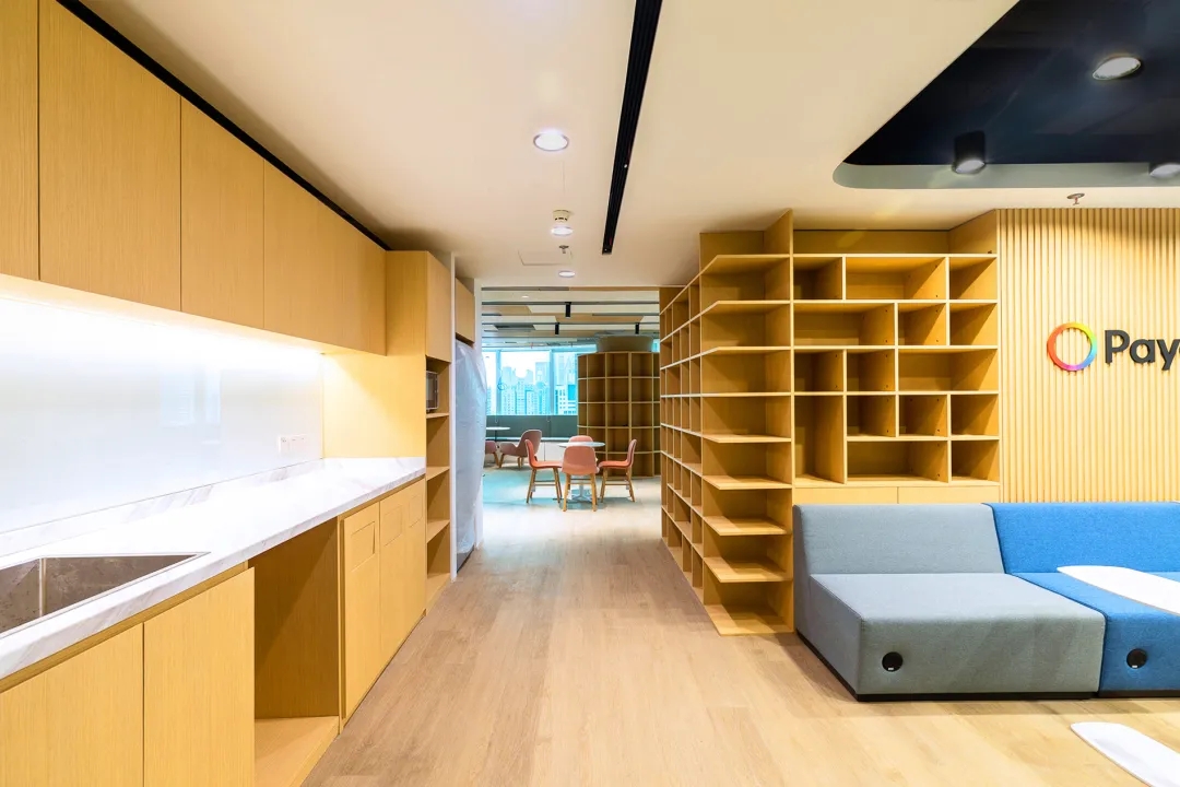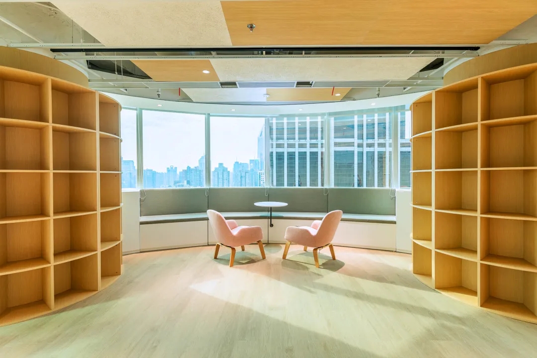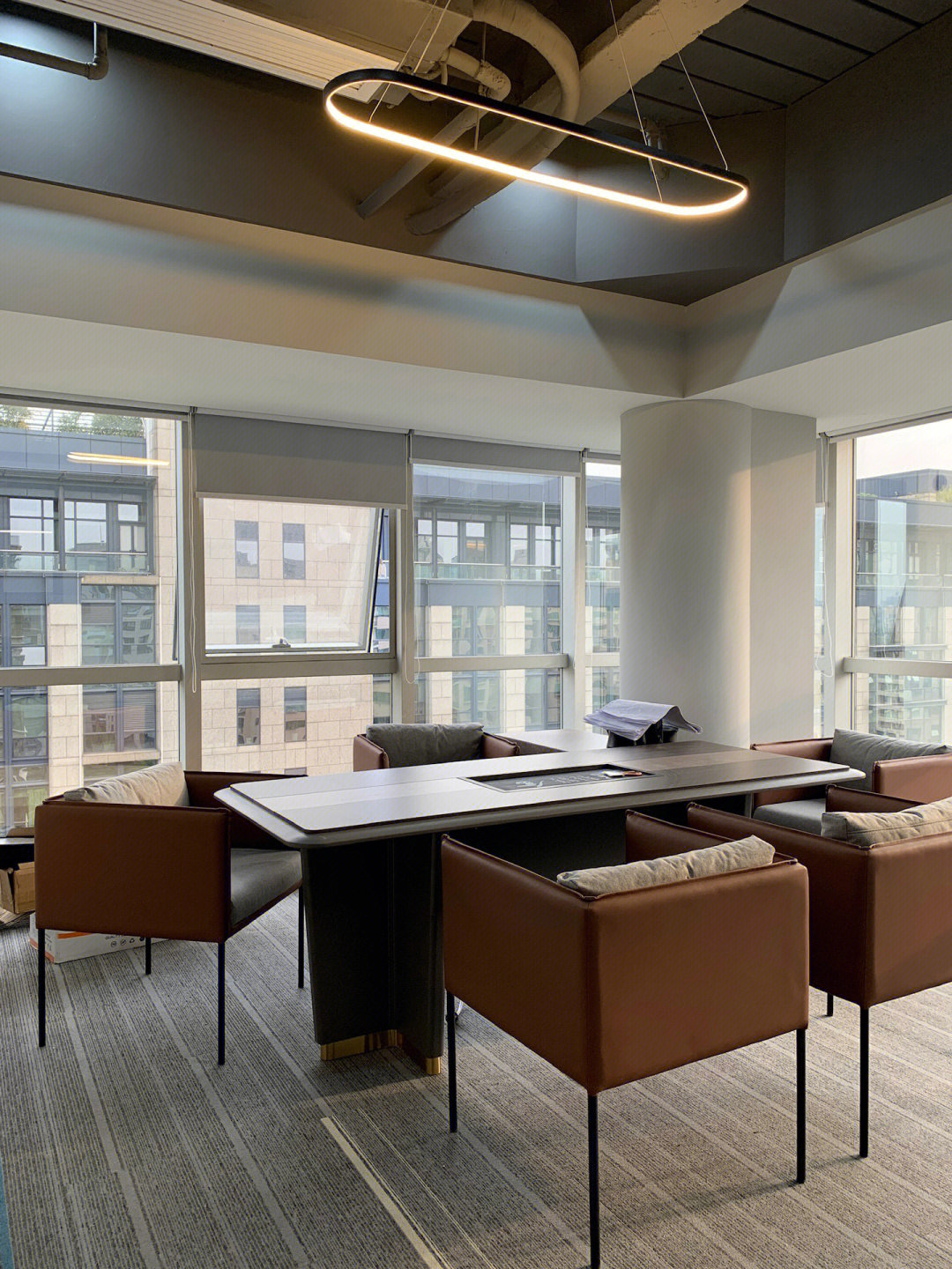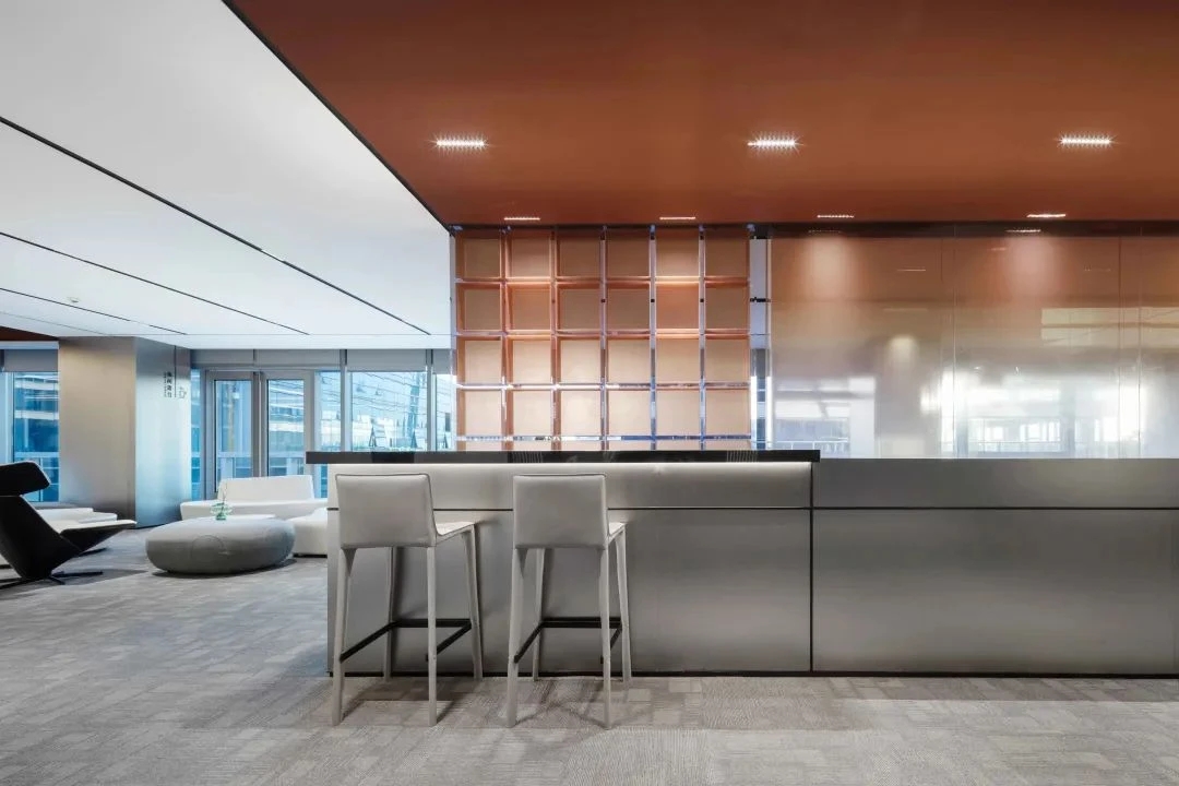 开放式的茶水间,引申到更为广阔的休闲区,风格统一的原木色系,环柱而设的收纳柜与弧形卡座的设计,柔化了整个空间。不仅增加了空间的收纳功能,还可以展示企业文化。