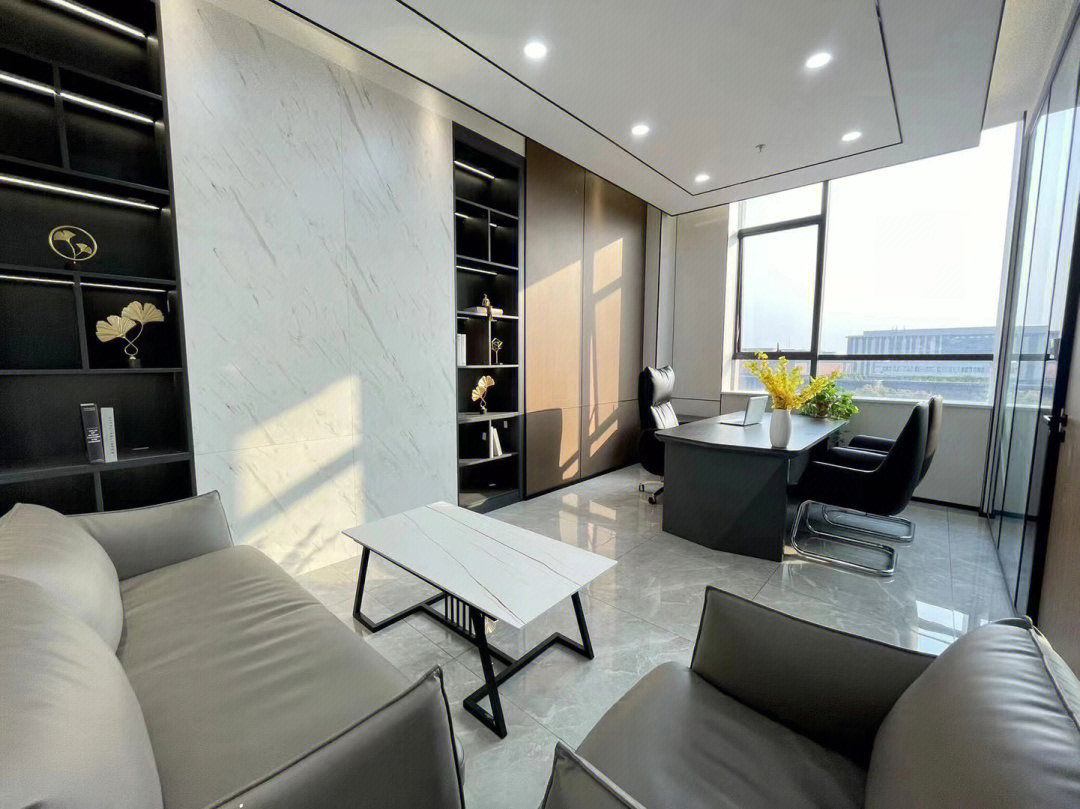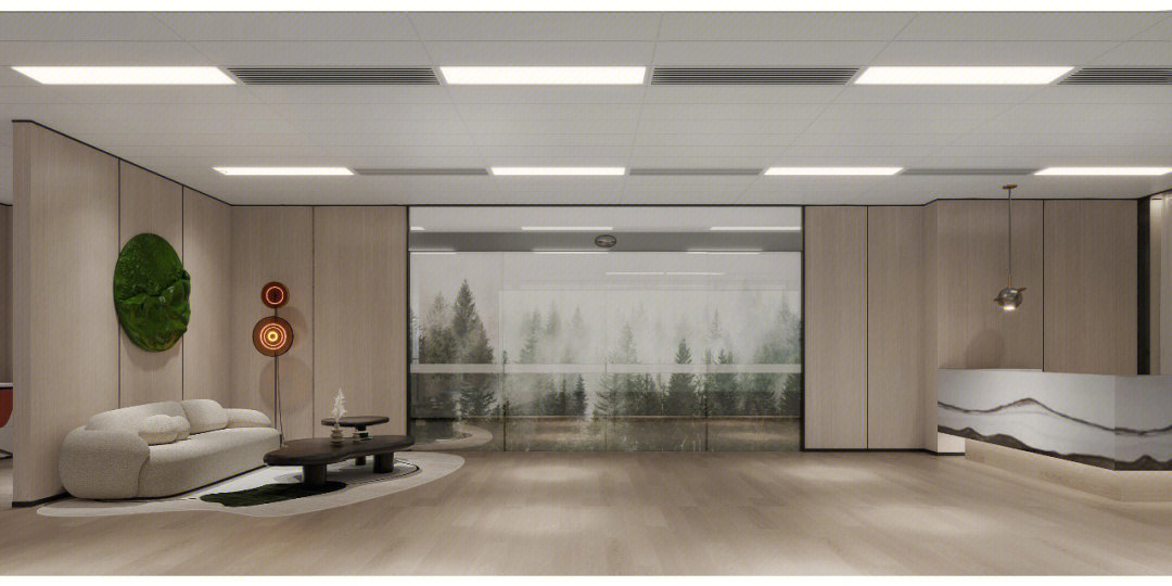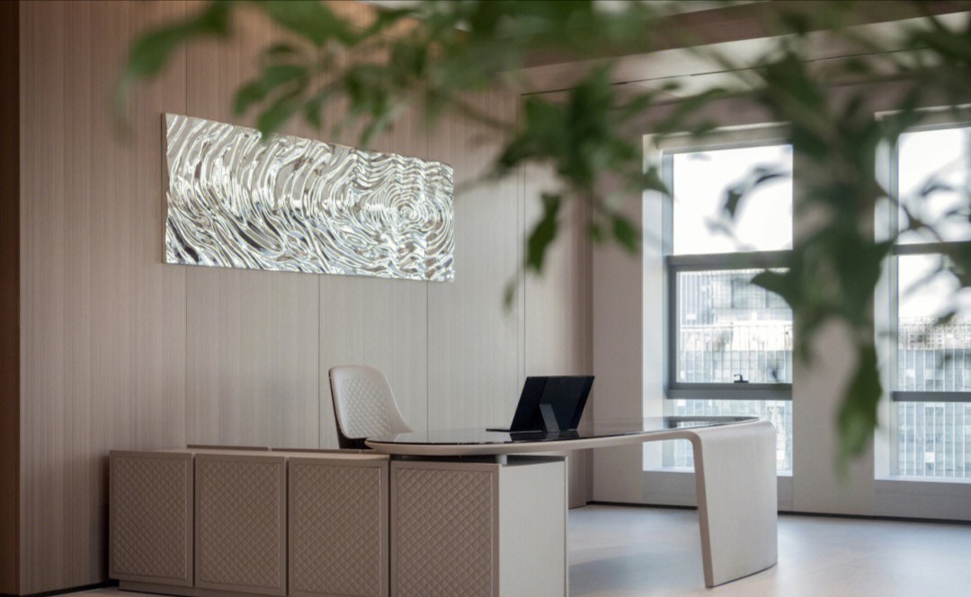 前台是特殊的半椭圆不规则空间,弧形的墙面大面使用木饰面,裁剪出像跳跃的琴键,在射灯和筒灯的映射下,突出了木饰面的纹路与光泽,营造舒适轻松的氛围。在企业logo的展示区域,点挂大面积爵士白大理石板面,与大理石地面交相呼应。
