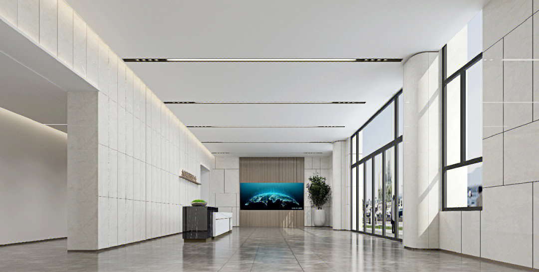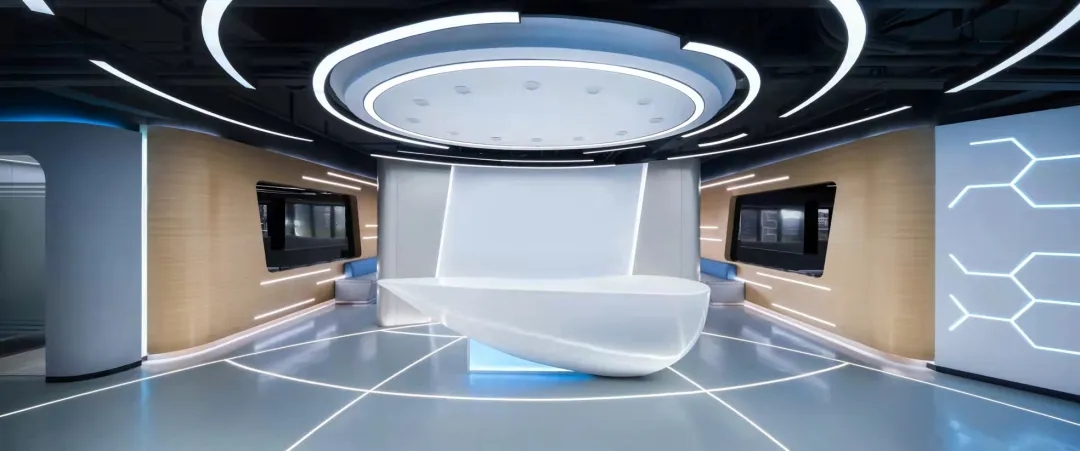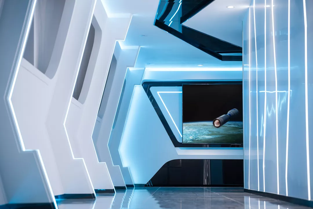 长廊连接不同空间,以航天飞船造型为灵感来源,利用焦点透视原理在一侧墙体上以纯白的折线结构模拟航空舱体形态,四周墙面也延续纯净的白色底色,以简约的线条、不规则的几何图形对整体块面进行划分,在LED灯光氛围的烘托下,科技感时空隧道在此展现。
