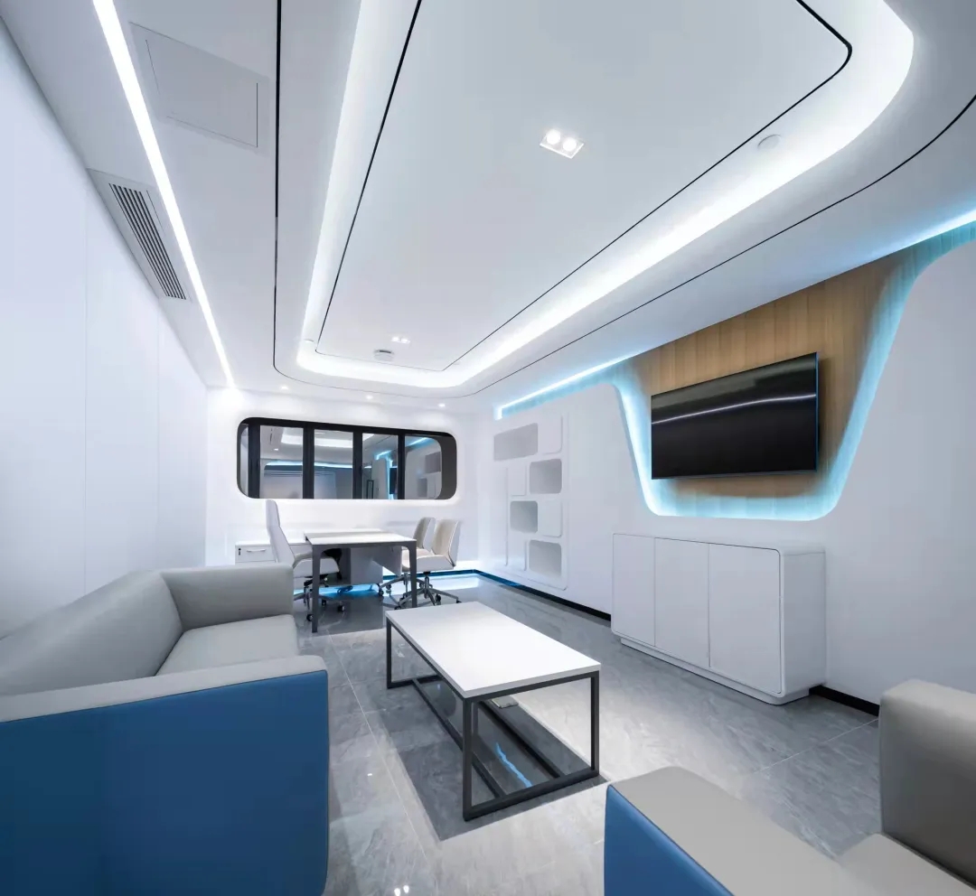 除去外向型的功能空间外,内向型的私密办公空间也不可或缺。以太空舱为空间灵感来源,通过流畅的弧形线形以及灯光的勾勒构建独立办公室,以未来科技感契合公司调性,营造行业特性与工作氛围的呼应感。