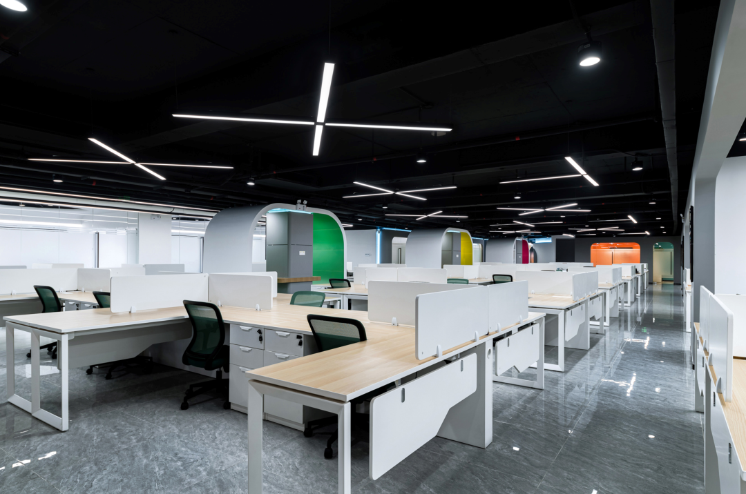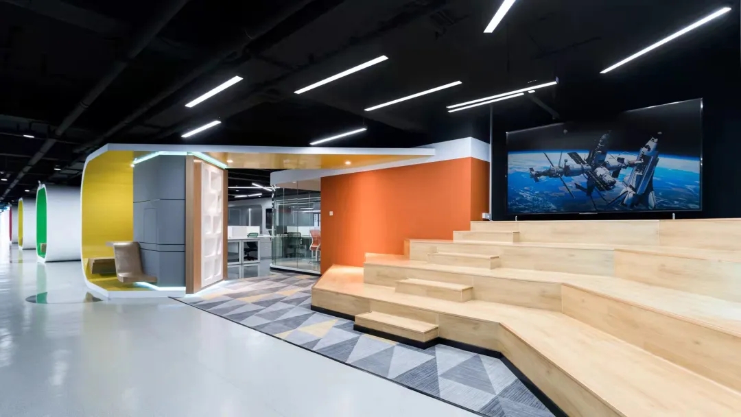 喷黑的天花将宇宙黑洞的元素延展,以相对独立的“工作站”(Station)全角度拼合的方式呈现,营造出舒适放松的弹性办公氛围。自由开敞的空间方便随时转换工作方式,以人为本提供便捷的沟通场所,让各式思维在此碰撞出新创意。