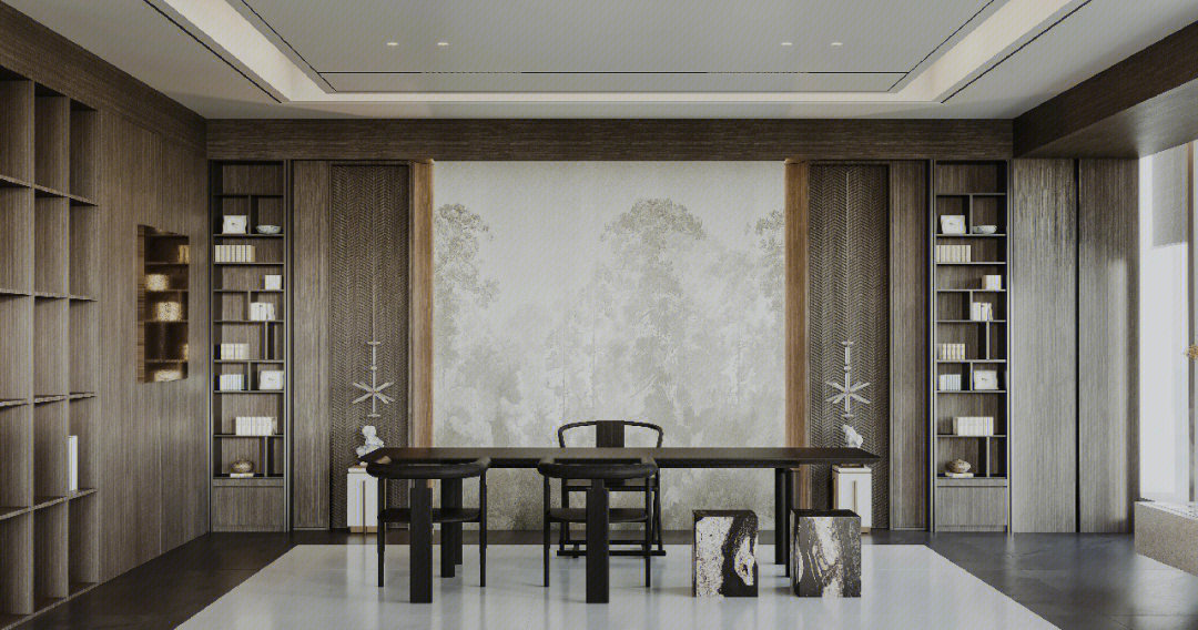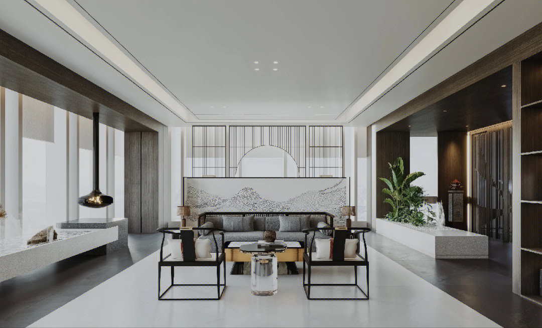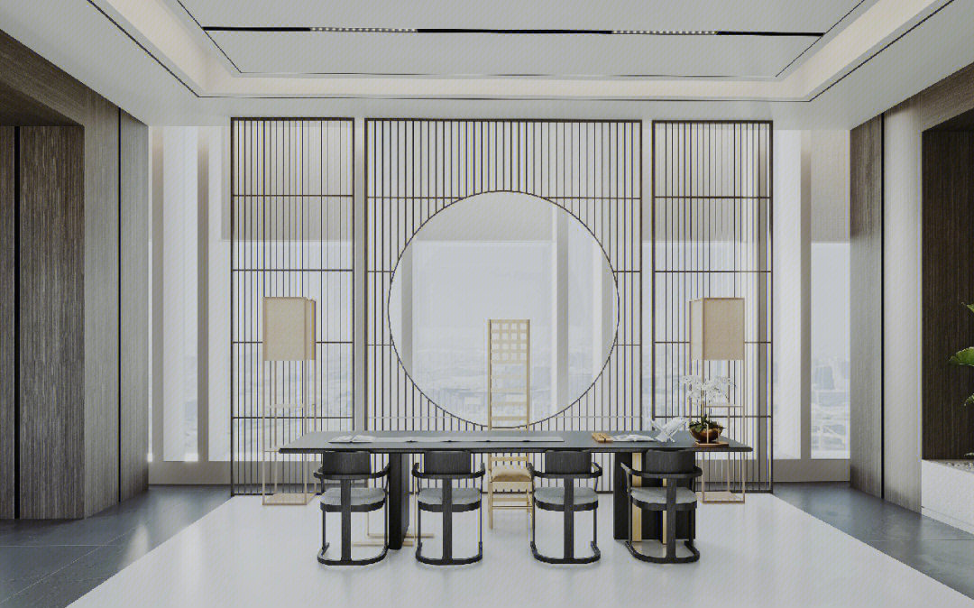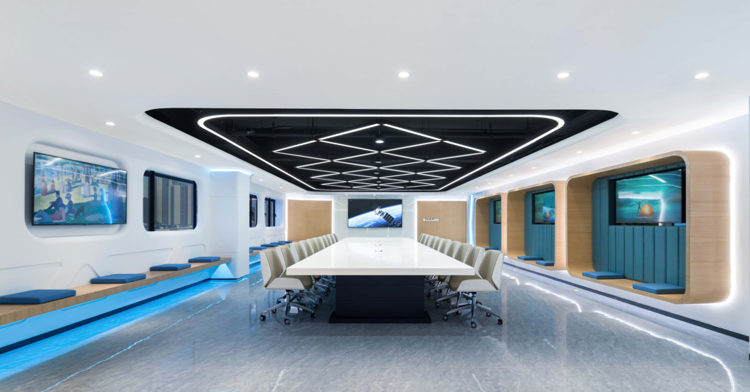 与接待室相通,设置了开阔明亮的大型会议室,与前厅相似的黑色背景搭配几何线型灯光的天花,将包含宇宙空间秘密的黑洞元素延伸至此。