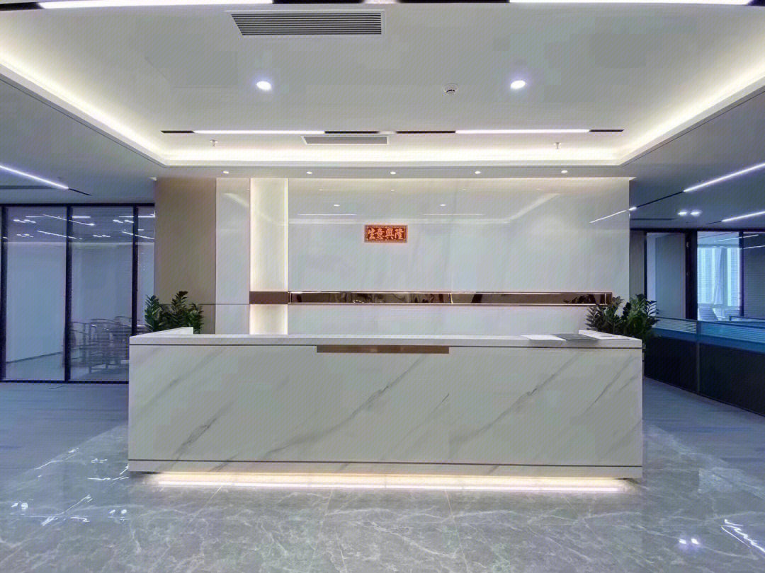 踏入前厅,以圆形顶为视觉中心向外发散,黑色天花背景喻指暗无边际的黑洞。圆形顶下水滴状流线型接待台在极具光感的方形底座支撑下呈现一种向上动态感。