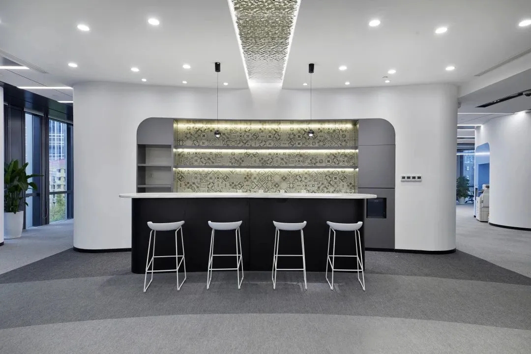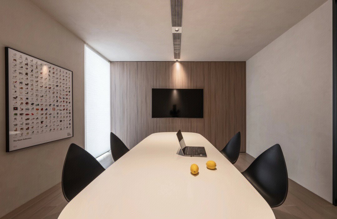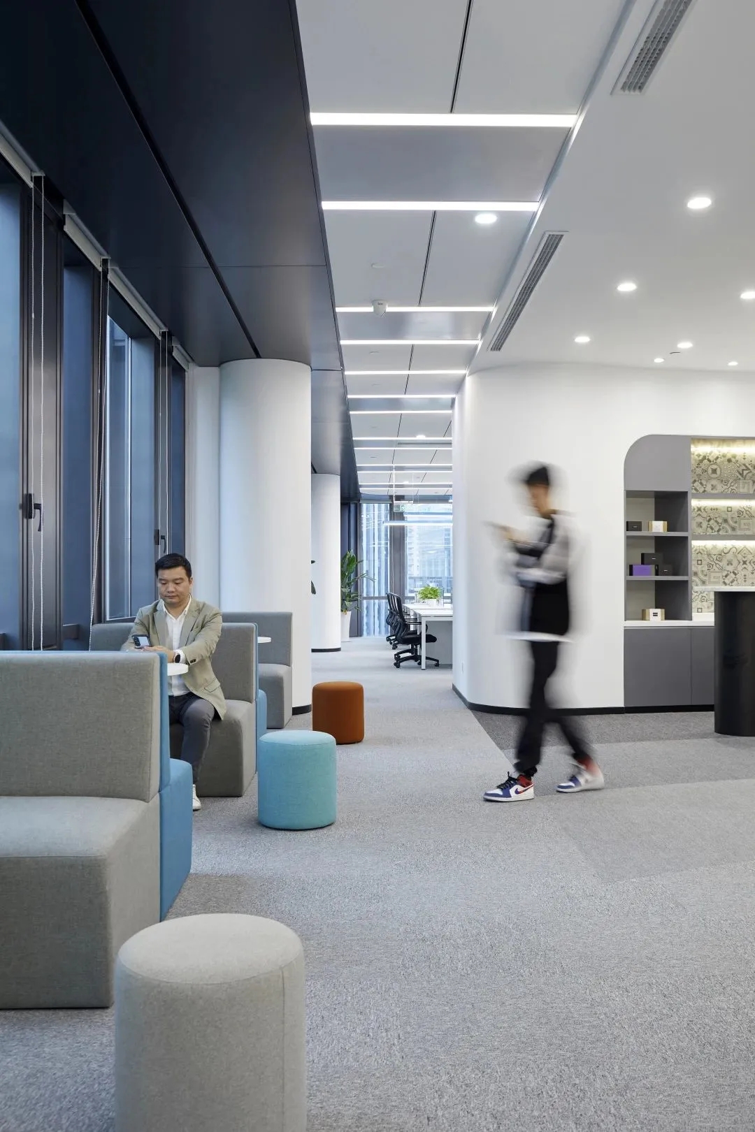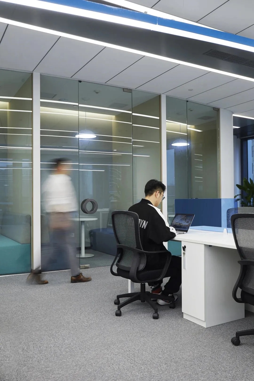 相对于空间的隐私性,甲方更希望能够随时兼顾到企业员工的工作状态。因此设计师从功能性的角度考虑,选用雾化玻璃作为隔断,既保证了空间的隐私性,又让使用者对空间拥有了更灵活的掌控感。