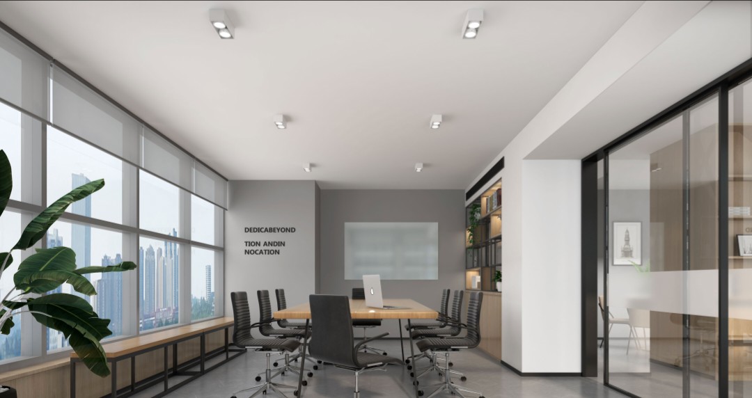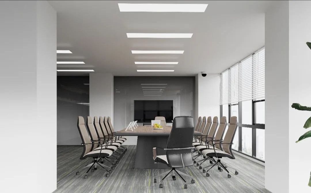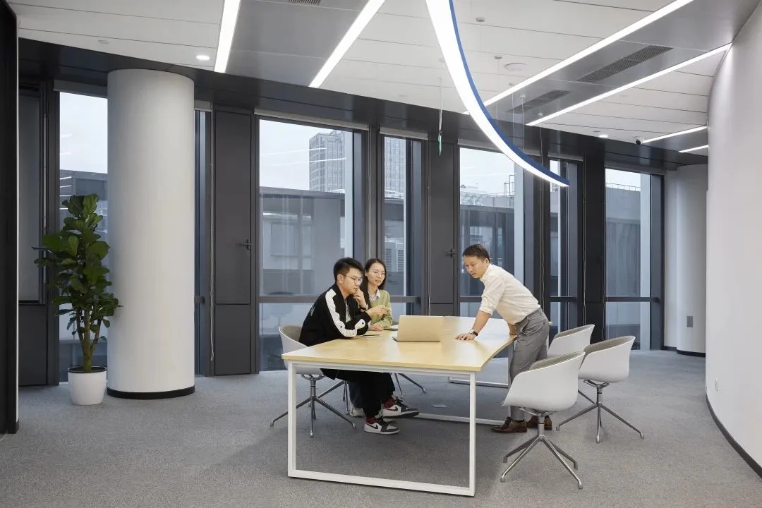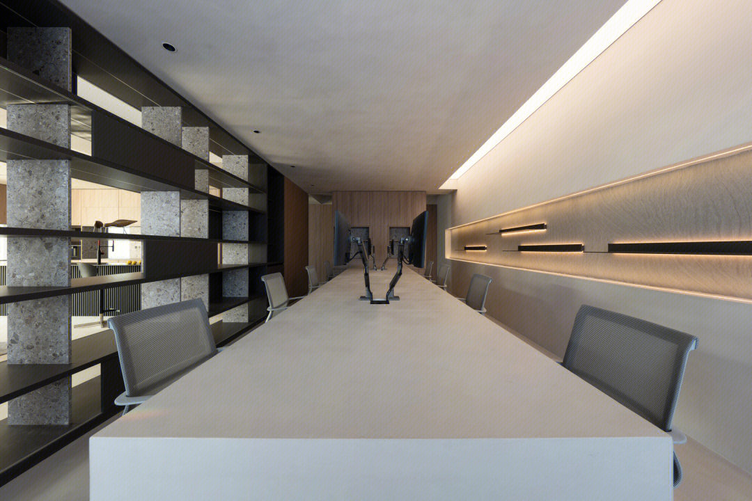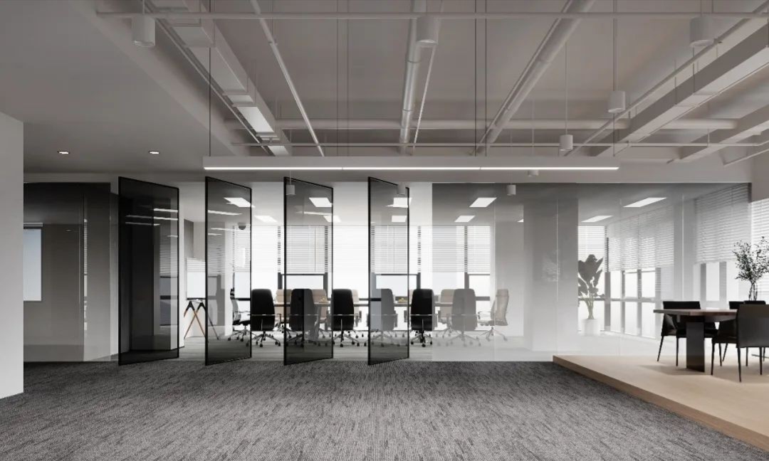 不同于传统的办公模式,开放型的办公模式更适应于新办公时代的诉求。在大会议室的设计中,设计师选用玻璃材质的旋转门重新定义了空间的边界,借着视觉的延伸,给人更开阔的空间感受。