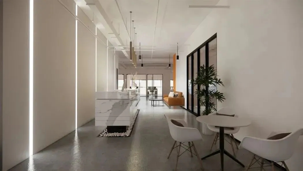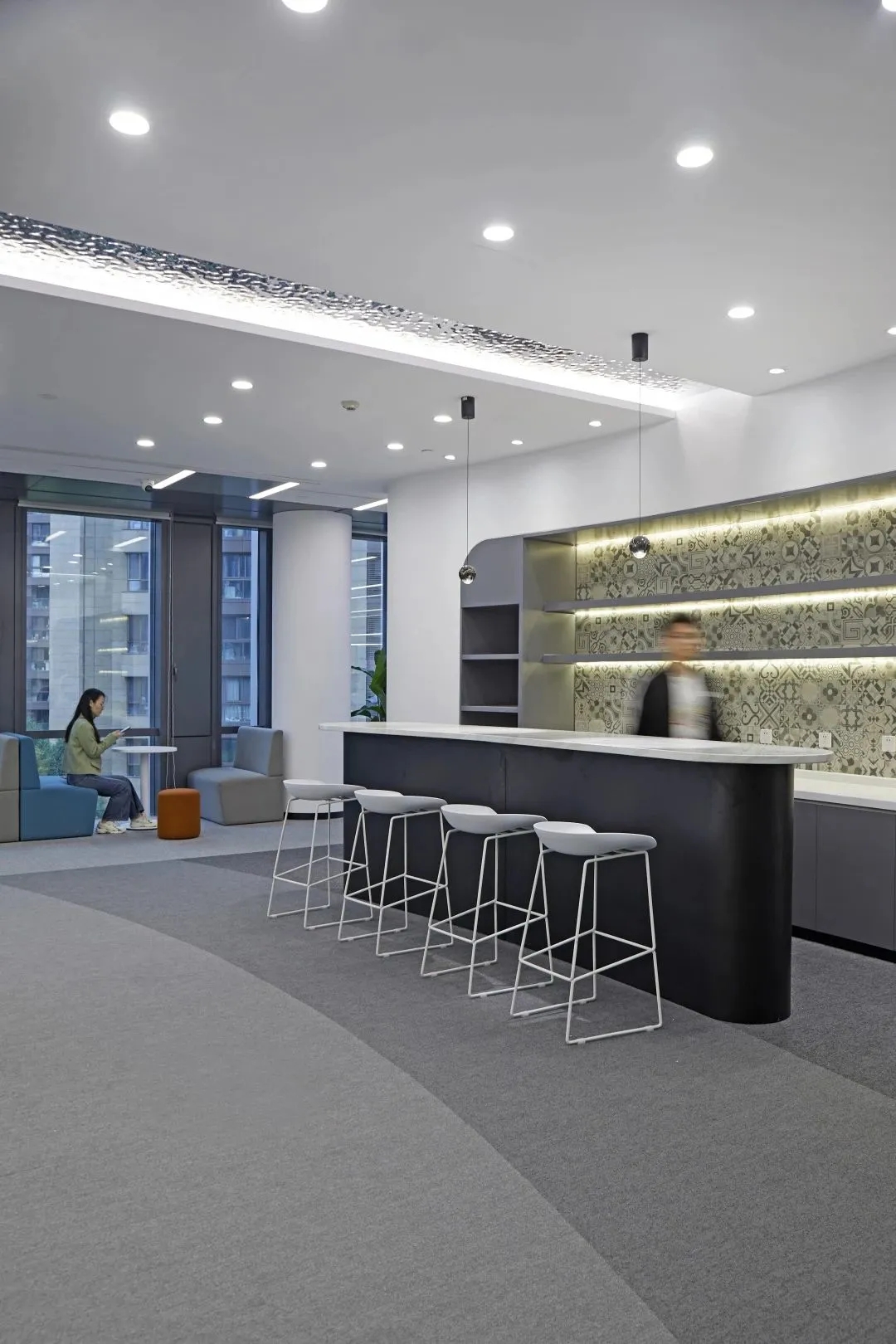 整个办公空间为常见的L型结构,设计师希望通过设计把建筑本身的优势发挥出来。在客户接待区的规划上,设计师采用横向布局的方式,结合线性元素强调着空间的横宽比,延伸出视觉的开阔性。