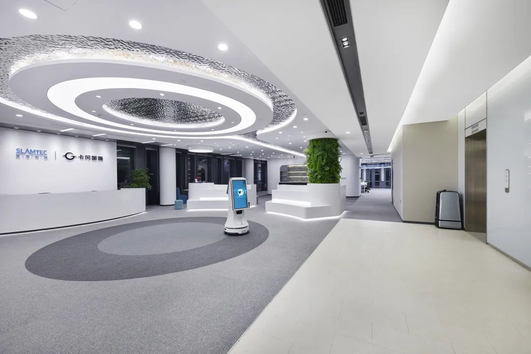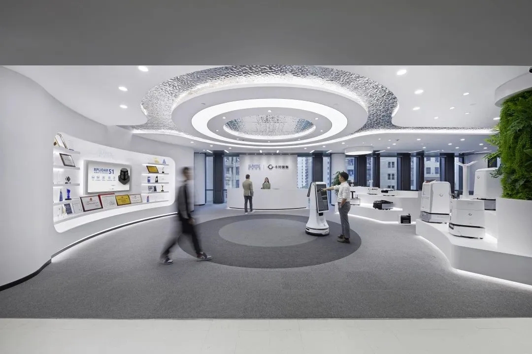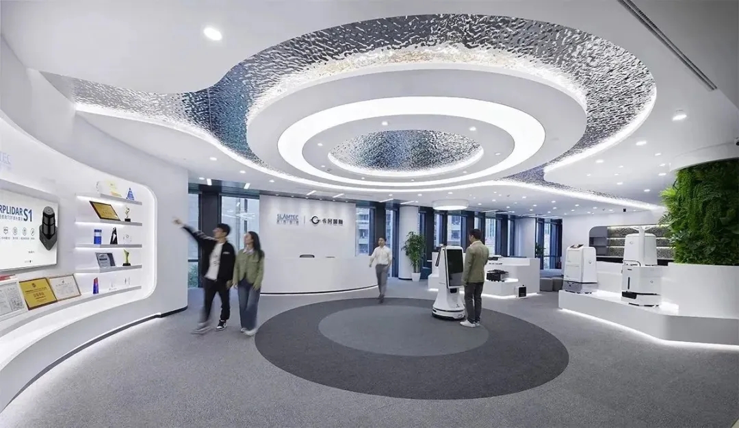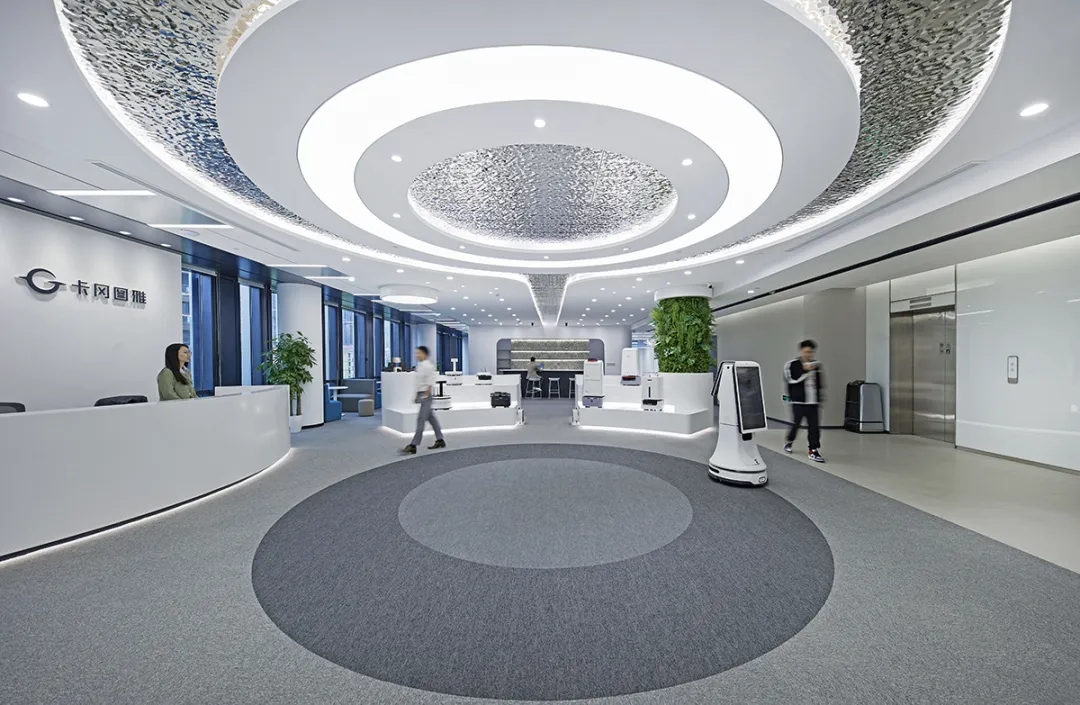 产品体验厅顶部“卡冈图雅”图形,让人的视觉中心向外发散,水波纹的圆心中心喻指暗无边际的黑洞,它仿佛是通向宇宙未来的窗口,就像 《星际穿越》这部电影中,主人公为了人类未来跳入卡冈图雅黑洞,隐喻着人类对科技文明的勇敢探索,也传达出企业的创新品牌观念。