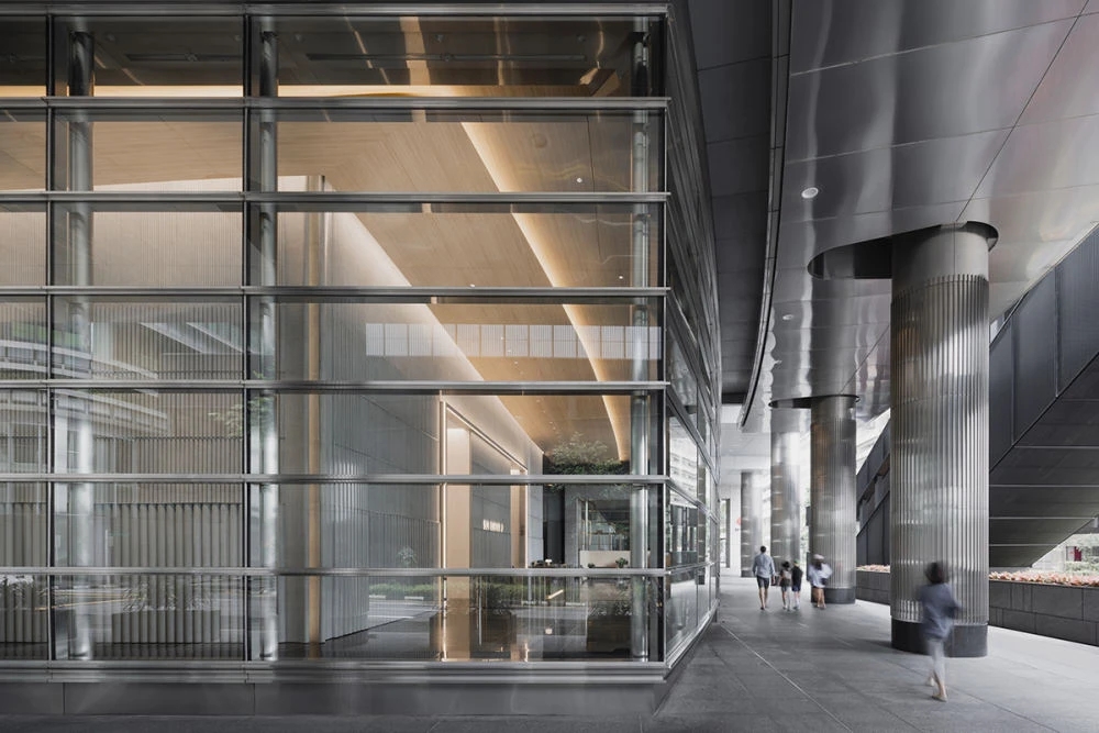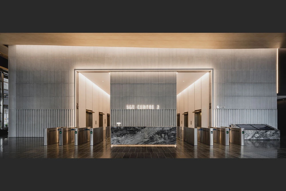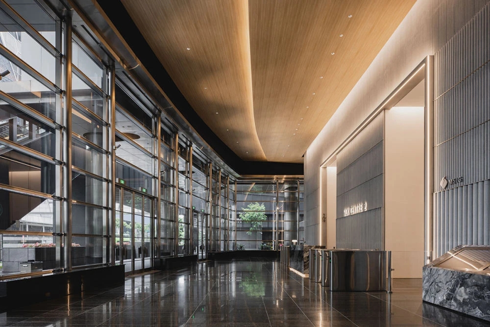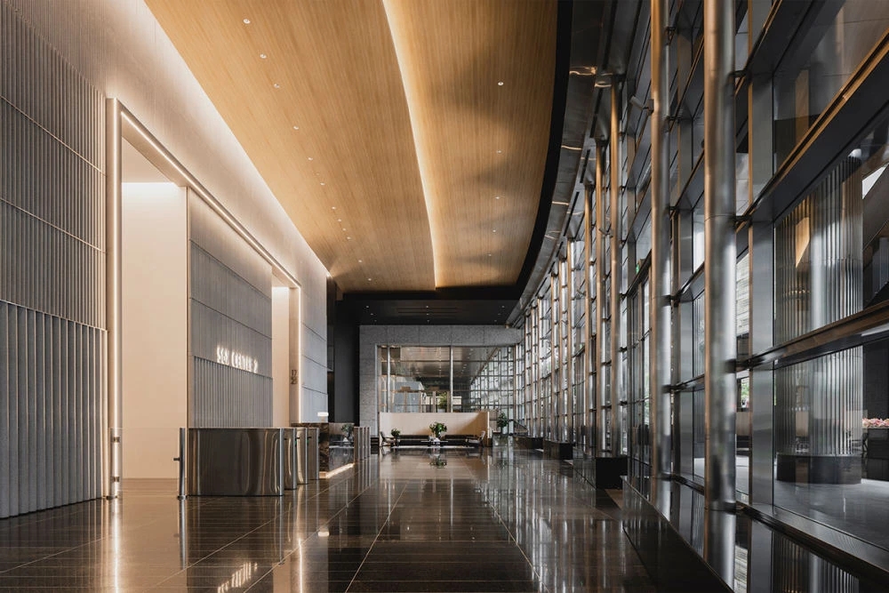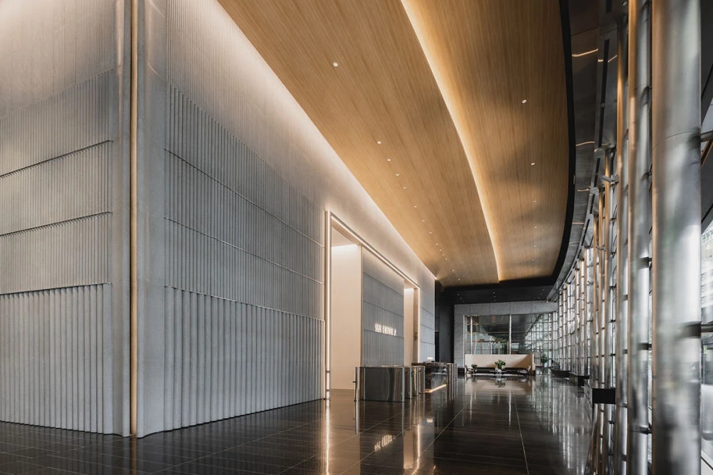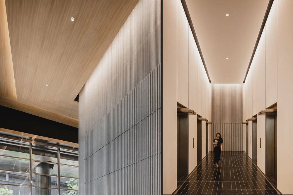 空间中产生了两个关键元素:花岗岩墙和弯曲的天花板。墙面的灵感来自竹林(快速和无尽生长的象征),底部有较大的“茎”,支撑着上面较细的“芽”。垂直石材轮廓的重复也代表着统一、可靠和负责。花岗岩因其能够传达坚定不移的稳定性而被使用。向天空弯曲的天花板象征着新加坡置地集团不断向上攀登至最高点。它们采用木质外观饰面,让人联想到纸薄单板的轻盈感,进一步突出了飞行的感觉,同时也为空间注入了崇高的品质。通过使用朴素的材料和对最精致细节的关注,创造了一个具有前瞻性和永恒性的大堂,从而巩固了新加坡置地集团在下一代及以后的地位。