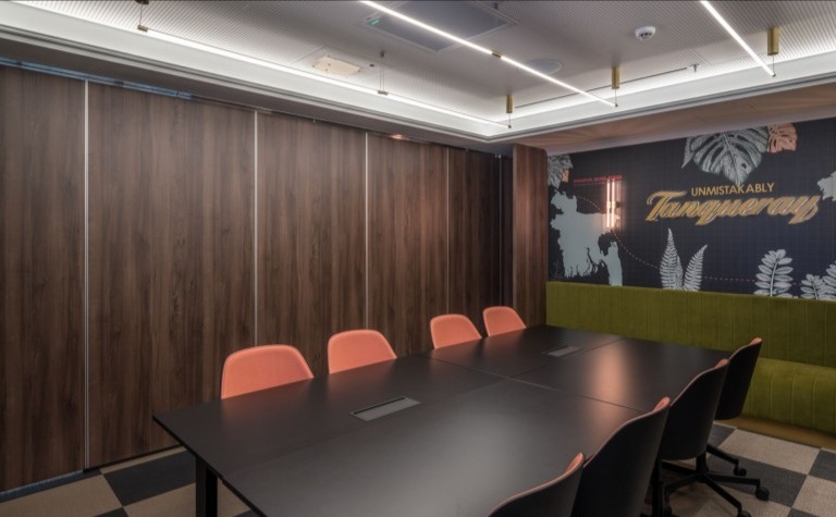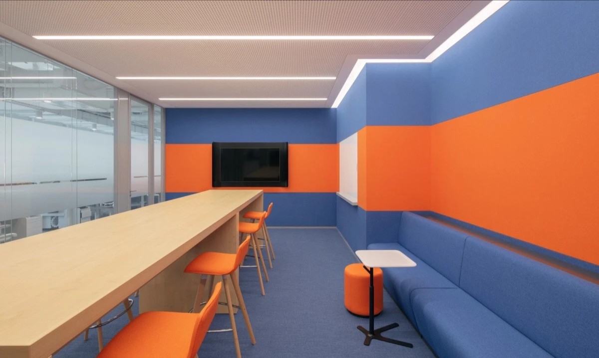 设计以灰色和白色为基调,巧妙加入企业标准色-橙色。厚重的暖灰色铜板简笔勾勒,干净利落,搭配简单的木质墙板,使整个空间硬朗低调又不失朝气和活力。