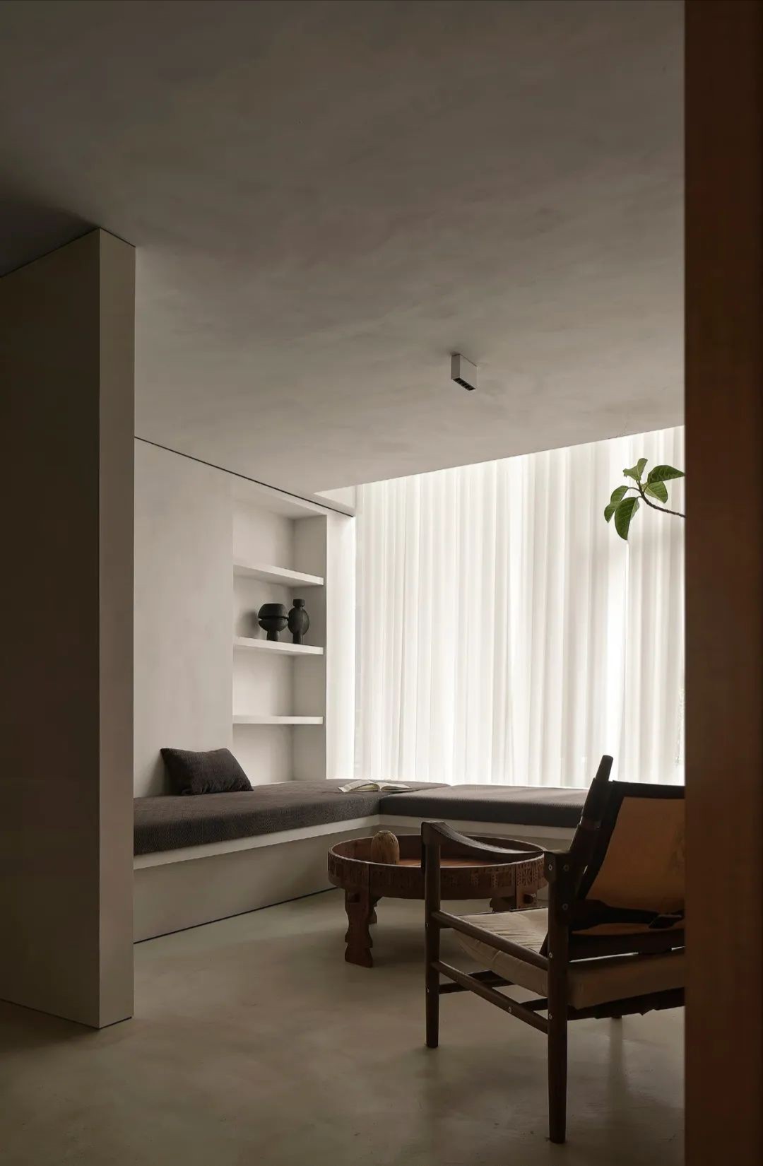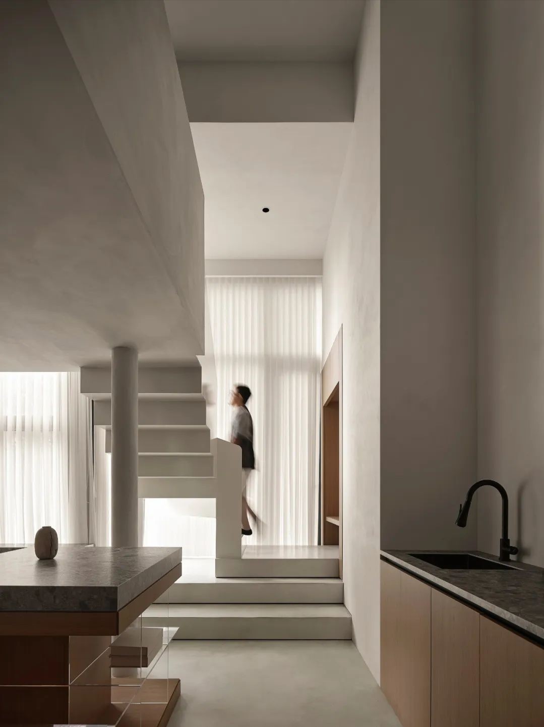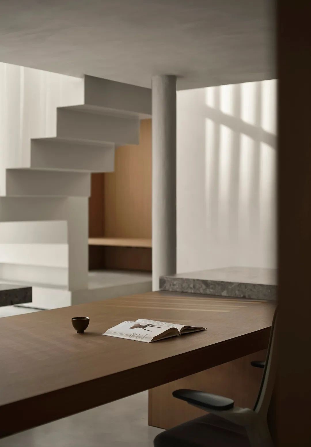 竖向挺立是重力最直白的表达,柱子支撑向上扭转的楼梯,同时亦承担公区转至私区情绪的功能,大尺度玻璃窗引汇天光,空间在水平和垂直方向上都得到扩大,室外自然之色框以为景,营造视野与心境的双重开阔。