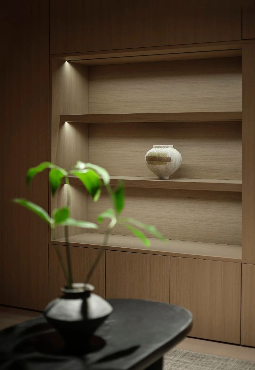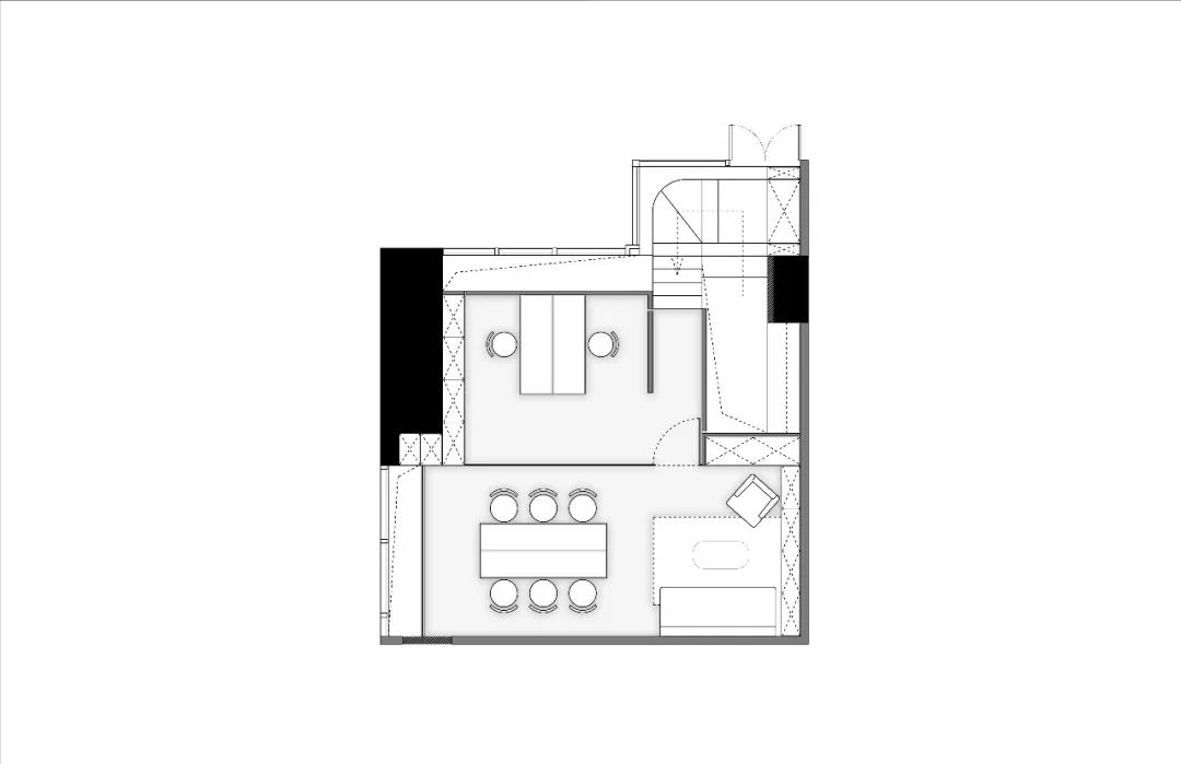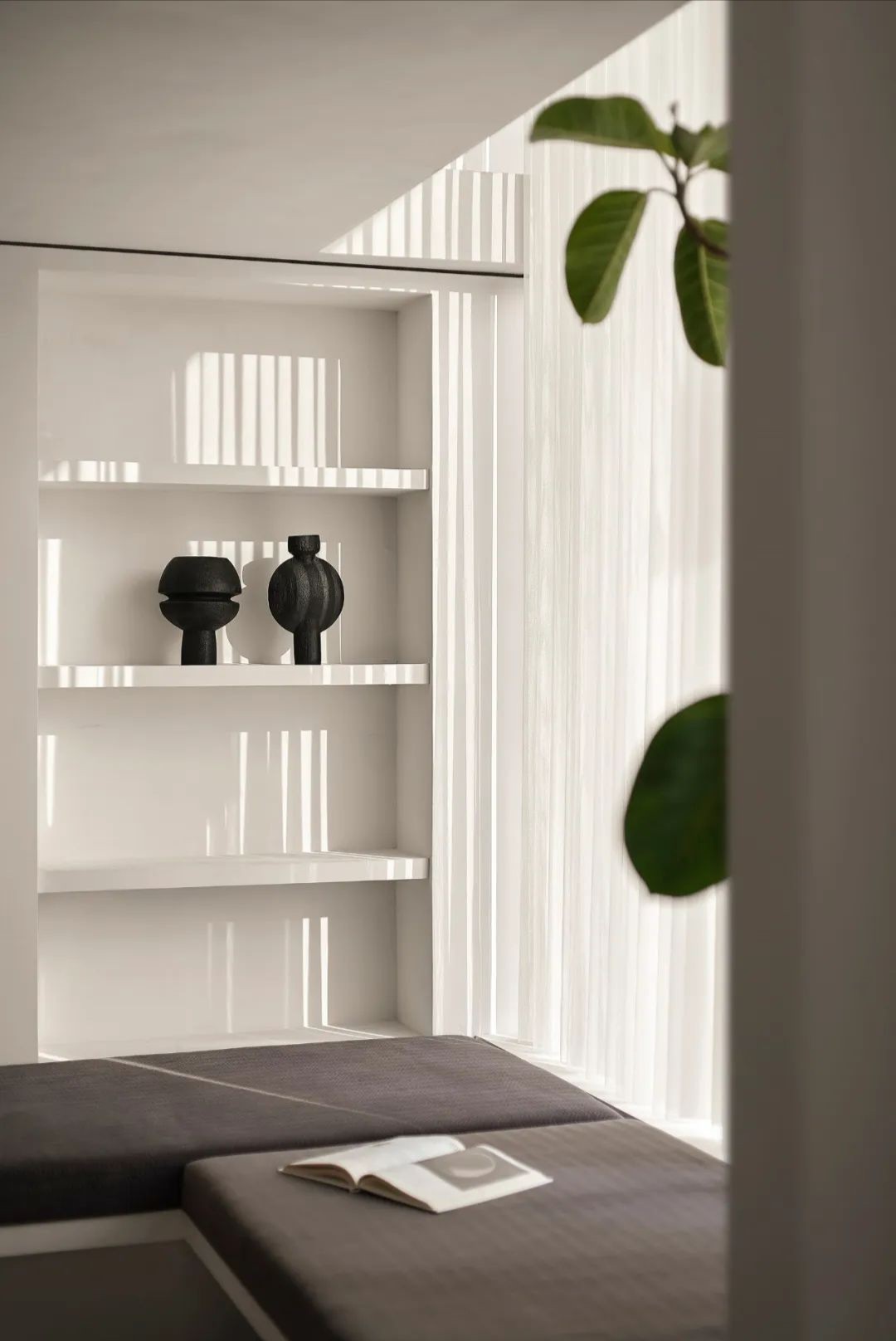 竖向挺立是重力最直白的表达,柱子支撑向上扭转的楼梯,同时亦承担公区转至私区情绪的功能,大尺度玻璃窗引汇天光,空间在水平和垂直方向上都得到扩大,室外自然之色框以为景,营造视野与心境的双重开阔。