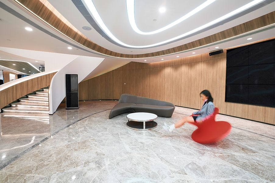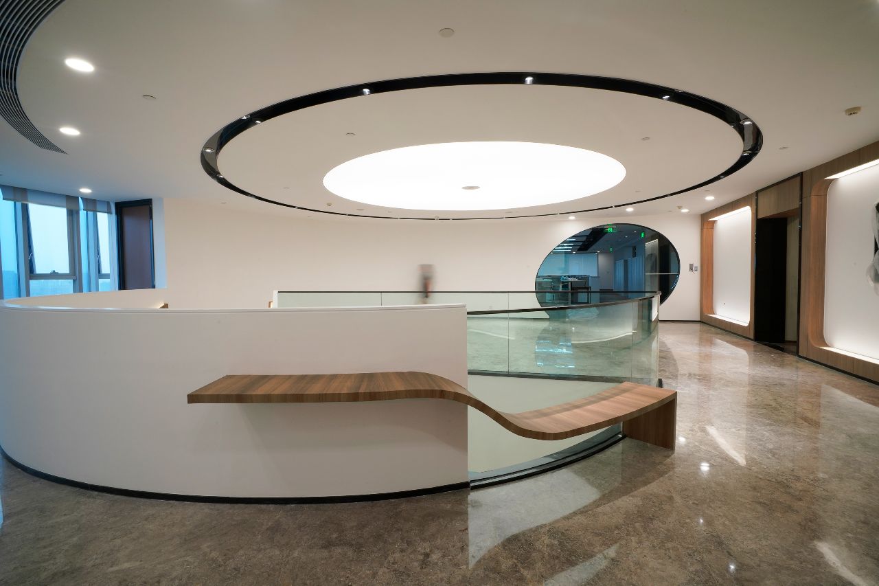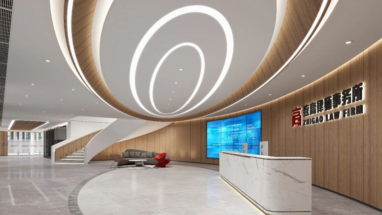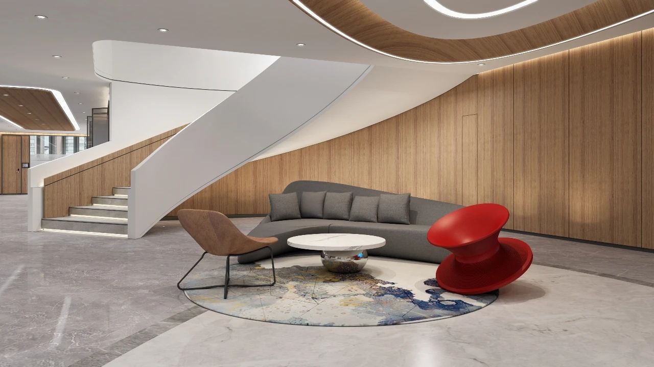 传统的律所给人一种严肃、古板的感觉,正因如此,我们在大厅以太极为灵感,设置了旋转楼梯,以一种柔和的线条拉近了律所给我们的一种距离感,让两层空间有了延伸,交叠呼应,营造出了多维的视觉效果,同时打破对办公室的刻板印象,拥有宽敞开阔的待客区域,层次、纹理、美感、功能性、丰富而厚重.
