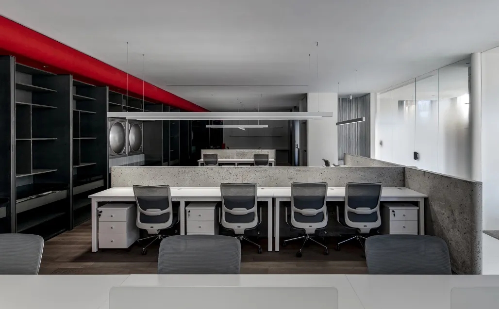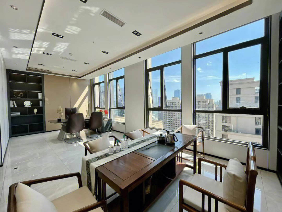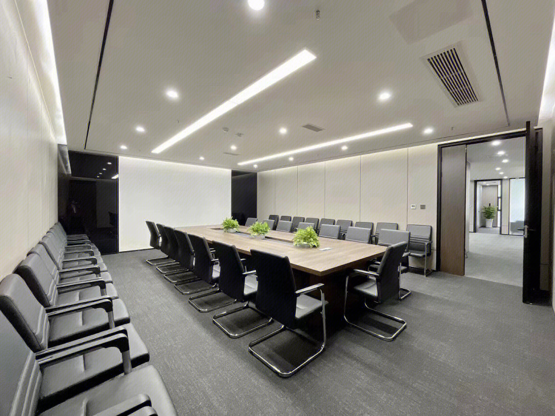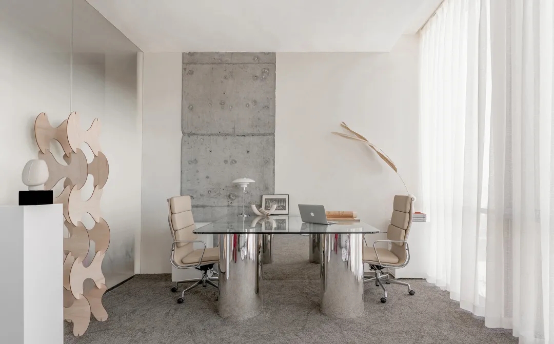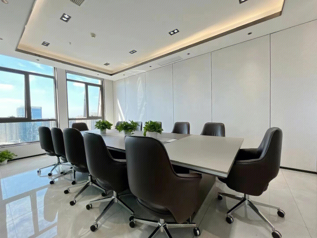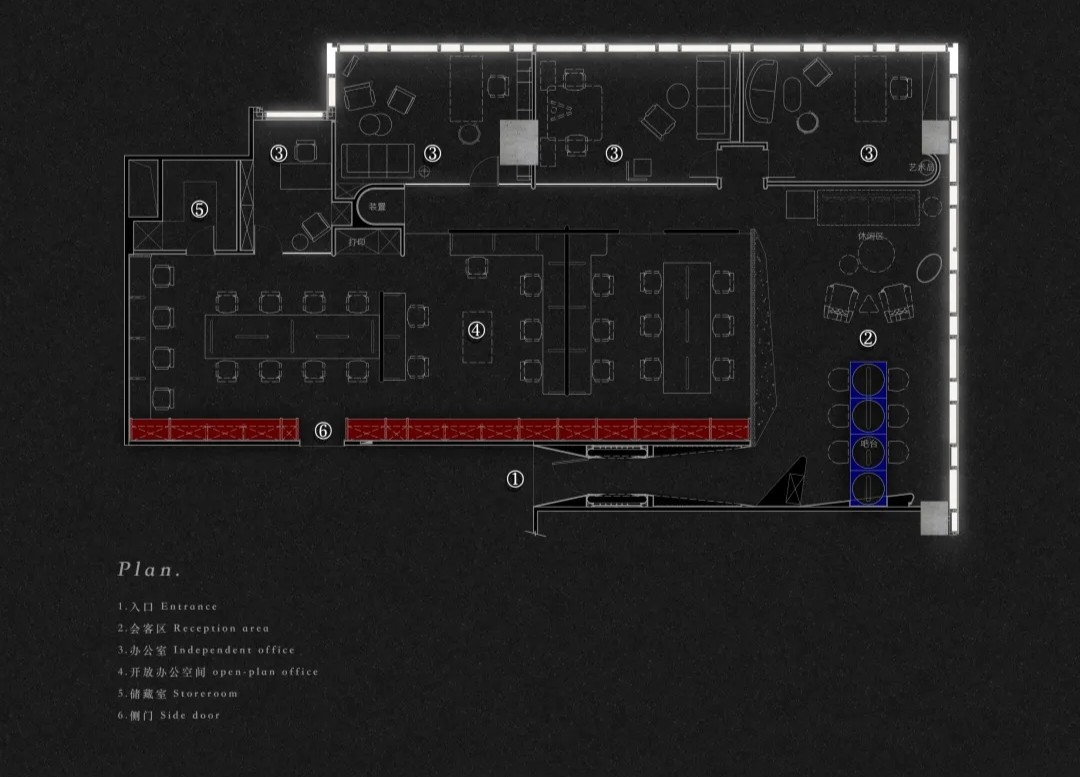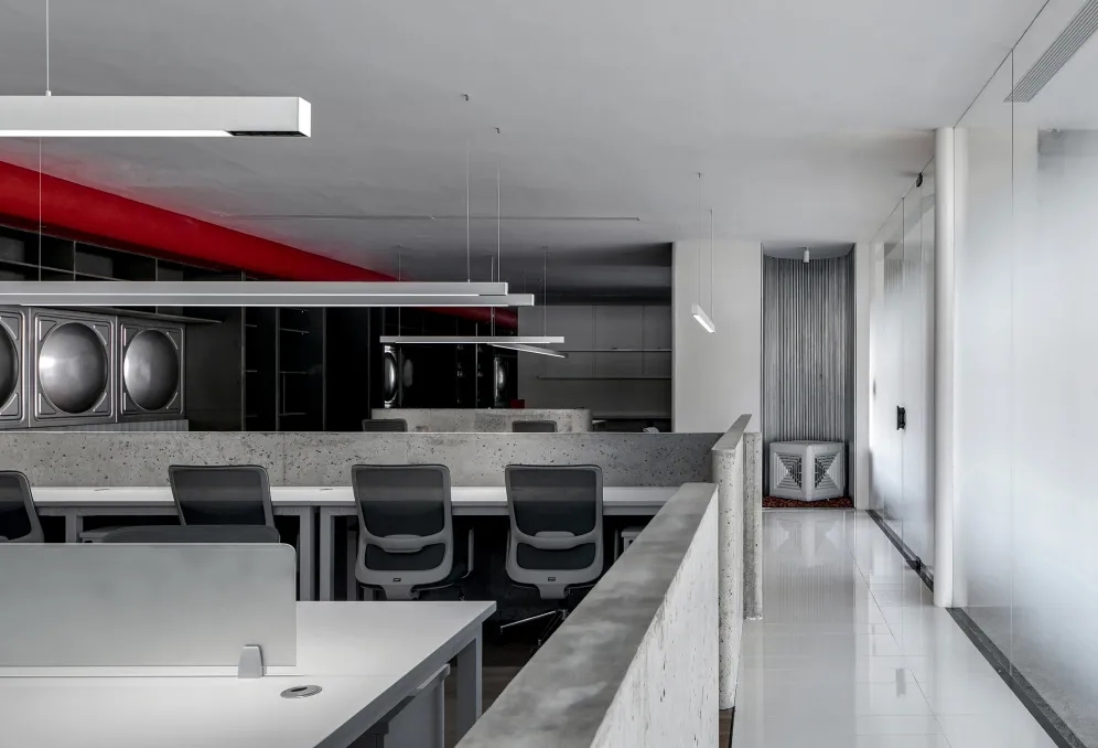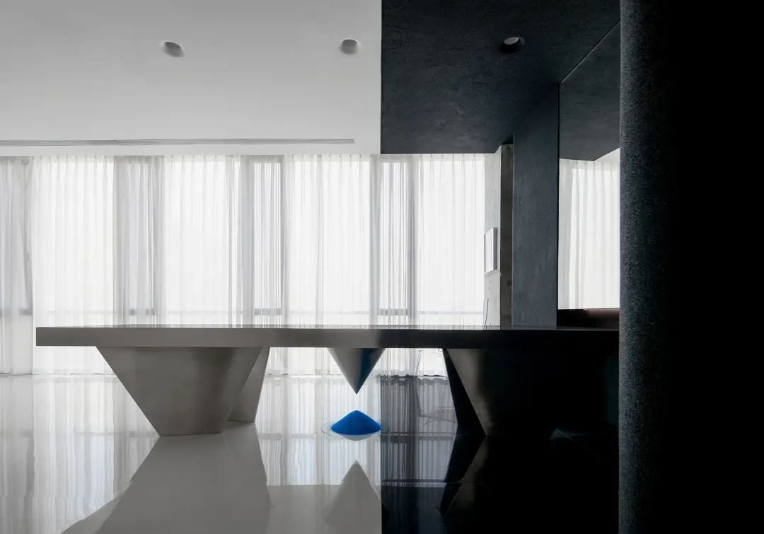 层层递进的空间划分,贯穿整个项目空间。入口处,我们采用了黑色的艺术涂料以及斑驳的金属钢板,黑洞一般地大面积吸收了光,黑色的体块与白色的会客区域形成了一道从地面至顶面的分割线,远处的明亮的落地窗此时更加明亮,如在隧道迈向出口引导步伐。