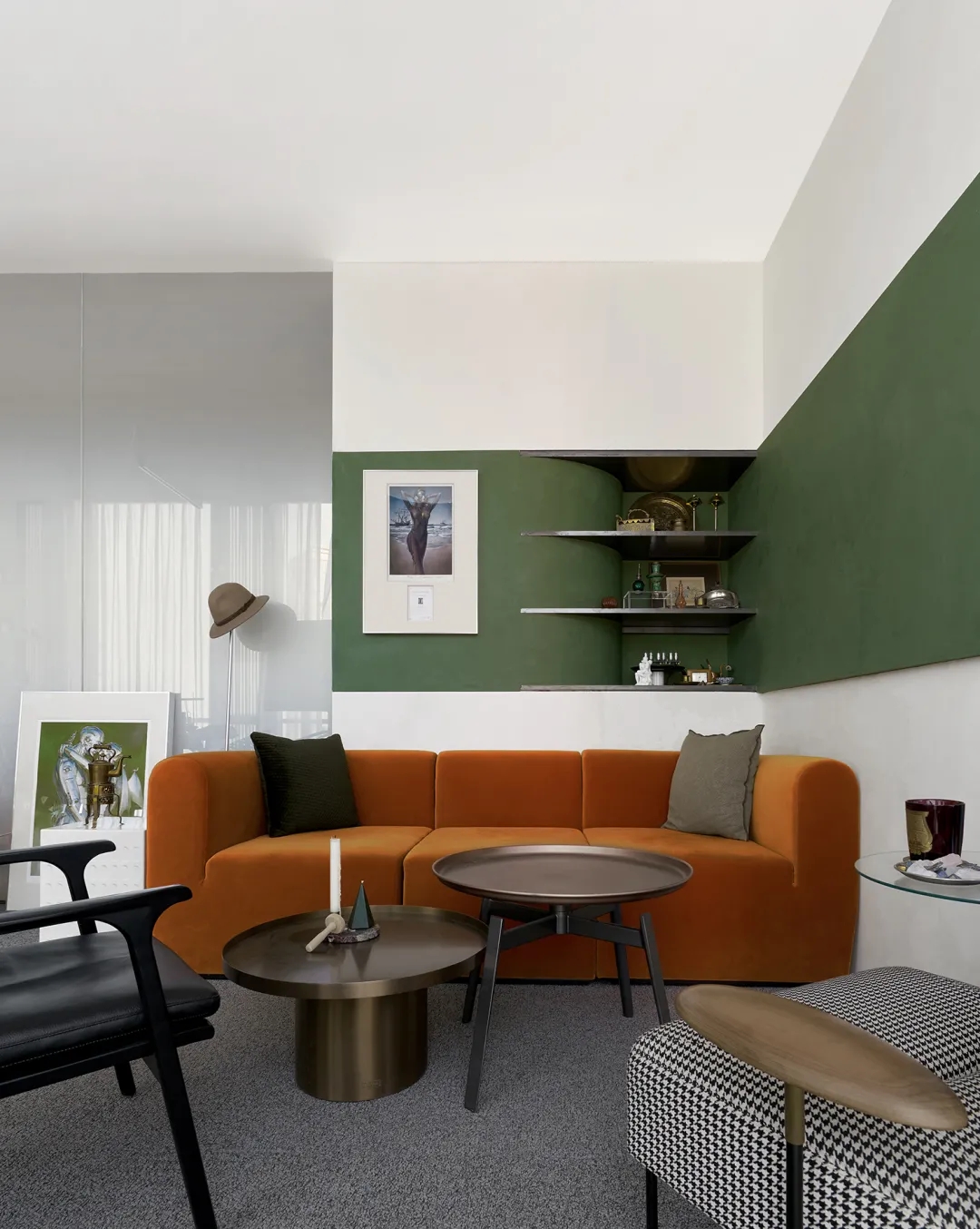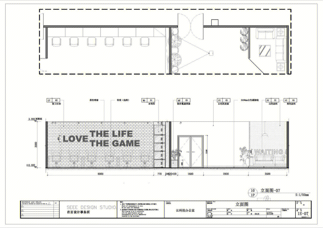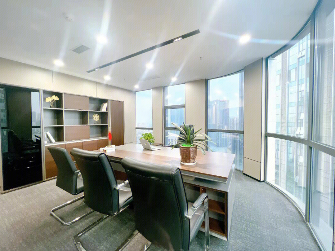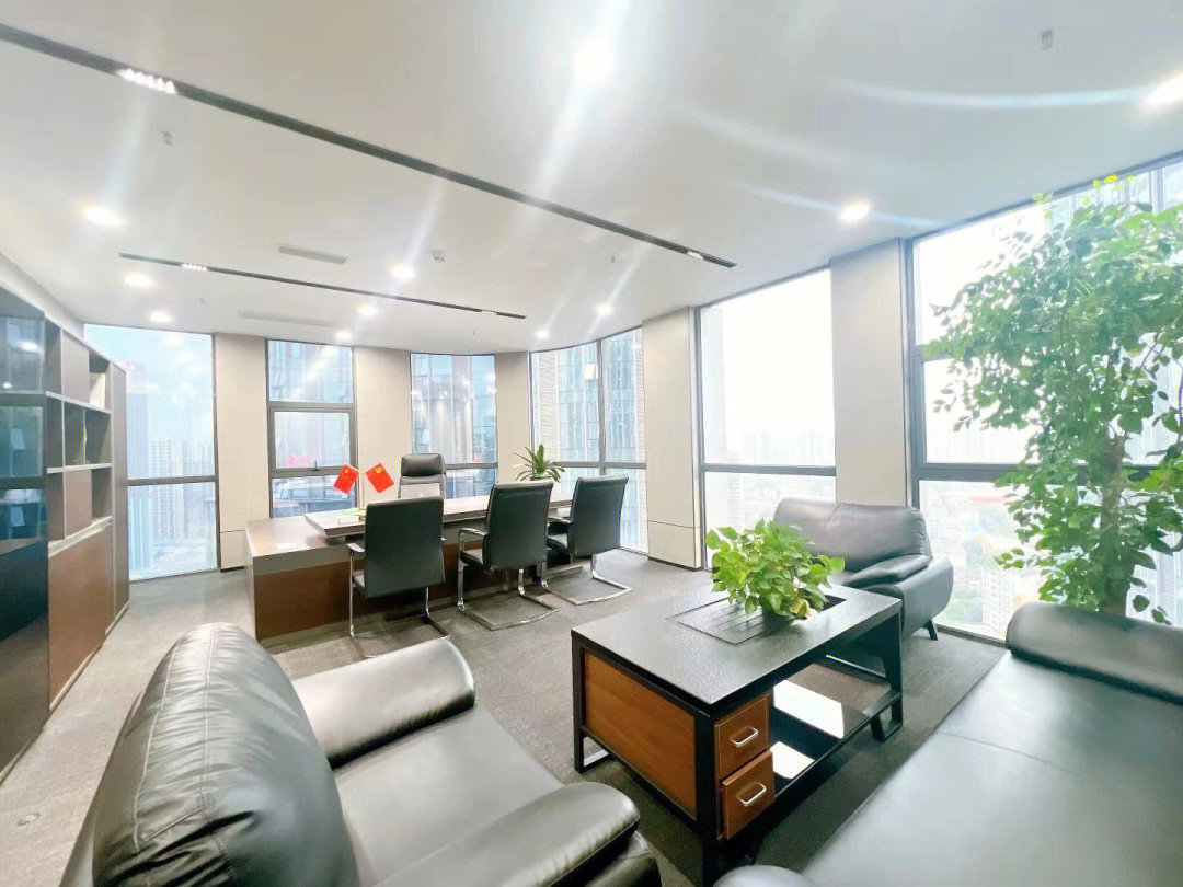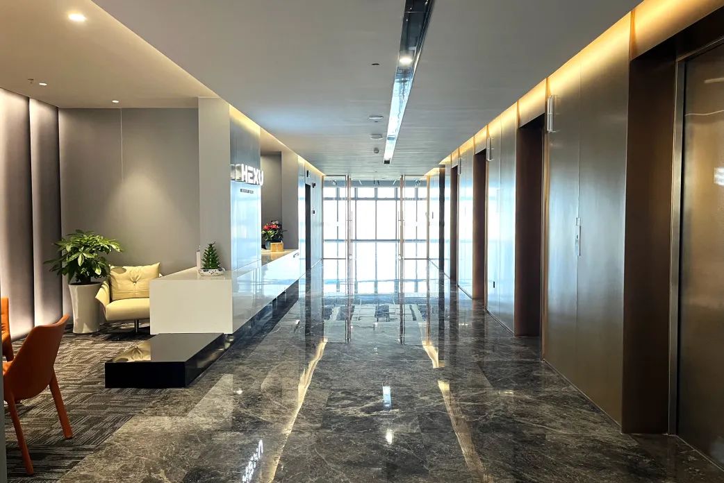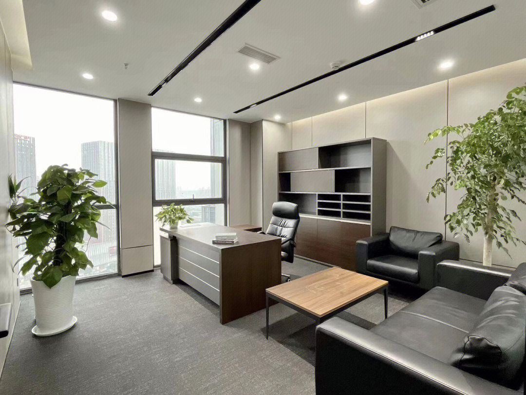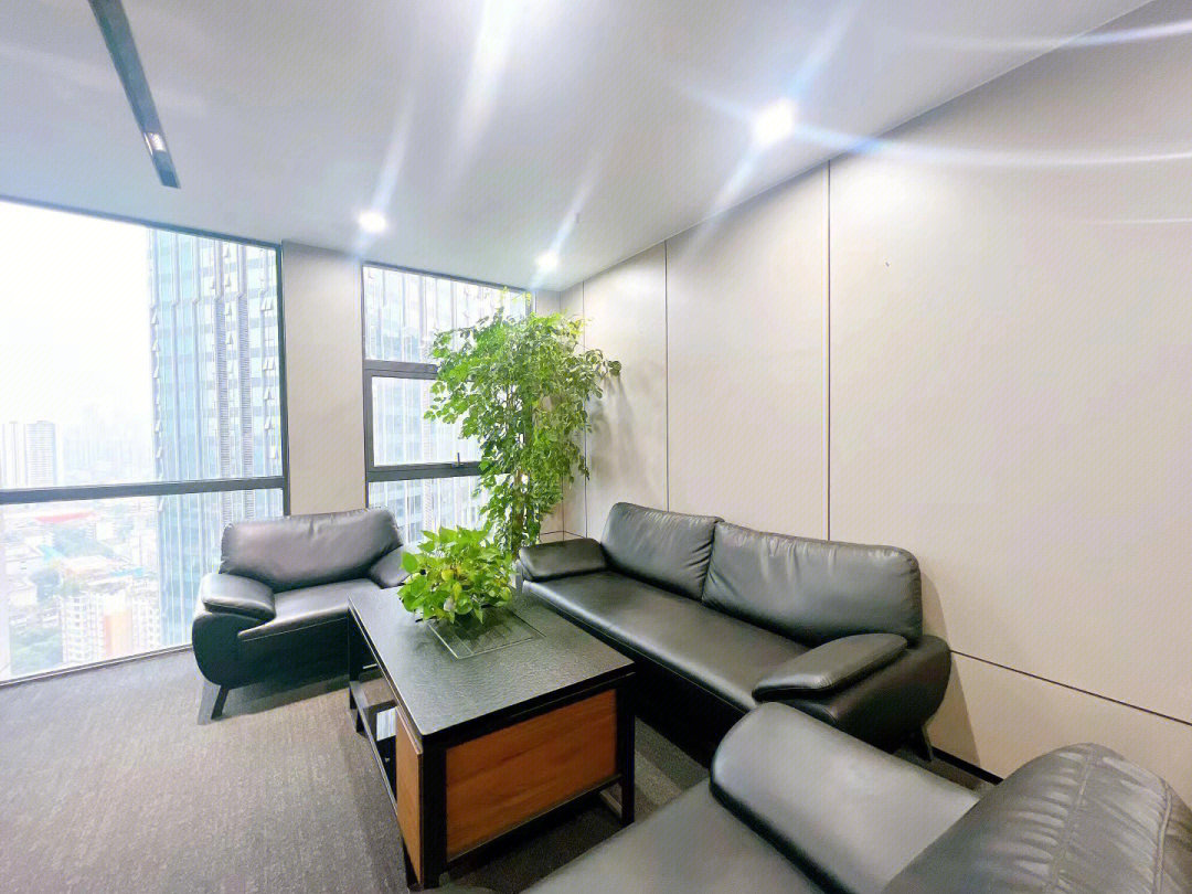 层层递进的空间划分,贯穿整个项目空间。入口处,我们采用了黑色的艺术涂料以及斑驳的金属钢板,黑洞一般地大面积吸收了光,黑色的体块与白色的会客区域形成了一道从地面至顶面的分割线,远处的明亮的落地窗此时更加明亮,如在隧道迈向出口引导步伐。