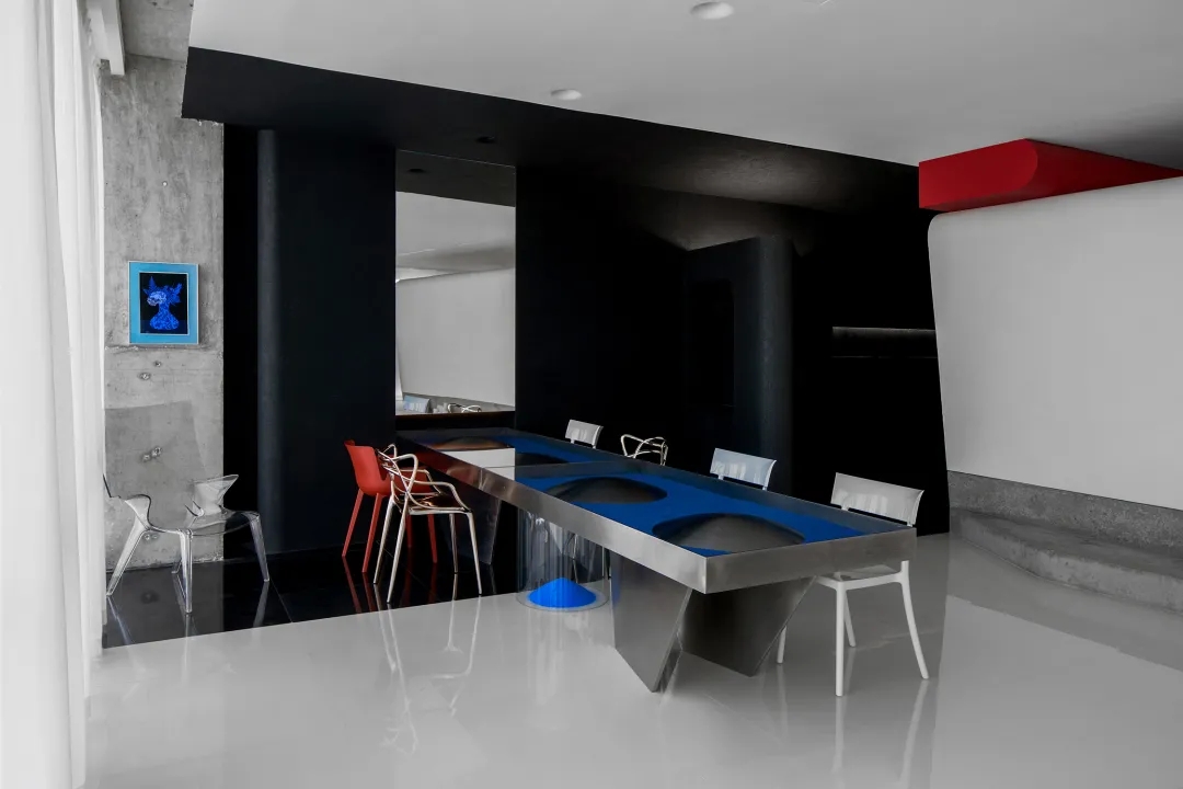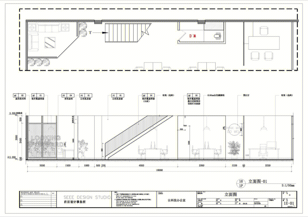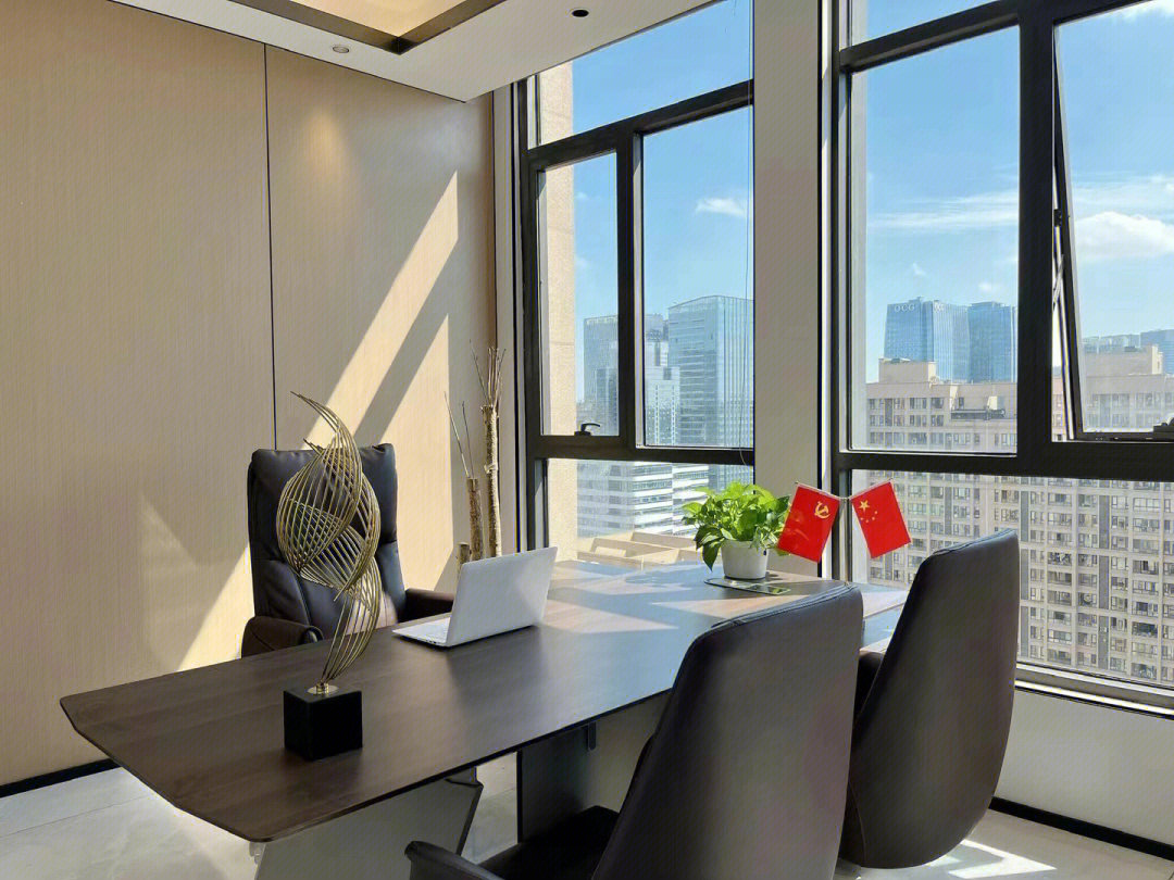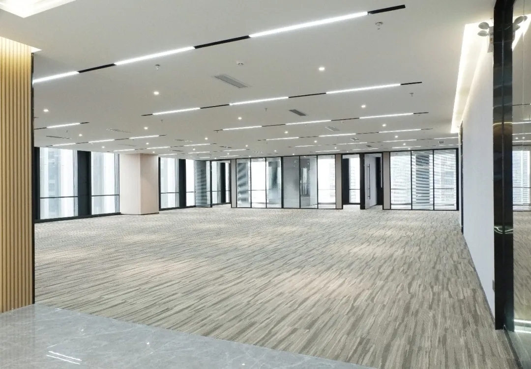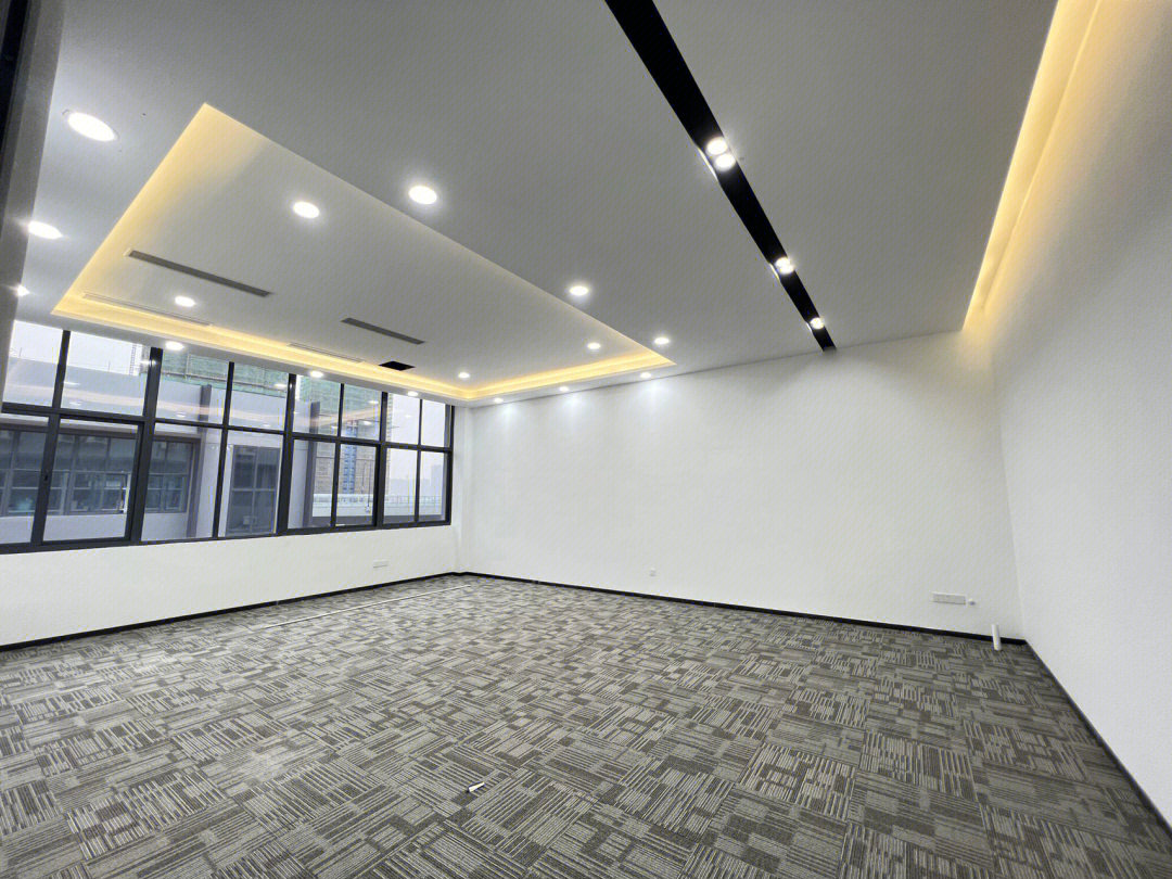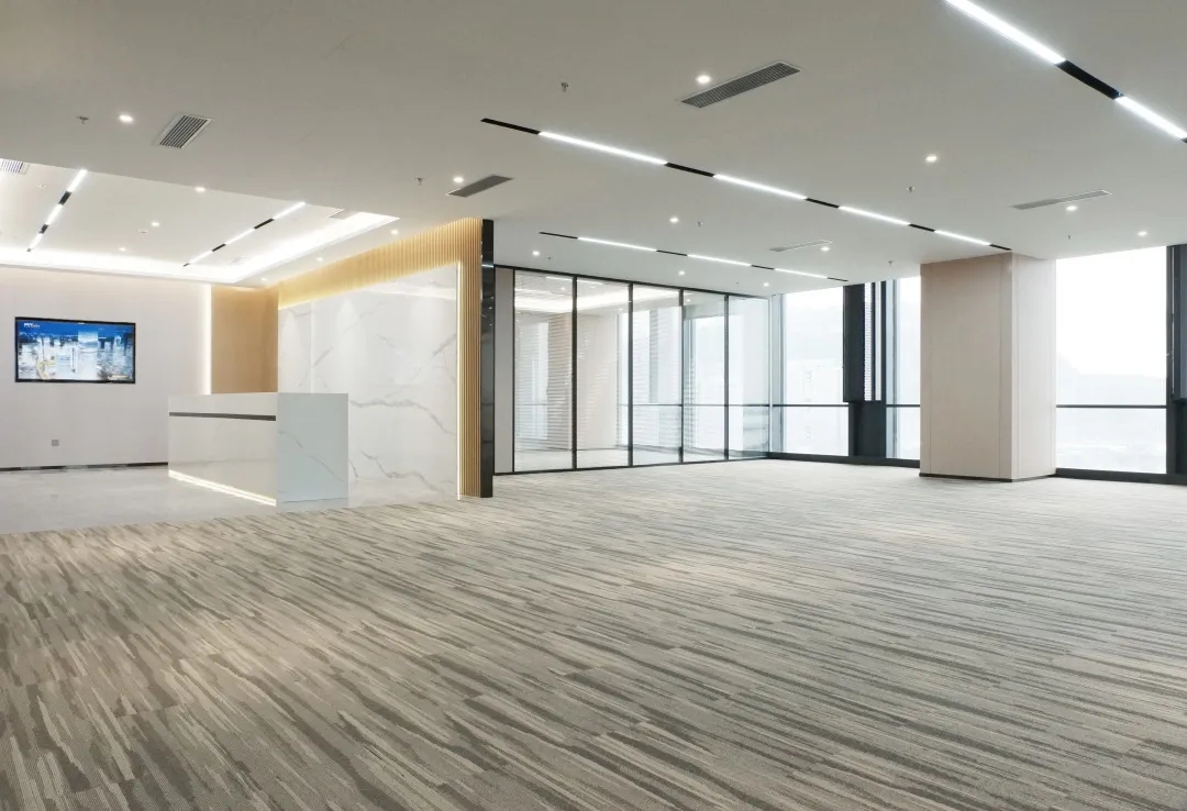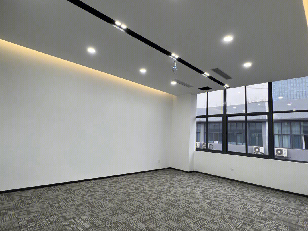 层层递进的空间划分,贯穿整个项目空间。入口处,我们采用了黑色的艺术涂料以及斑驳的金属钢板,黑洞一般地大面积吸收了光,黑色的体块与白色的会客区域形成了一道从地面至顶面的分割线,远处的明亮的落地窗此时更加明亮,如在隧道迈向出口引导步伐。