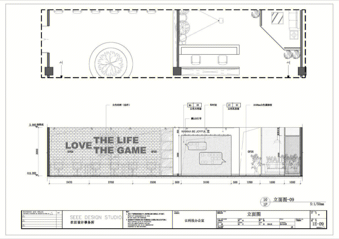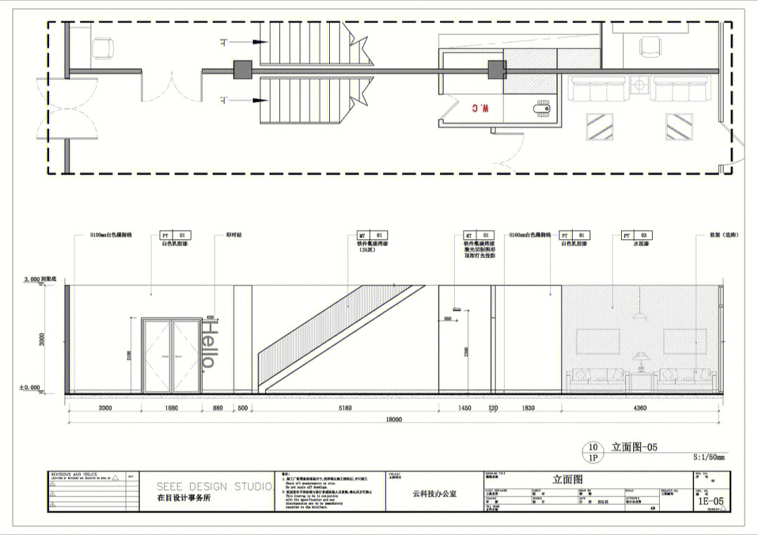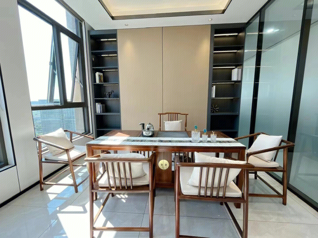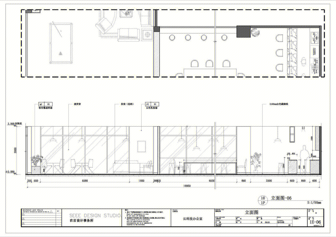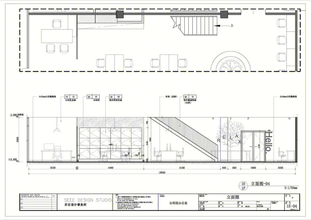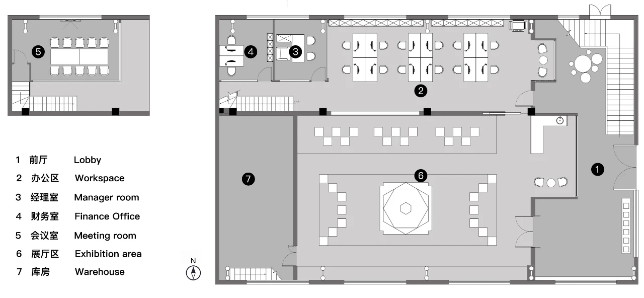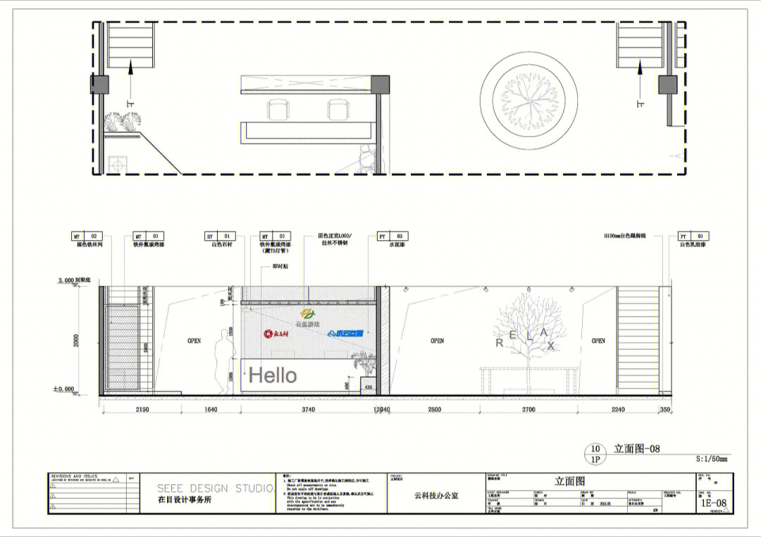 层层递进的空间划分,贯穿整个项目空间。入口处,我们采用了黑色的艺术涂料以及斑驳的金属钢板,黑洞一般地大面积吸收了光,黑色的体块与白色的会客区域形成了一道从地面至顶面的分割线,远处的明亮的落地窗此时更加明亮,如在隧道迈向出口引导步伐。
