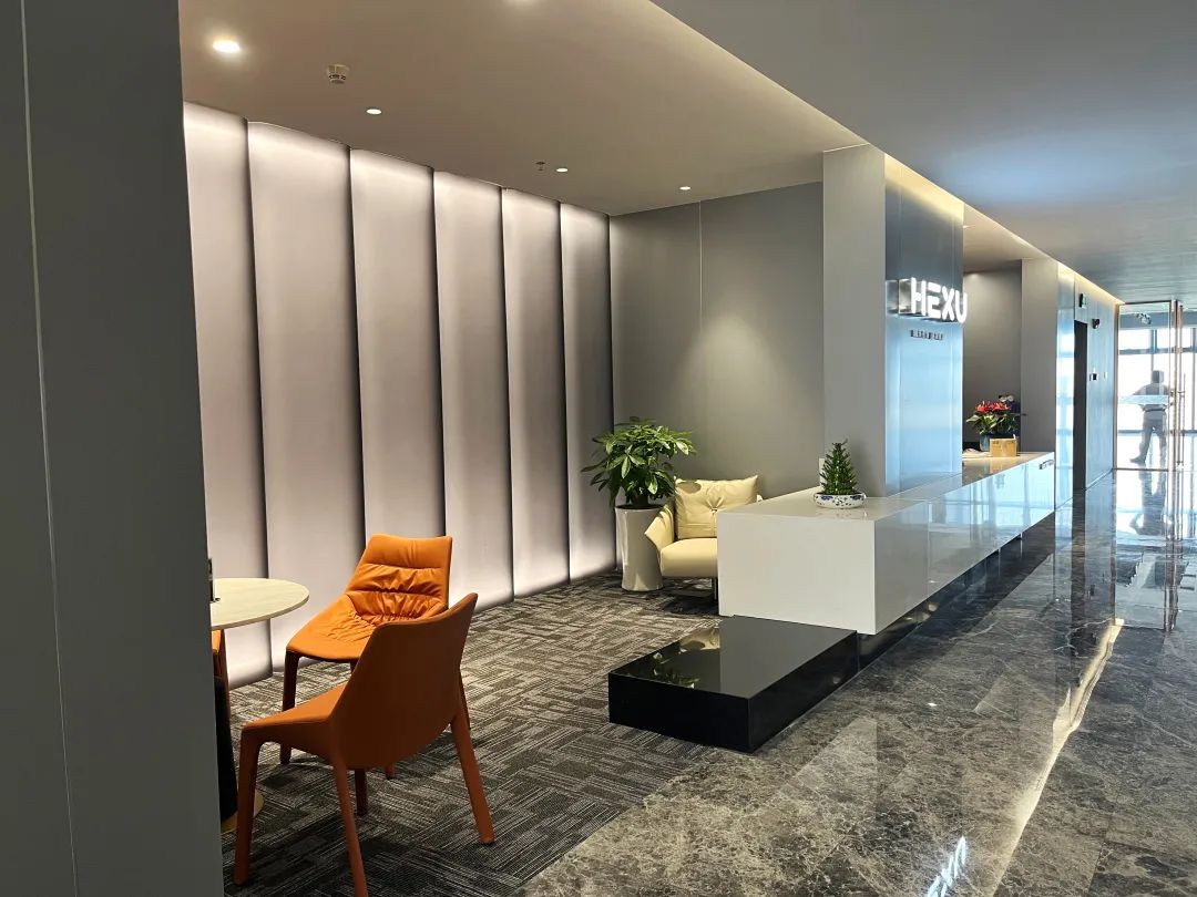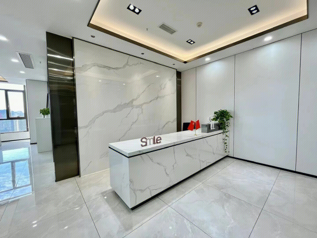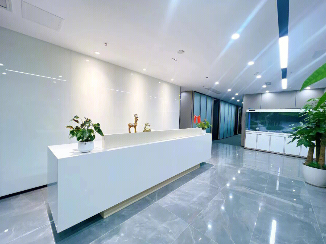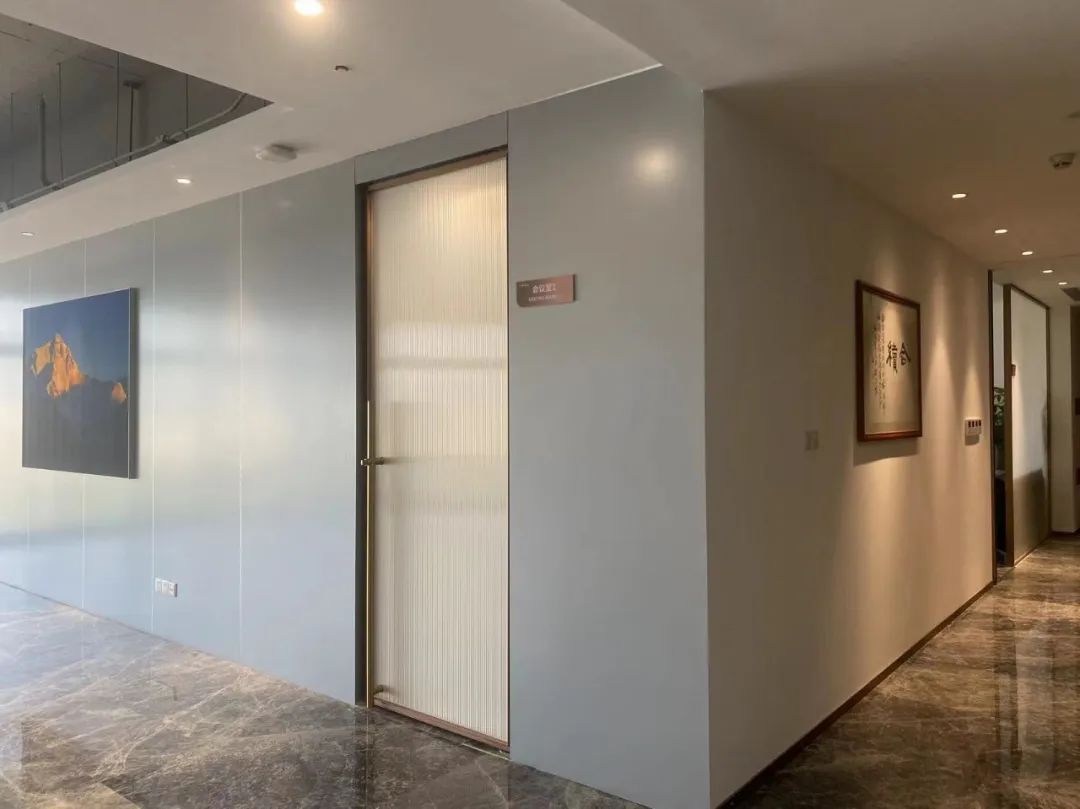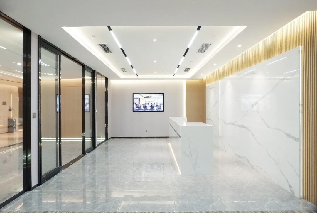 前厅整体色调是白色与银色,线型设计勾勒出空间结构的艺术之美,将原本沉寂的空间变得灵动起来,使前厅充满科技感。细节之处可见品质。前台背景墙底板采用阳极铝板,线性走线结构,配上3D立体Logo,在灯光效果下肌理和质感完美呈现。整体高级大气,也符合公司简约环保的特性。
