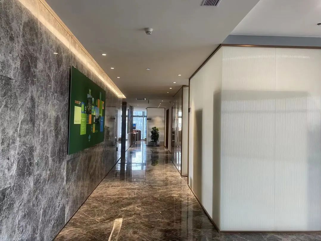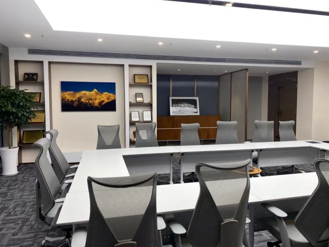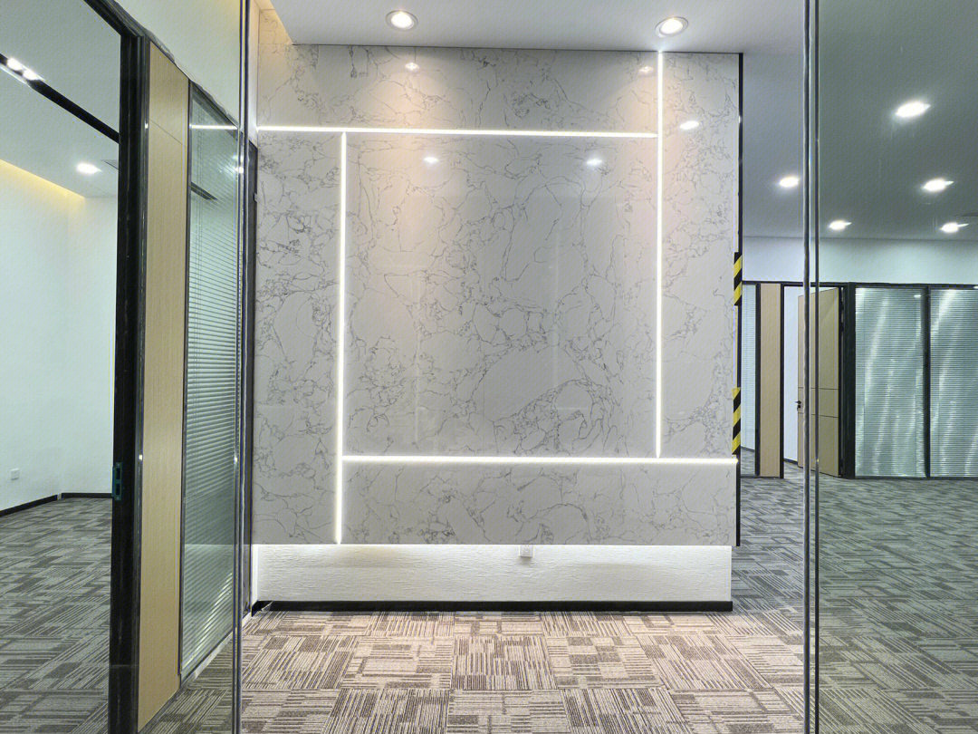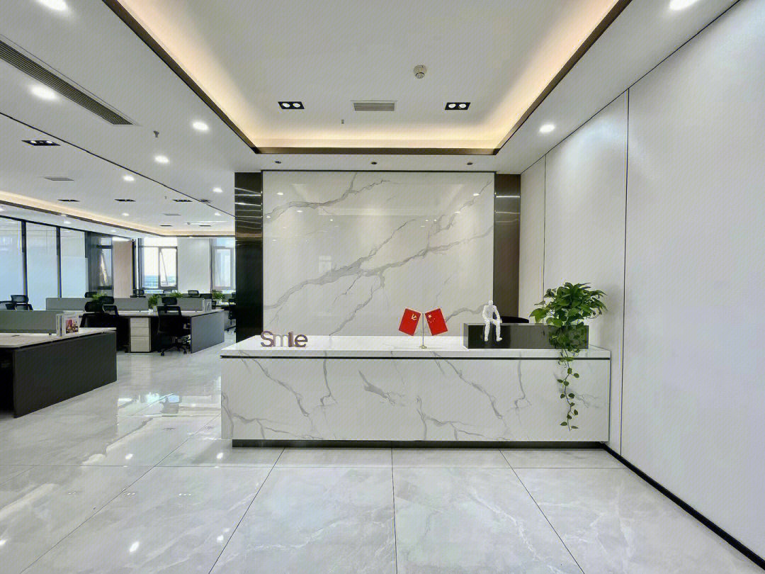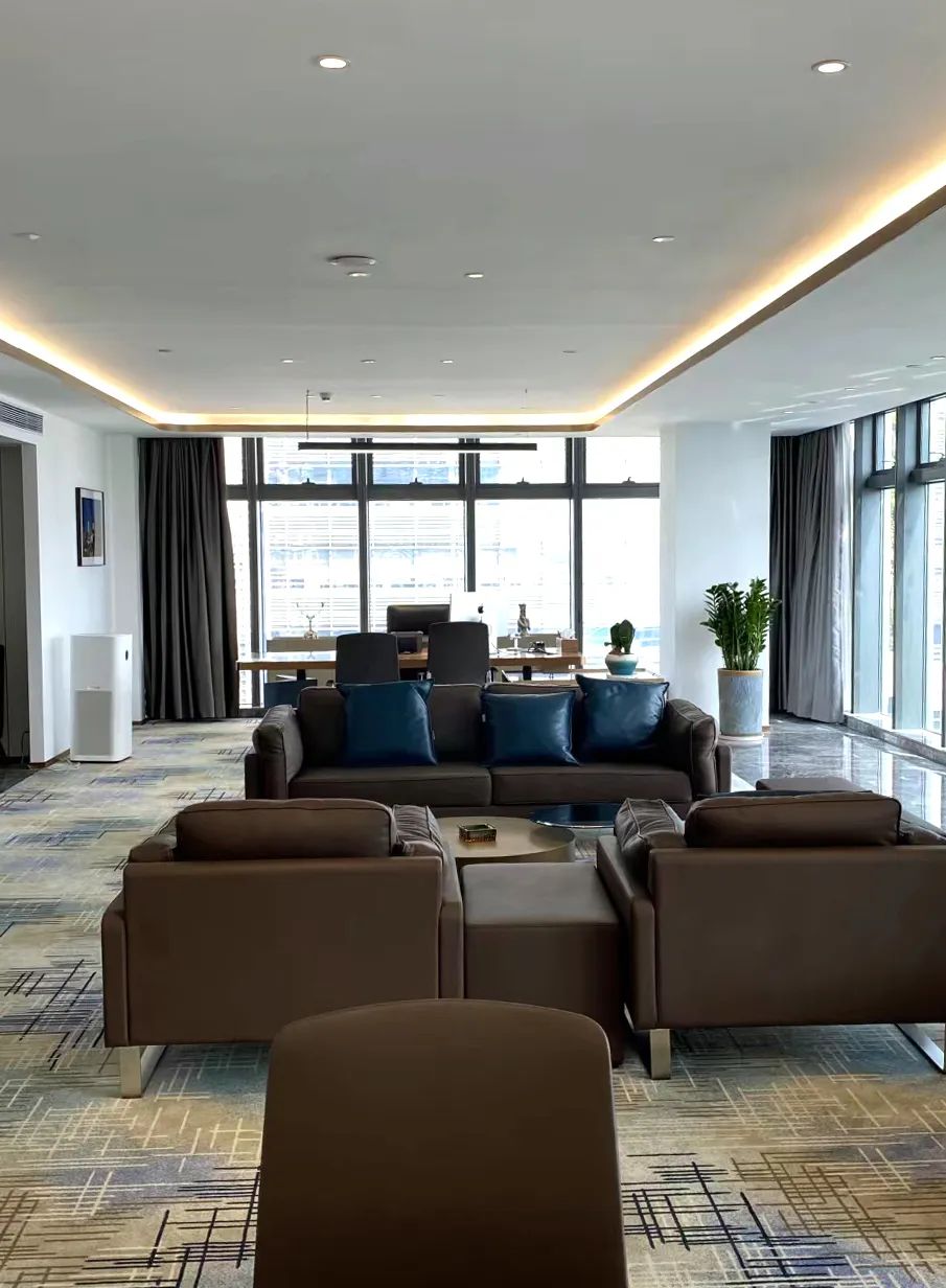 前厅整体色调是白色与银色,线型设计勾勒出空间结构的艺术之美,将原本沉寂的空间变得灵动起来,使前厅充满科技感。细节之处可见品质。前台背景墙底板采用阳极铝板,线性走线结构,配上3D立体Logo,在灯光效果下肌理和质感完美呈现。整体高级大气,也符合公司简约环保的特性。