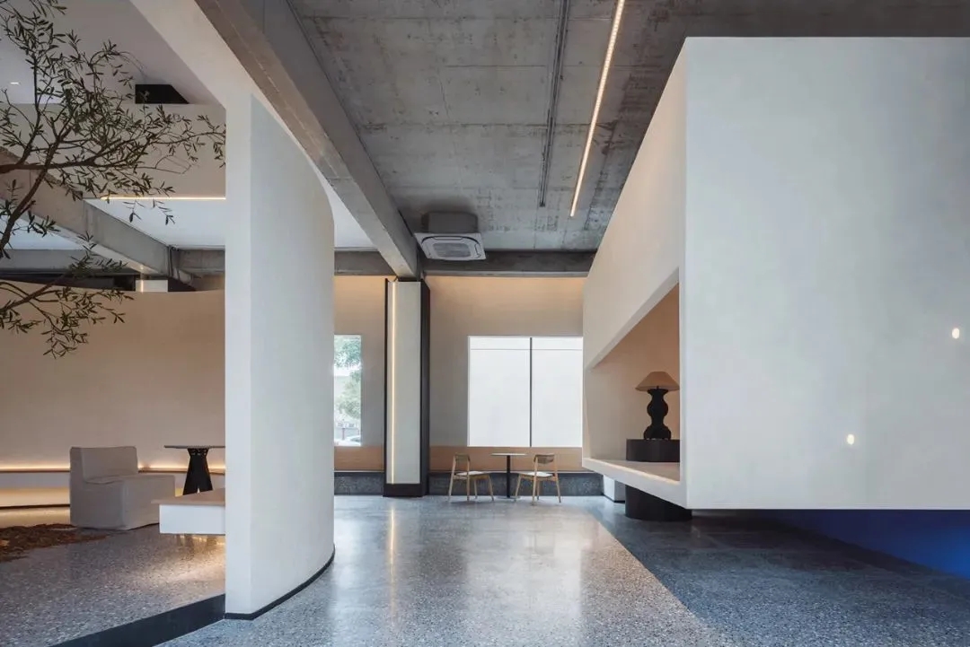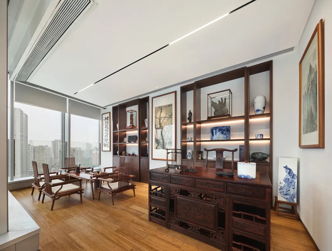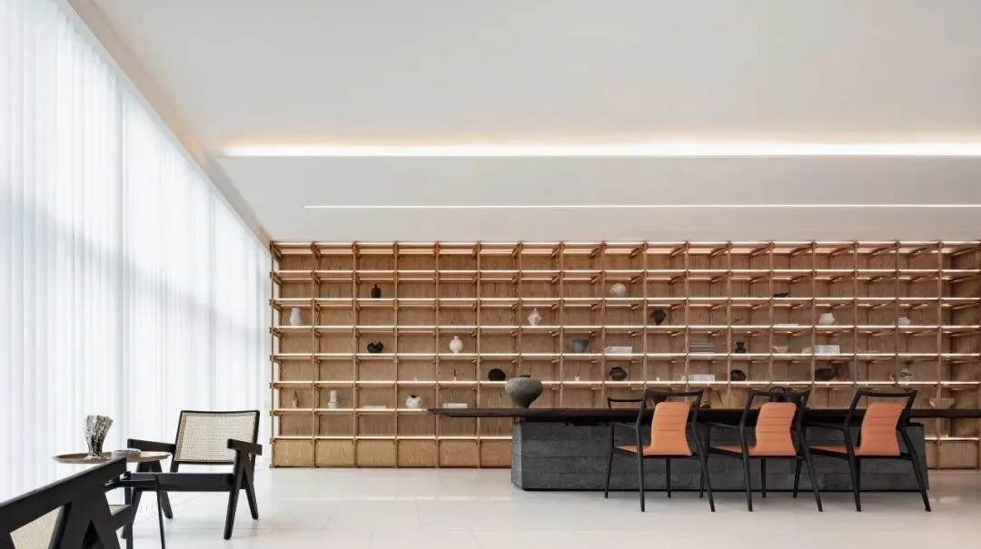 从格栅造景、鸱吻摆件、小松盆栽、枯山水砾石、文房四宝到青花瓷器,整个茶室呈现出禅风习习的古典美学。作为品读、饮茶和交流思想的空间,这里的设计充分表达了“谈笑有鸿儒,往来无白丁”的古韵