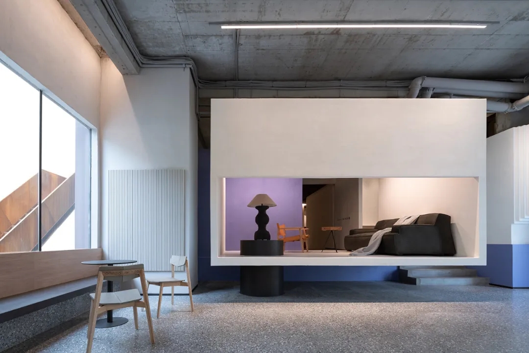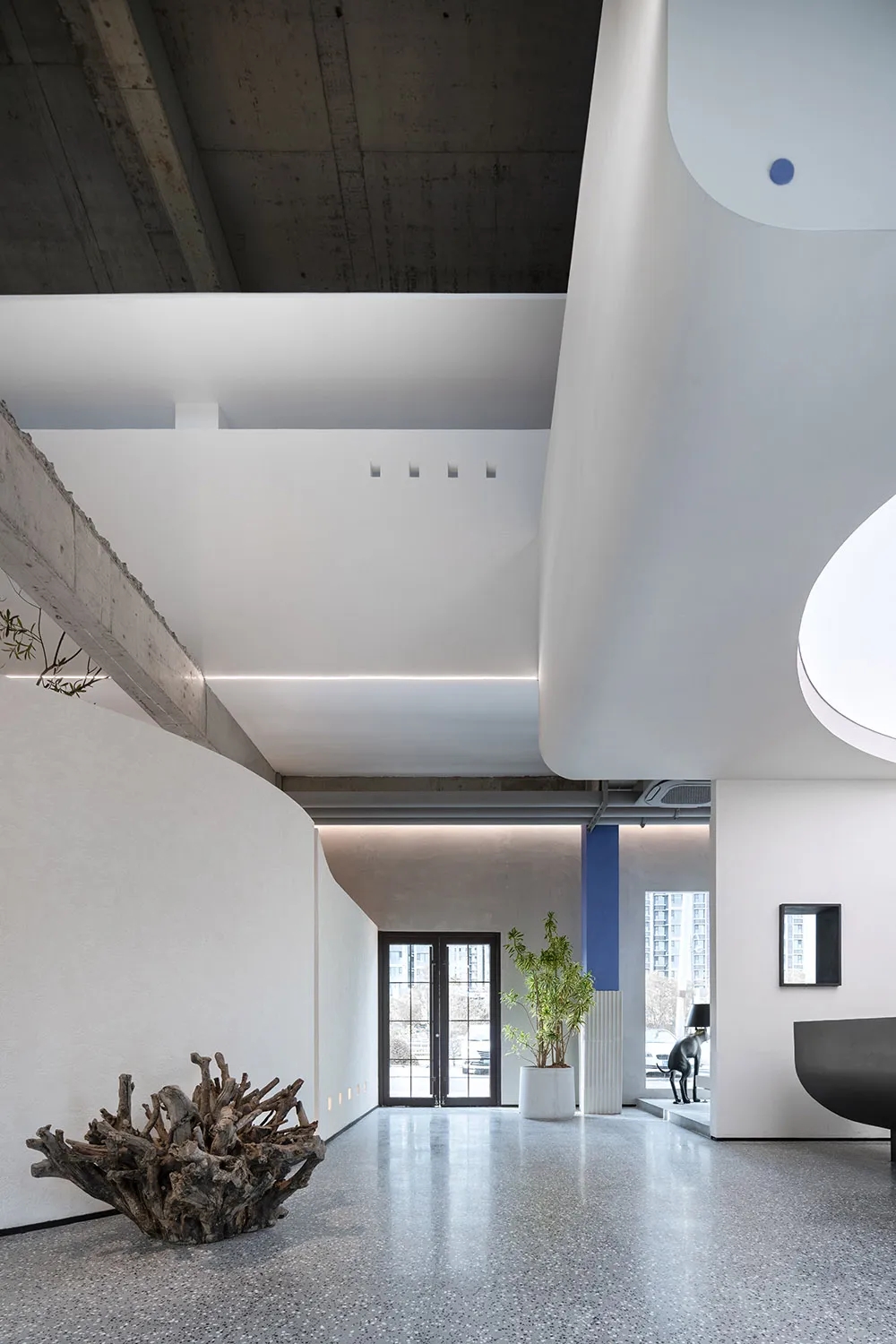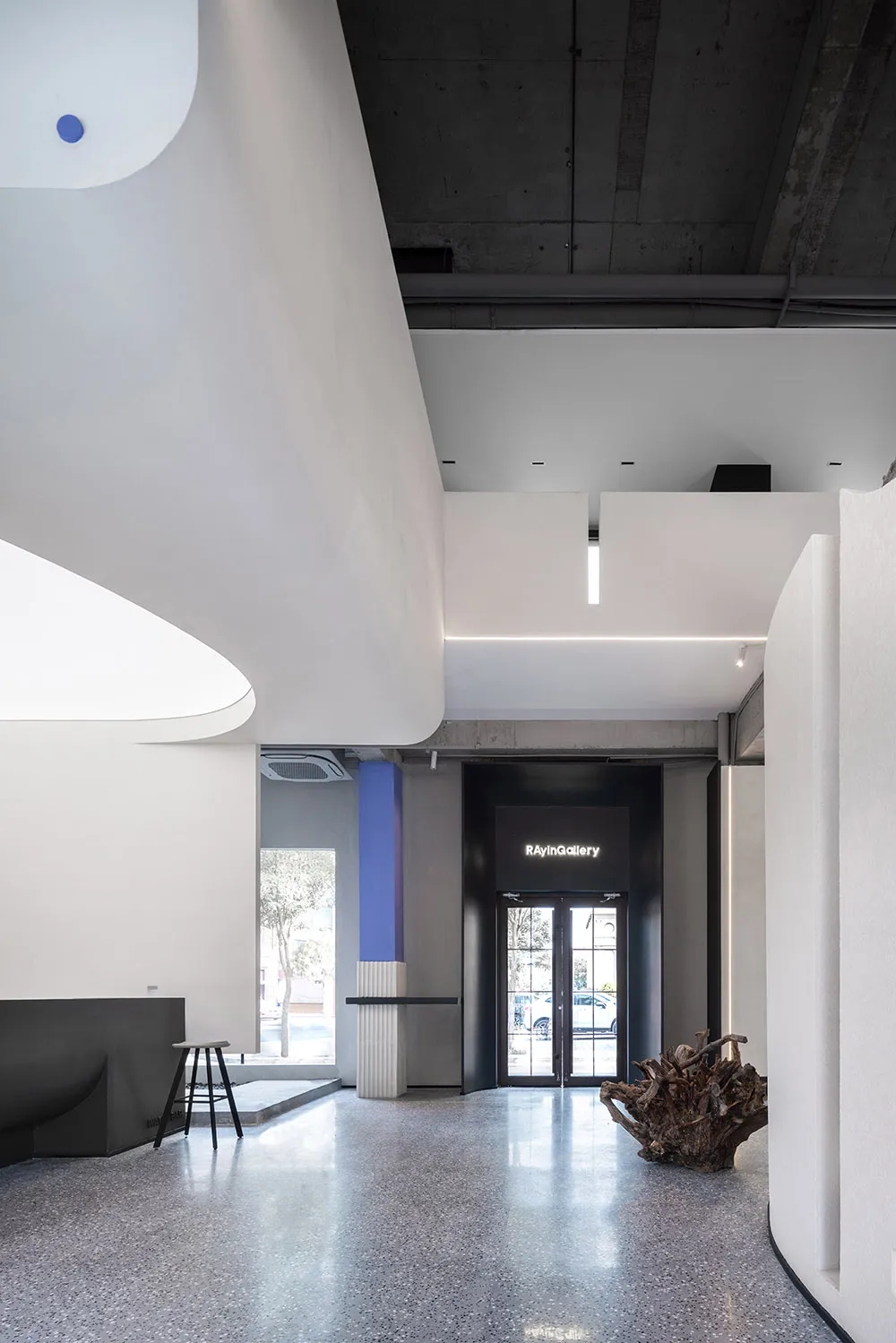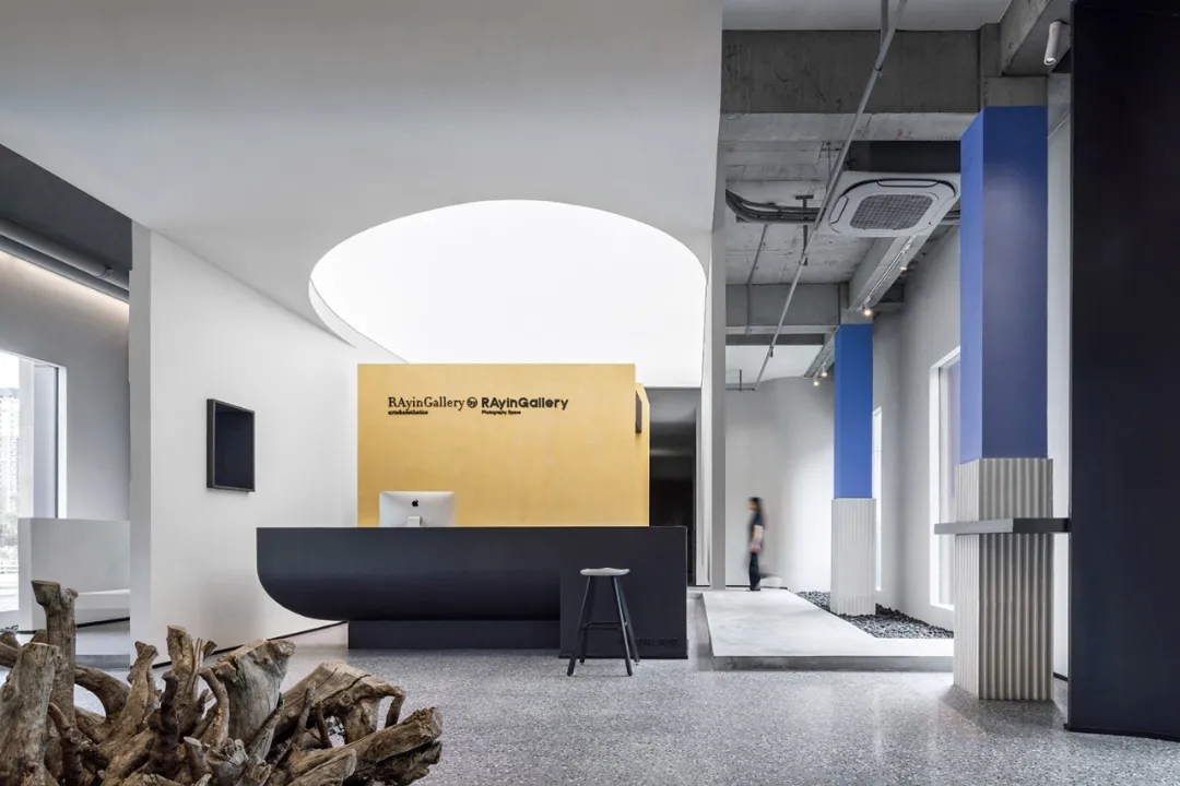 原建筑为一个层高8米的钢结构建筑体,设计从光的三原色——“蓝、红、绿”的概念出发,由这三种不能再分解的基本色彩可以组合成无数其他色彩,以这三种颜色作为不同区域空间的主题色,预示着空间未来更多的变化。