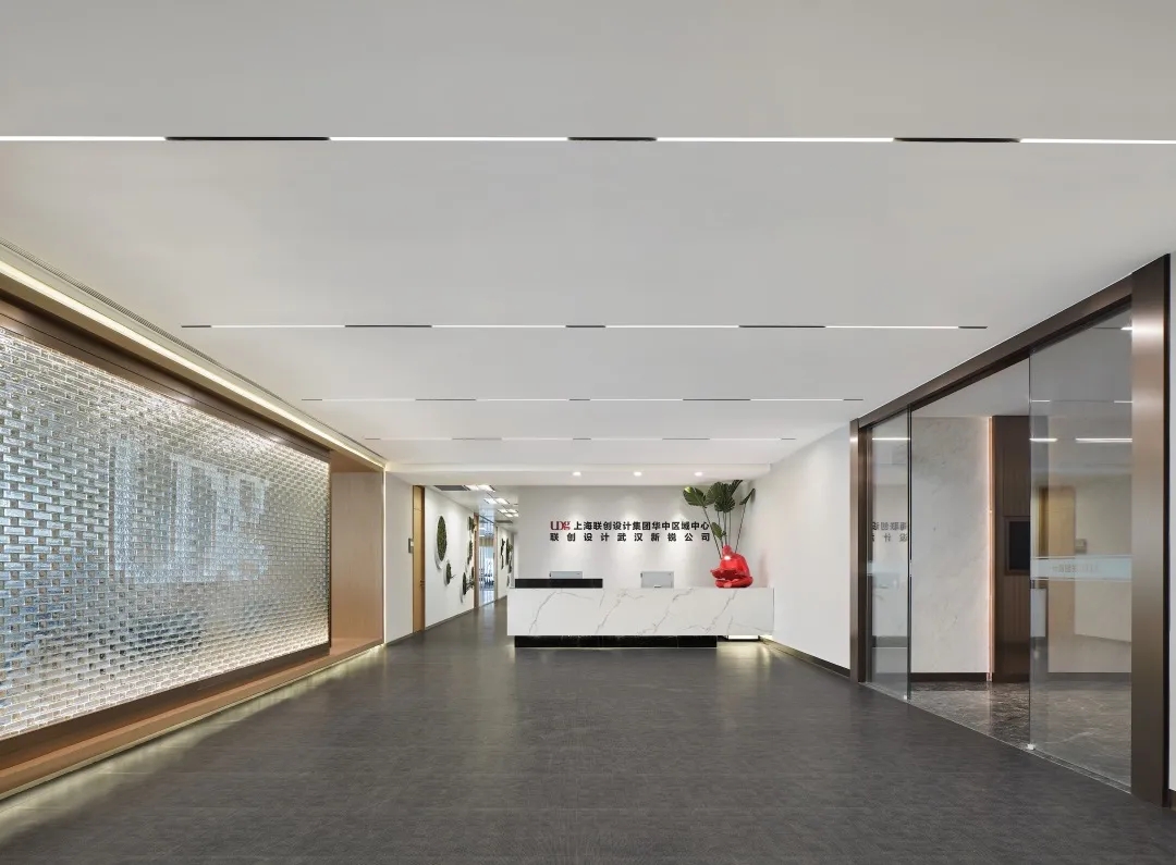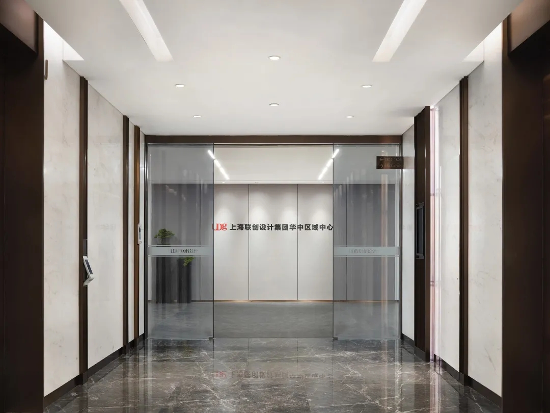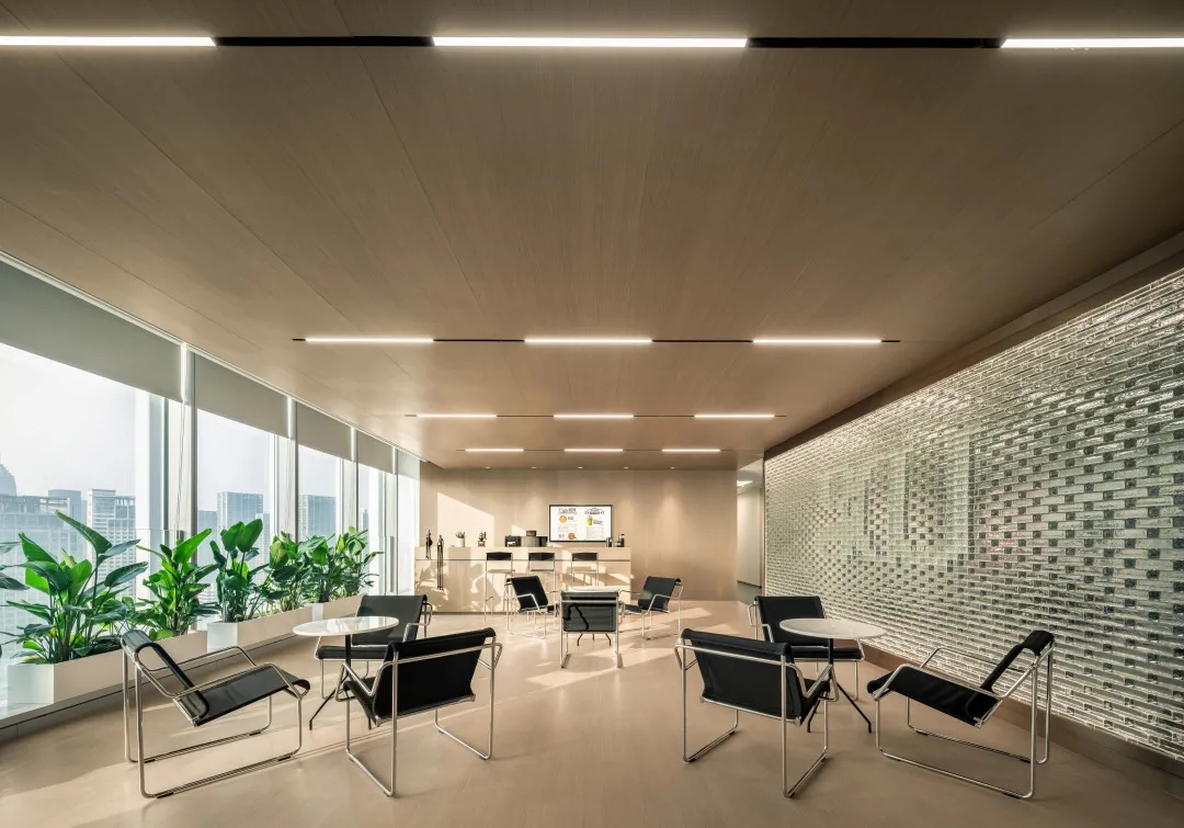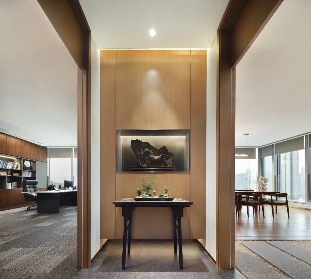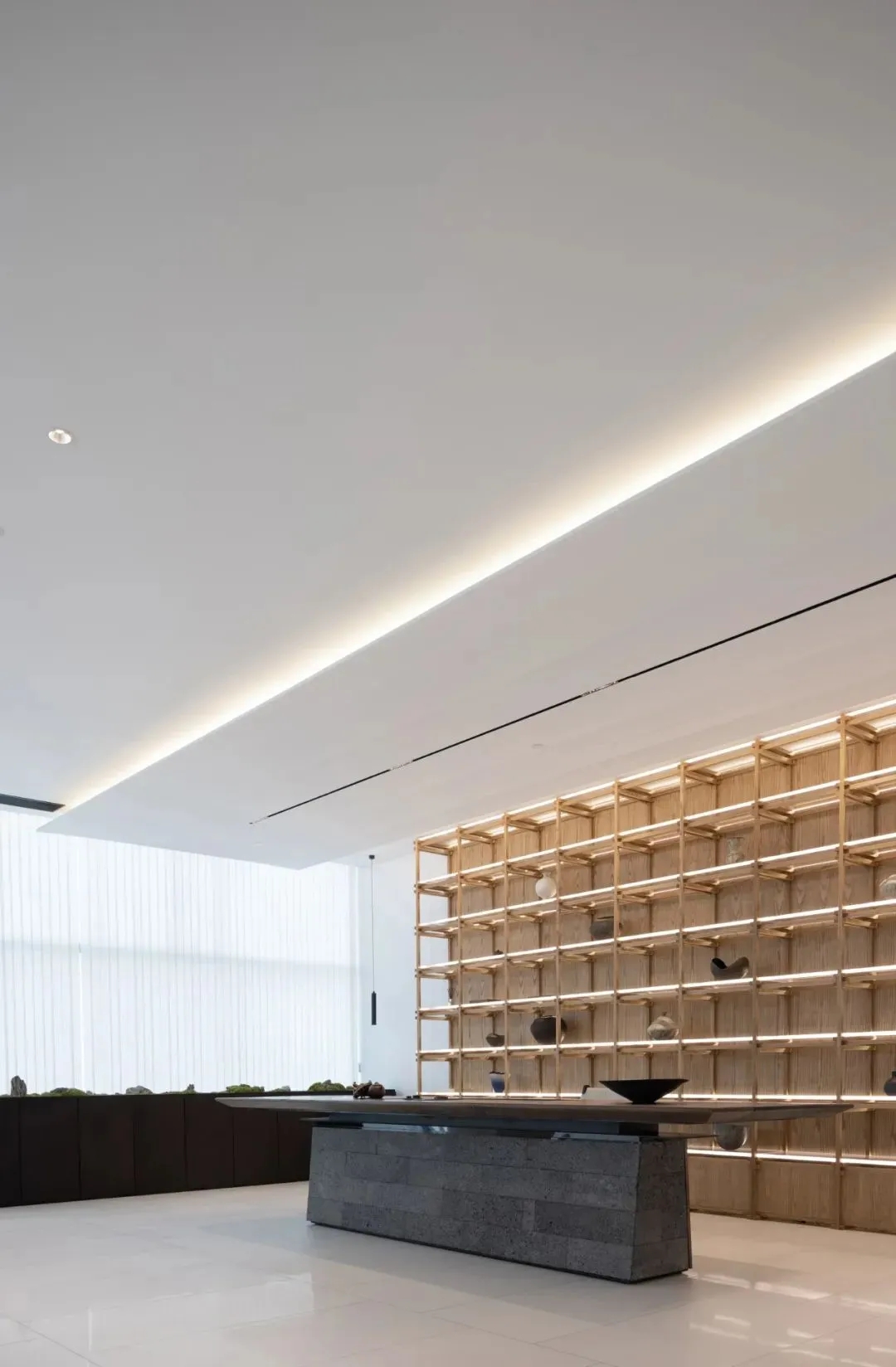洽谈区整体设计为矩形的盒子,与入户门相对,二者对称且均衡,切合中国传统审美中的对称结构。同时,设计采用悬浮的形式,减轻体量感,使其轻盈、灵动。门厅采用大面玻璃砖作为隔断的主材,晶莹剔透且与木色结合,稳重且温暖。