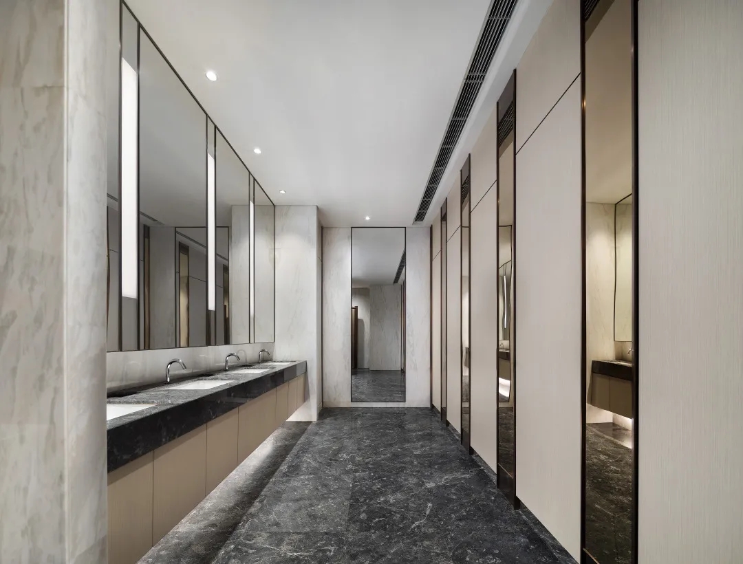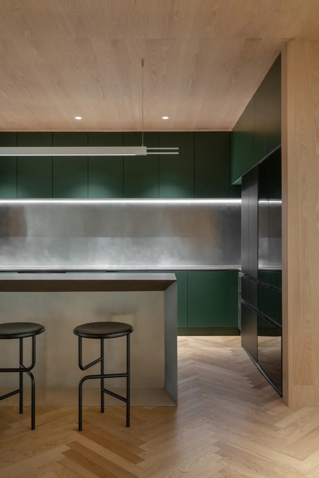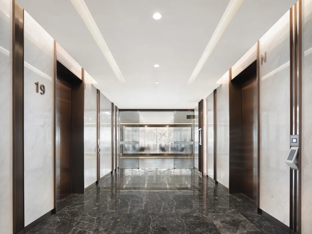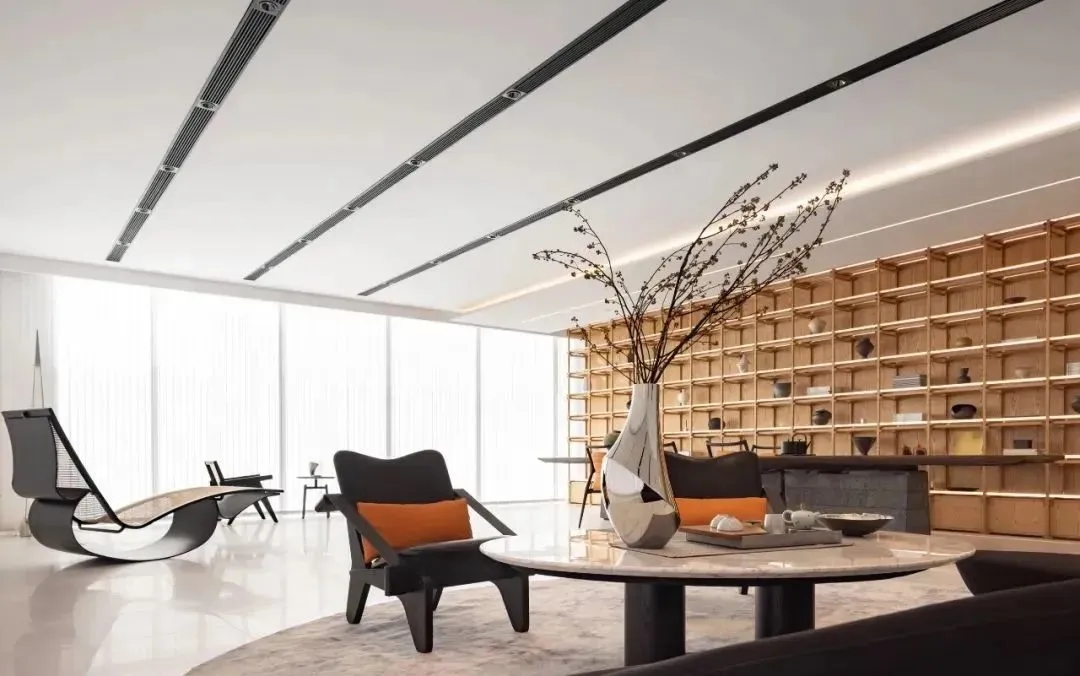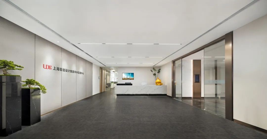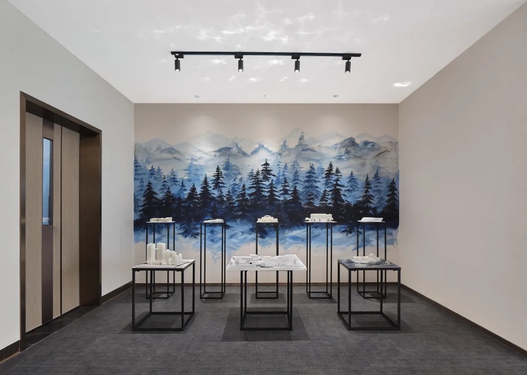 洽谈区整体设计为矩形的盒子,与入户门相对,二者对称且均衡,切合中国传统审美中的对称结构。同时,设计采用悬浮的形式,减轻体量感,使其轻盈、灵动。门厅采用大面玻璃砖作为隔断的主材,晶莹剔透且与木色结合,稳重且温暖。