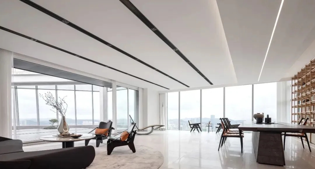 木纹的与大面积“纯白”的碰撞,几何软装的点缀,彰显空间古典又优雅的氛围。落地窗引入自然光,让空间更加轻盈透亮。